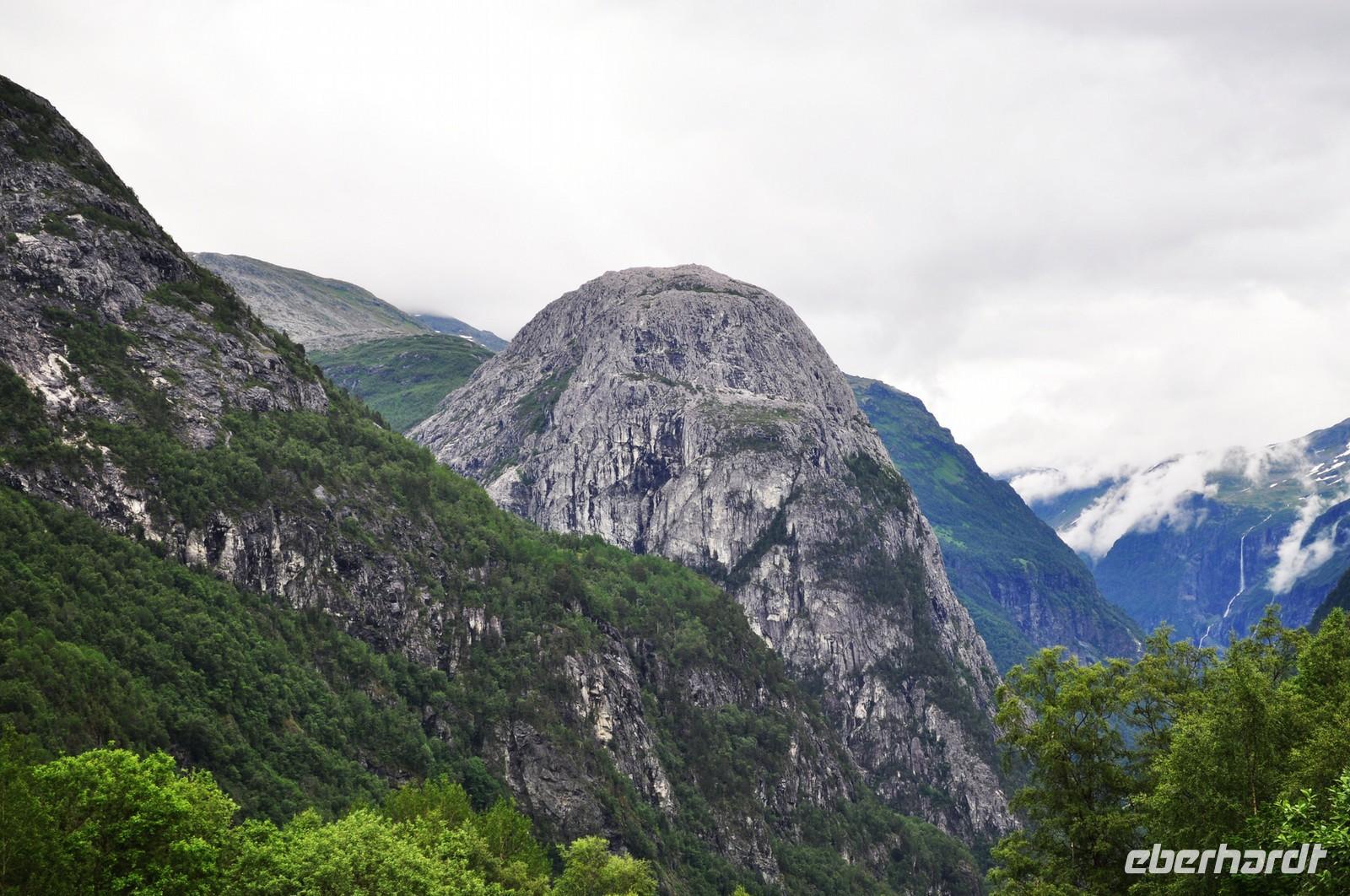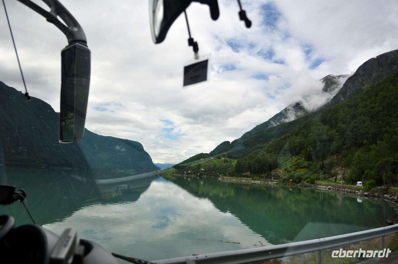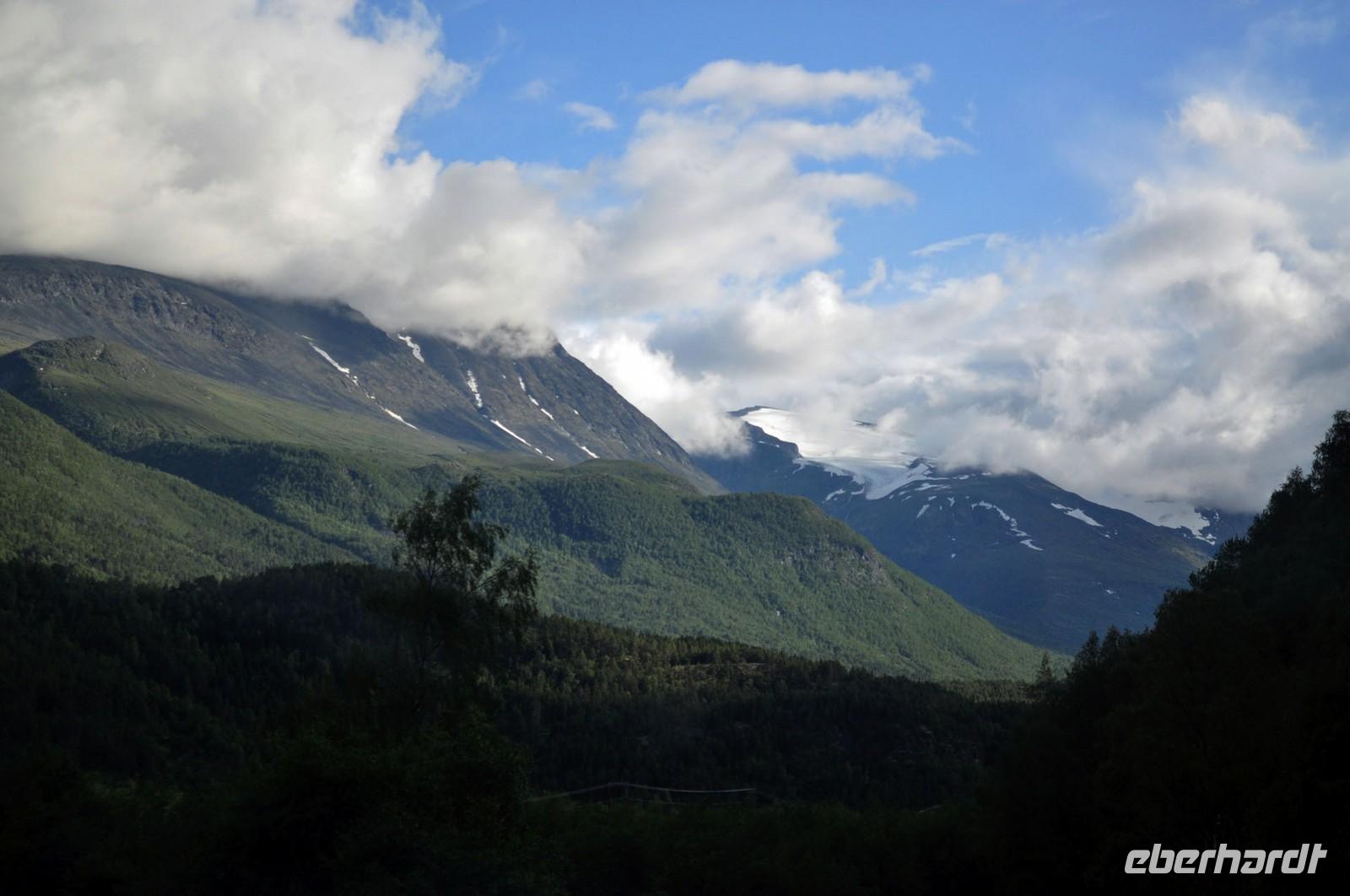 Viele Gipfel und auch der Gletscher sind gut von der Strasse aus zu sehen. Dieser Gletscher ist auch verantwortlich für die Entstehung des längsten und tiefsten Fjords Norwegens dem Sognefjord mit seinen vielen Nebenarmen wie dem Lustrafjord, Aurlandsfjord und dem Nærøyfjord um nur einige Beispiele zu nennen. Die längste Strecke von der verstecktesten Ecke bis zur Mündung beträgt 204 km, an der tiefsten Stelle ist er 1.308m tief und somit um ein vielfaches tiefer als die eigentliche Nordsee (durchschnittlich 94m tief, tiefste Stelle 725m). Die vom Meer weitentfernteste Stelle passieren wir auf der Rv 55 bei Skjolden (Lustrafjord) auf unserem Weg nach Kaupanger.
