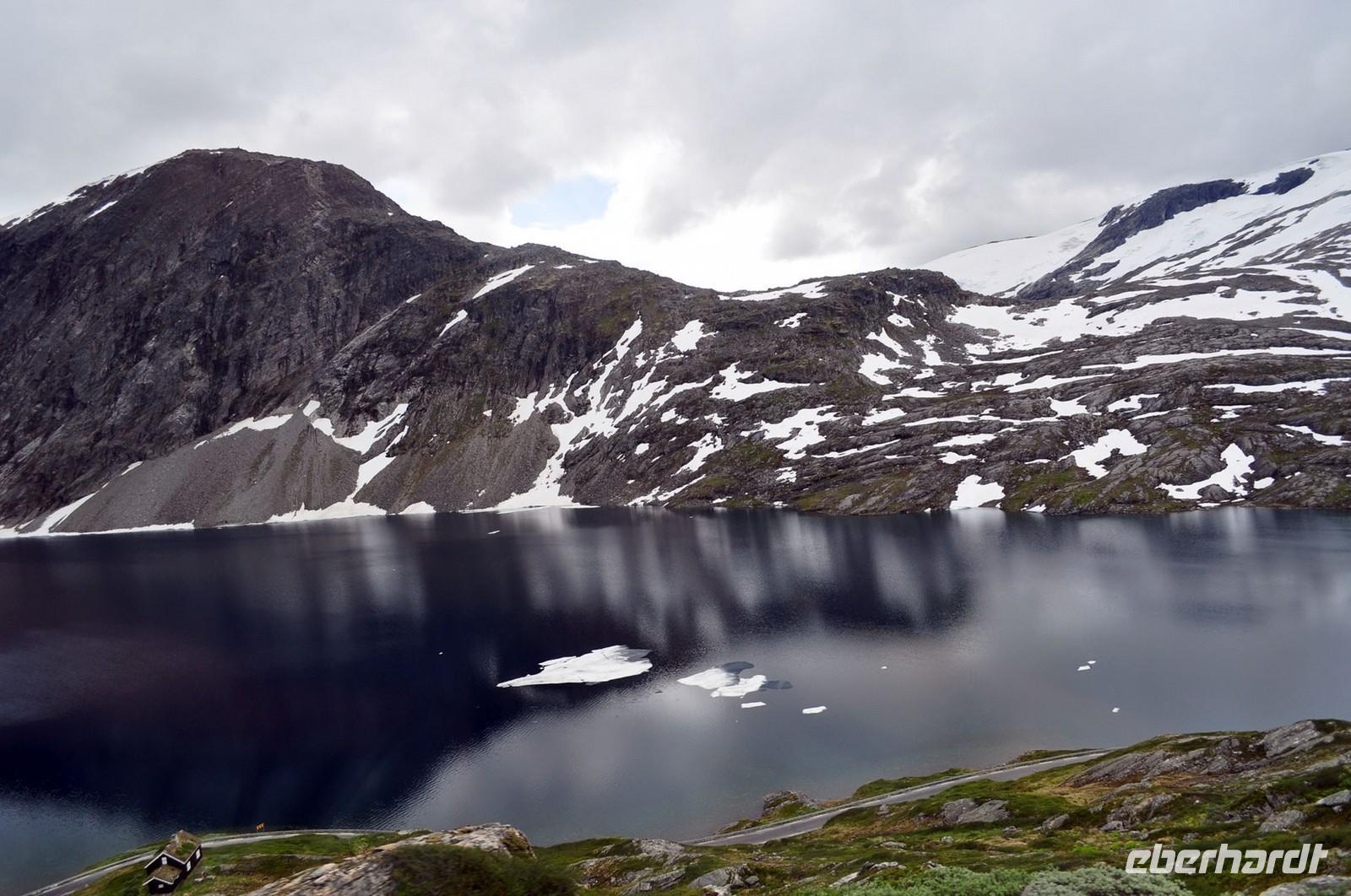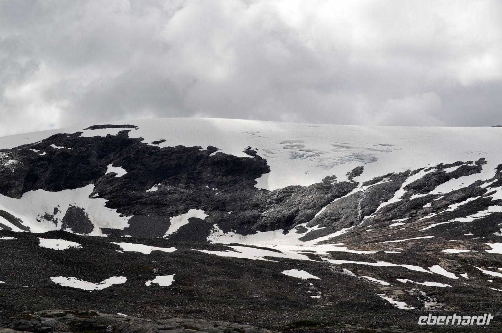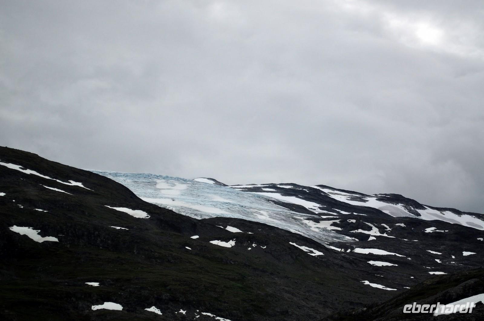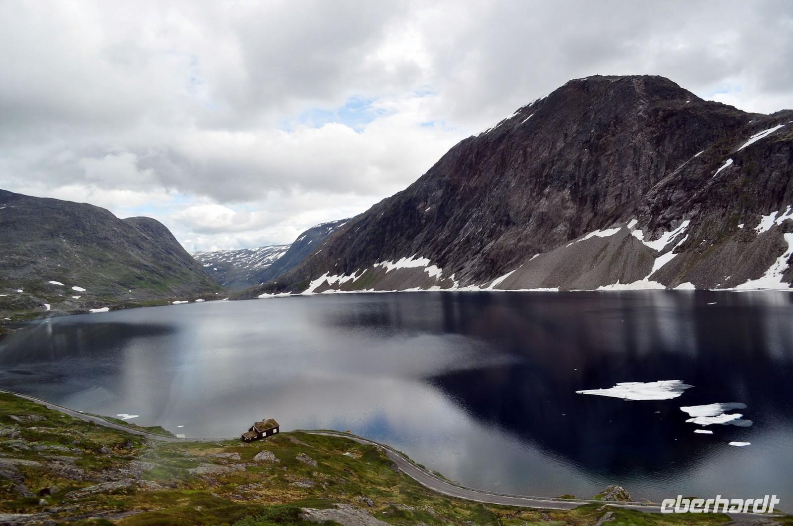Viele Gipfel und auch der Gletscher sind gut von der Strasse aus zu sehen. Dieser Gletscher ist auch verantwortlich für die Entstehung des längsten und tiefsten Fjords Norwegens dem Sognefjord mit seinen vielen Nebenarmen wie dem Lustrafjord, Aurlandsfjord und dem Nærøyfjord um nur einige Beispiele zu nennen. Die längste Strecke von der verstecktesten Ecke bis zur Mündung beträgt 204 km, an der tiefsten Stelle ist er 1.308m tief und somit um ein vielfaches tiefer als die eigentliche Nordsee (durchschnittlich 94m tief, tiefste Stelle 725m). Die vom Meer weitentfernteste Stelle passieren wir auf der Rv 55 bei Skjolden (Lustrafjord) auf unserem Weg nach Kaupanger.