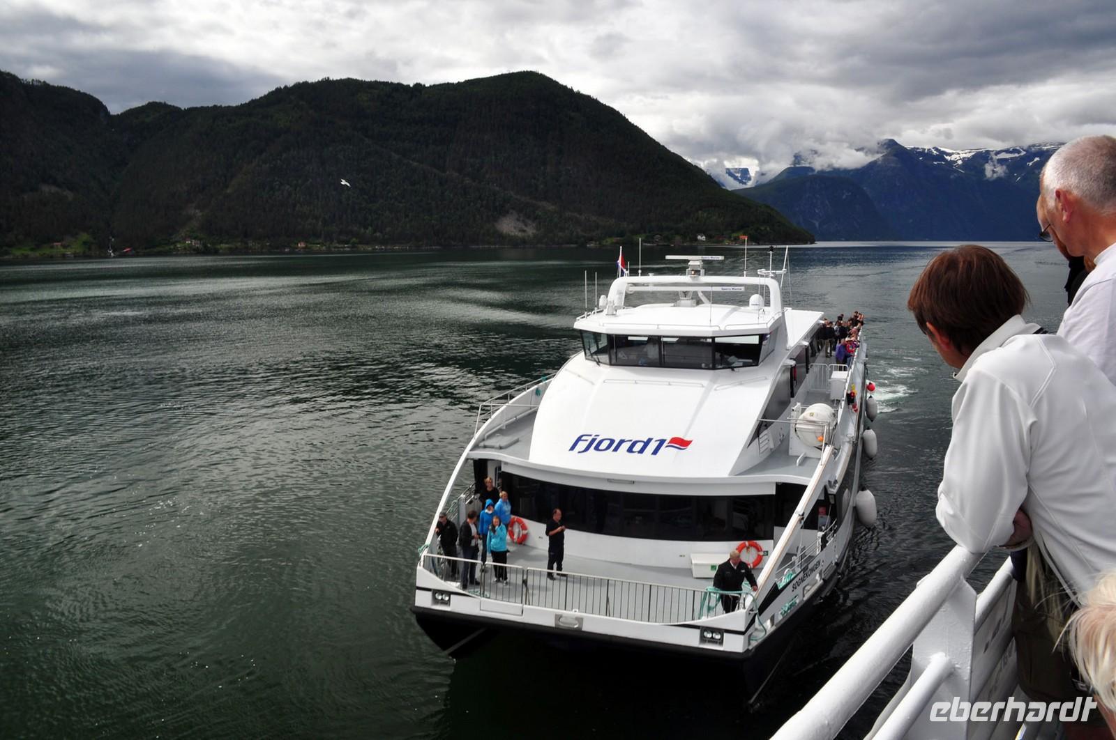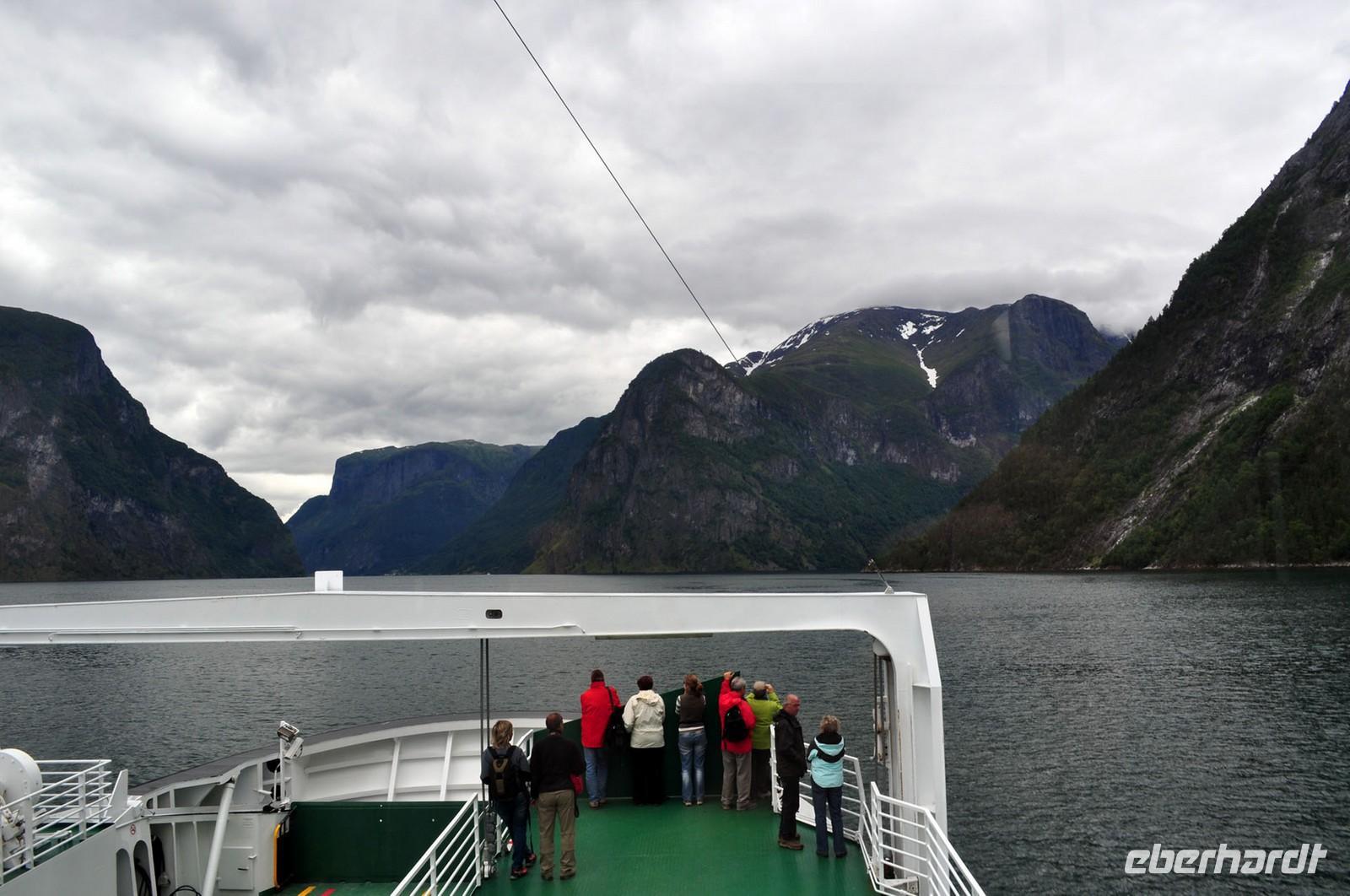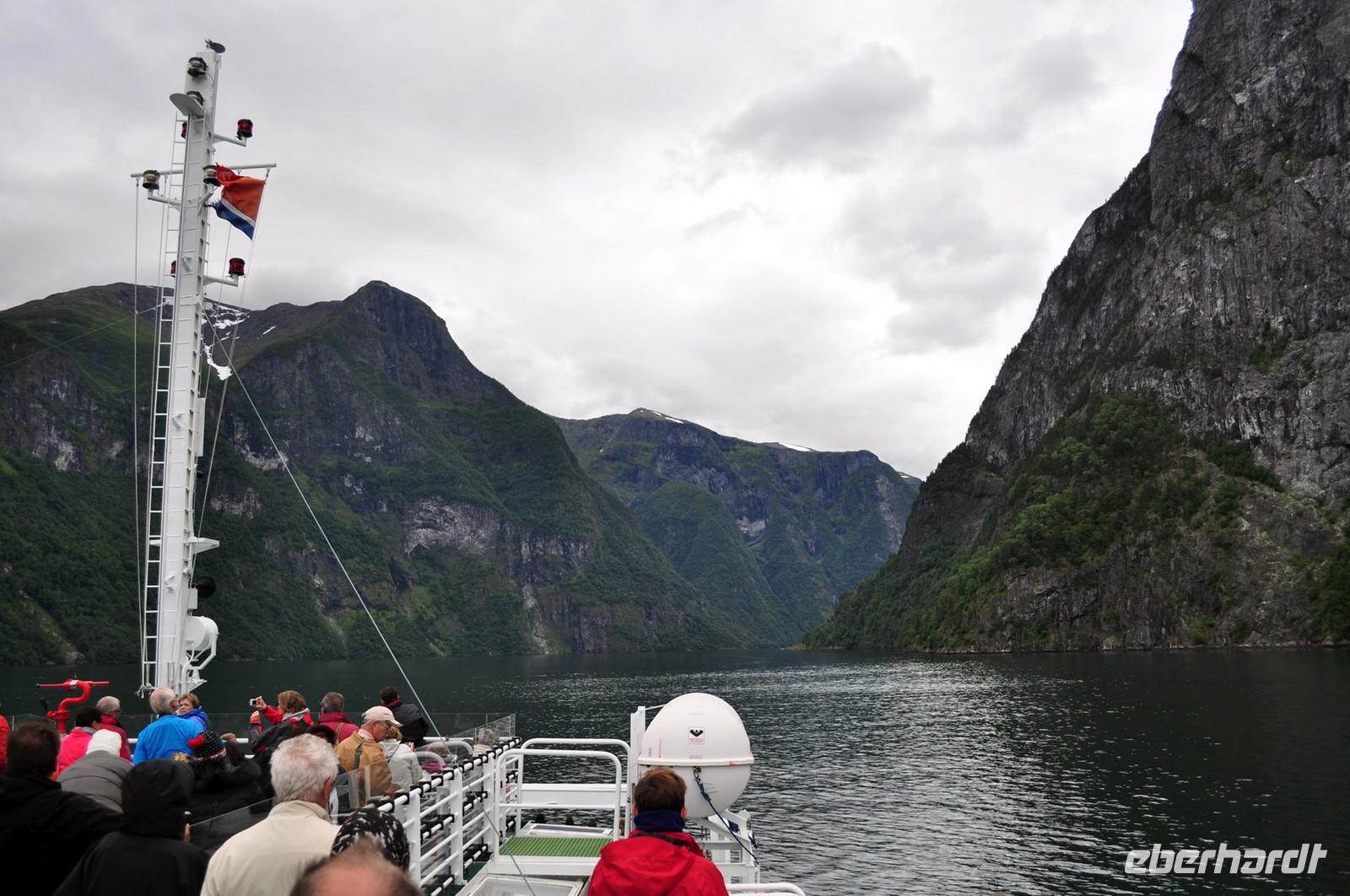 In Kaupanger nutzen wir das Schiff um eine mehrstündige Kreuzfahrt durch die berühmtesten Ecken des Fjords zu unternehmen. Unser Weg führt uns vorbei an spektakulären Wasserfällen, durch den Aurlandsfjord (bekannt durch die berühmte Flåmbahn) (erlebbar bei einer anderen Eberhardt Norwegen Reise). bis nach Gudvangen am Ende des Nærøyfjord.