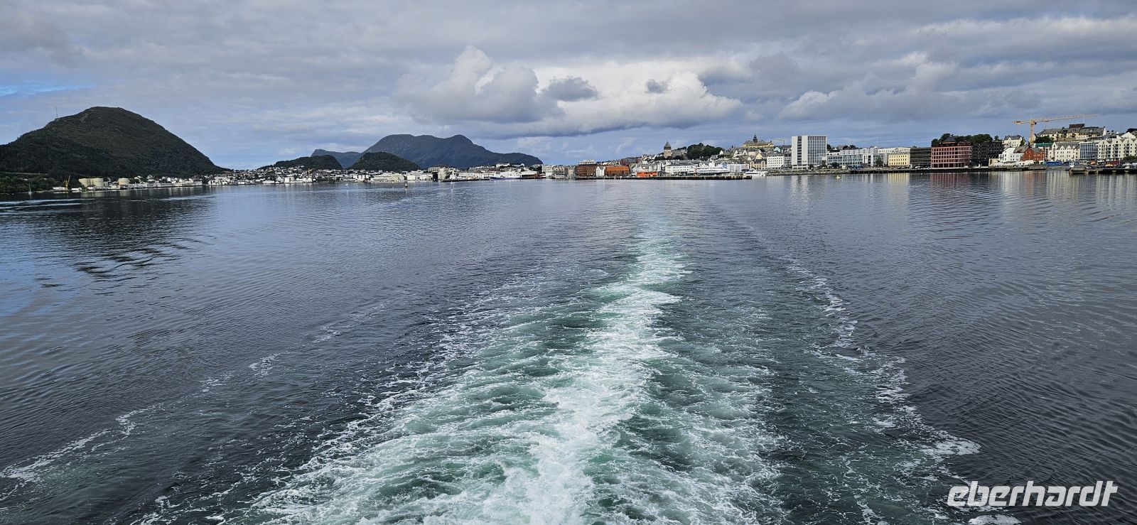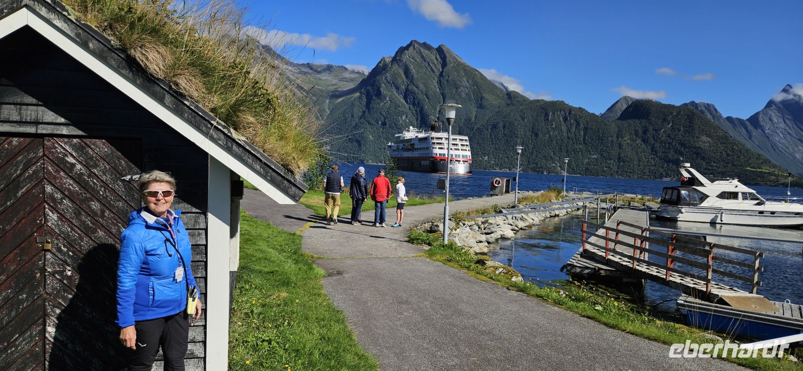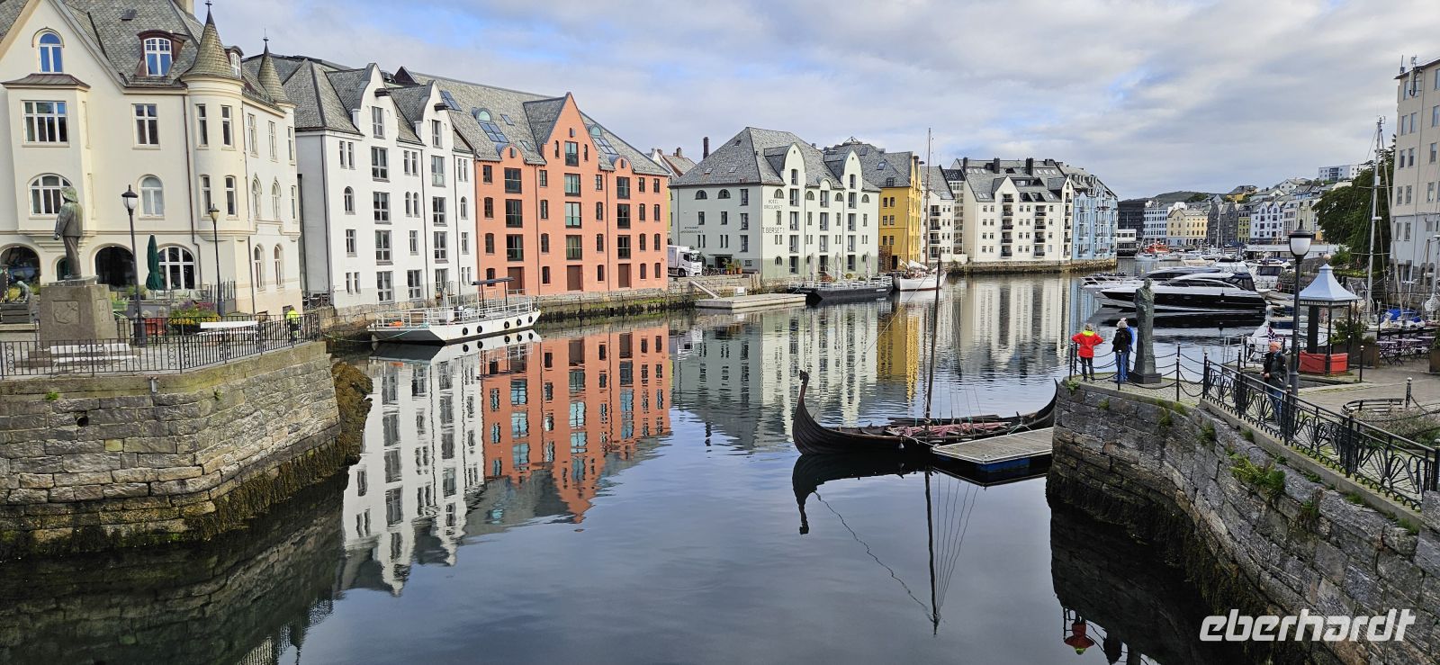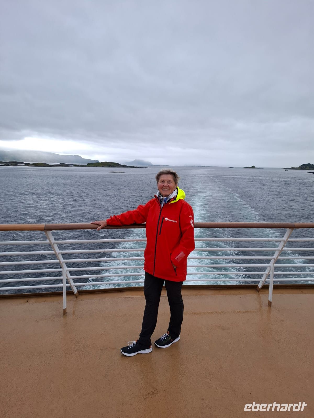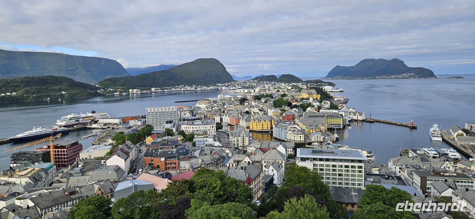 Ganz pünktlich 8 Uhr legte MS Trollfjord in Alesund im Kreuzfahrt Hafen an und sogleich begannen wir zu fünft unseren Stadtspaziergang. Vorbei am Rathaus und der Post gingen wir über die Königsstrasse bis zur Skulptur des Zeitungsjungen. Dort beginnen die Treppen in Richtung Park unterhalb der Aksla. Im Park fanden die grosse Araukarie, das Denkmal vom Wikinger Rollo und das Denkmal für Kaiser Wilhelm unsere Aufmerksamkeit. Dann nahmen wir die Treppen in Angriff und stiegen hinauf bis zur 220., wo sich der tolle Aussichtsbalkon befindet. Das alle hielten wir in vielen Fotos fest und die Sonne sorgte für die richtige Beleuchtung. Wieder unten im Zentrum spazierten wir am Sund entlang und über die Brücke hinüber ins Jugendstilzentrum. Bei den Skulpturen des Fischers und der Fischfrau machten wir natürlich Halt und nach einer kleinen Runde vorbei an wunderschönen Jugendstilhäusern kehrten wir aufs Schiff zurück. Ein Grossteil unserer Gruppe ging in Alesund von Bord und nahm an einer wunderschönen Bustour über die Berge, vorbei an Fjorden mit Endpunkt Urke teil. Dort kamen sie per Fähre an und mit dem Tenderboot wieder zu uns an Bord. Man konnte sich auch einer Führung durch das Jugendstilzentrum in Alesund anschließen. Nach dem Ablegen begann eine unvergessliche Strecke bei Sonnenschein hinein in den Hjodurfjorden. Von 12.30 bis 16.30 Uhr ankerte unser Schiff vor Saebo und an Land wurden wir mit Tenderbooten gebracht. In Saebo waren einige Geschäfte und Cafes geöffnet und 14 Uhr hatte man eigens für die Gäste der MS Trollfjord in der Kirche ein Konzert organisiert. Mit Geige und Schifferklavier spielten für uns zwei fantastische Musiker norwegische Volks Musik und norwegische Klassik. Es war ein unvergessliches Erlebnis. Eine Gruppe von Wanderern erkundete die Gegend um Urke zu Fuss und die Gäste der Bustour waren ebenfalls total begeistert. Die Sonne verwöhnte uns bis zum Untergang und machte unseren letzten Tag auf dem Schiff unvergesslich. Das Abschiedsabendessen schmeckte wie alle anderen Essen wieder grandios und 20.30 Uhr sahen wir endlich auch mal unsere Kapitänin im Kreise der Offiziere und leitenden Angestellten. Wir stiessen auf die gelungene Reise an und erfuhren, dass wir mit dem Schiff 5817 km unterwegs waren. Ein fantastischer Sonnenuntergang auf Deck 9 beschloss den erlebnisreichen Tag und auch unsere Kreuzfahrt.