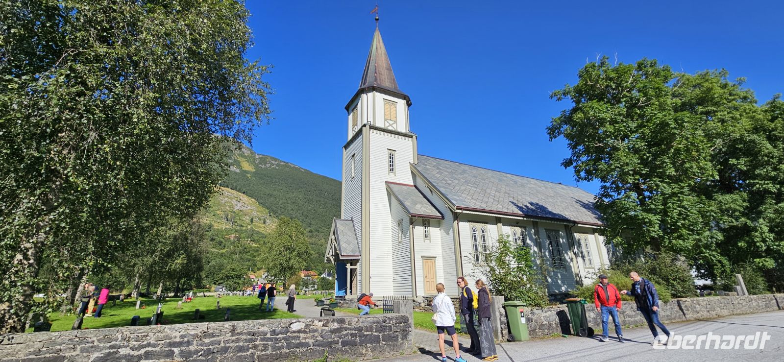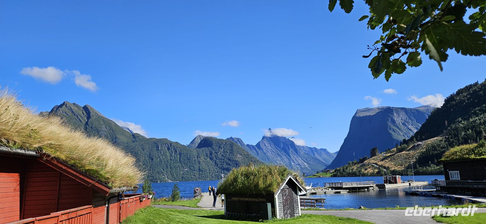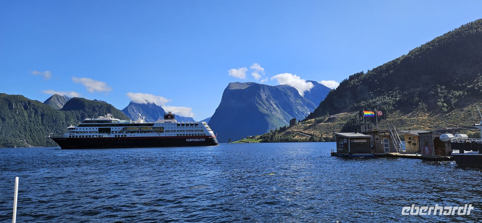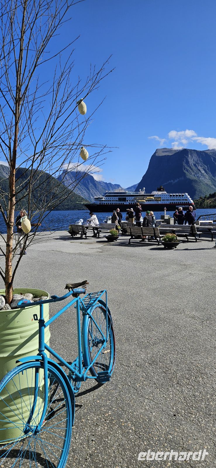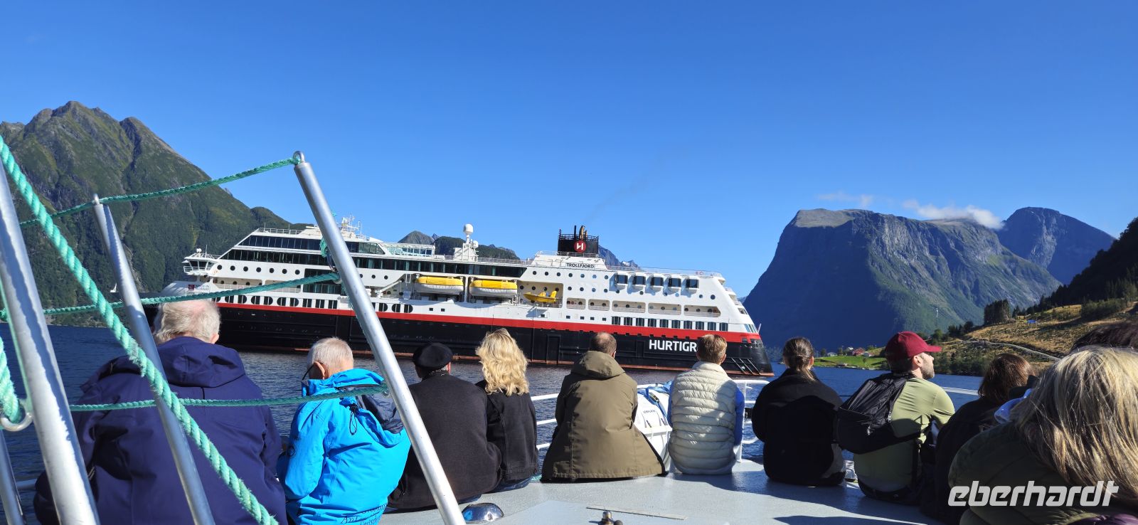 Ganz pünktlich 8 Uhr legte MS Trollfjord in Alesund im Kreuzfahrt Hafen an und sogleich begannen wir zu fünft unseren Stadtspaziergang. Vorbei am Rathaus und der Post gingen wir über die Königsstrasse bis zur Skulptur des Zeitungsjungen. Dort beginnen die Treppen in Richtung Park unterhalb der Aksla. Im Park fanden die grosse Araukarie, das Denkmal vom Wikinger Rollo und das Denkmal für Kaiser Wilhelm unsere Aufmerksamkeit. Dann nahmen wir die Treppen in Angriff und stiegen hinauf bis zur 220., wo sich der tolle Aussichtsbalkon befindet. Das alle hielten wir in vielen Fotos fest und die Sonne sorgte für die richtige Beleuchtung. Wieder unten im Zentrum spazierten wir am Sund entlang und über die Brücke hinüber ins Jugendstilzentrum. Bei den Skulpturen des Fischers und der Fischfrau machten wir natürlich Halt und nach einer kleinen Runde vorbei an wunderschönen Jugendstilhäusern kehrten wir aufs Schiff zurück. Ein Grossteil unserer Gruppe ging in Alesund von Bord und nahm an einer wunderschönen Bustour über die Berge, vorbei an Fjorden mit Endpunkt Urke teil. Dort kamen sie per Fähre an und mit dem Tenderboot wieder zu uns an Bord. Man konnte sich auch einer Führung durch das Jugendstilzentrum in Alesund anschließen. Nach dem Ablegen begann eine unvergessliche Strecke bei Sonnenschein hinein in den Hjodurfjorden. Von 12.30 bis 16.30 Uhr ankerte unser Schiff vor Saebo und an Land wurden wir mit Tenderbooten gebracht. In Saebo waren einige Geschäfte und Cafes geöffnet und 14 Uhr hatte man eigens für die Gäste der MS Trollfjord in der Kirche ein Konzert organisiert. Mit Geige und Schifferklavier spielten für uns zwei fantastische Musiker norwegische Volks Musik und norwegische Klassik. Es war ein unvergessliches Erlebnis. Eine Gruppe von Wanderern erkundete die Gegend um Urke zu Fuss und die Gäste der Bustour waren ebenfalls total begeistert. Die Sonne verwöhnte uns bis zum Untergang und machte unseren letzten Tag auf dem Schiff unvergesslich. Das Abschiedsabendessen schmeckte wie alle anderen Essen wieder grandios und 20.30 Uhr sahen wir endlich auch mal unsere Kapitänin im Kreise der Offiziere und leitenden Angestellten. Wir stiessen auf die gelungene Reise an und erfuhren, dass wir mit dem Schiff 5817 km unterwegs waren. Ein fantastischer Sonnenuntergang auf Deck 9 beschloss den erlebnisreichen Tag und auch unsere Kreuzfahrt.