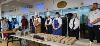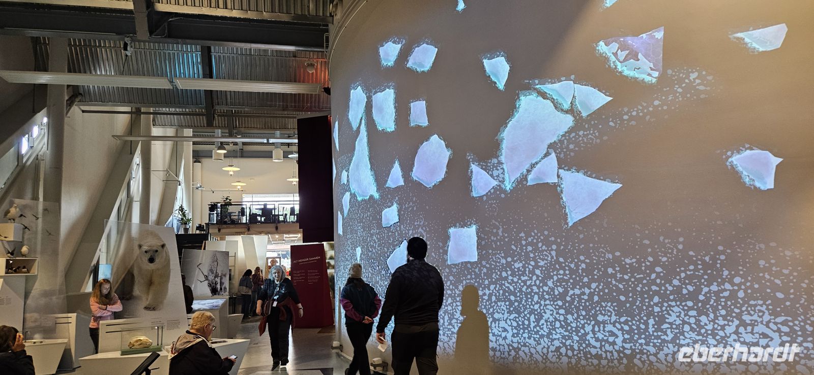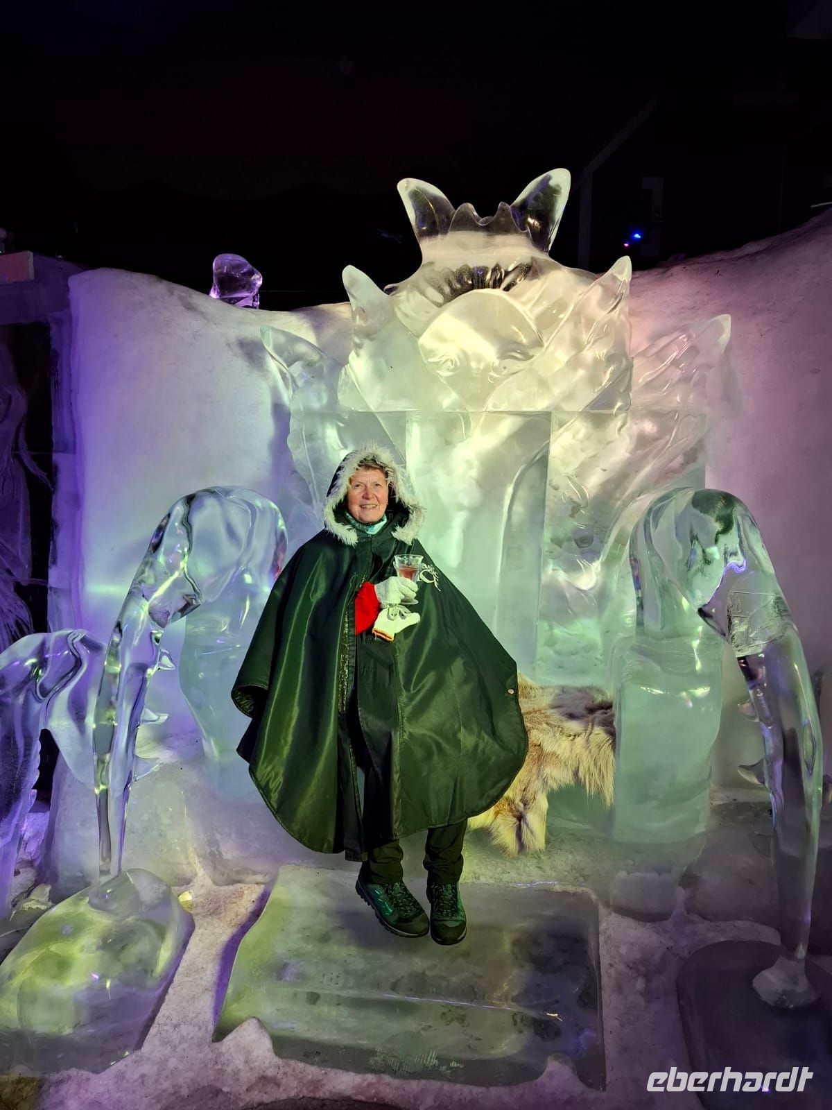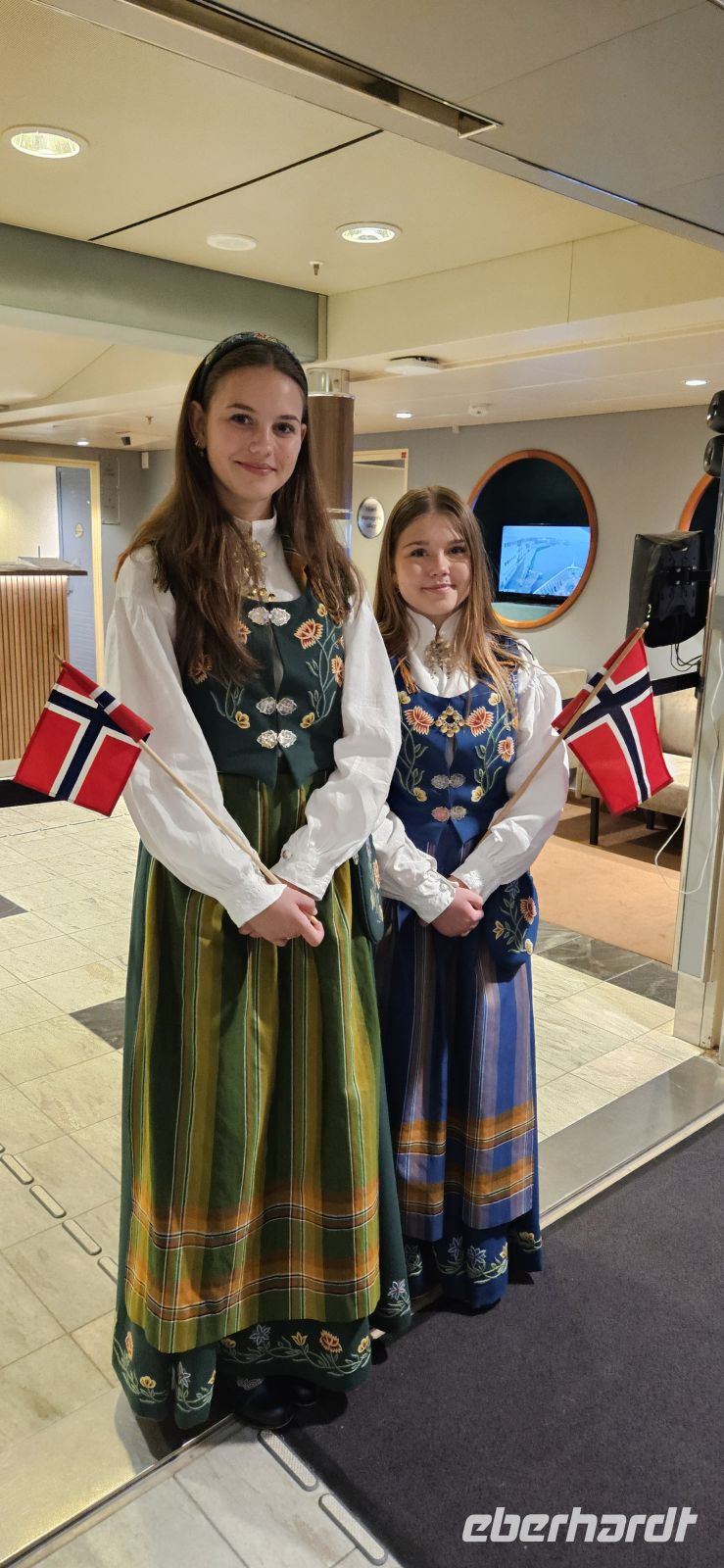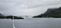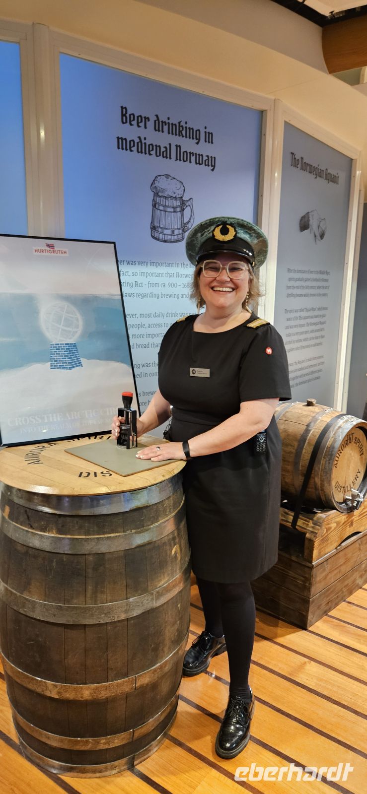Heute stand uns ein sehr erlebnisreicher Tag bevor. Bereits 8 Uhr legte MS Trollfjord in Stokmarknes an und wir gingen alle ins benachbarte Hurtigruten Museum, um die alte "Finnmarken " zu erkunden. Das Museum ist sehr informativ und wir durften dieses alte Schiff besuchen. Während sich die Männer vor allem für die technischen Details interessierten, erkundeten wir Fauen die Kabinen, Salons, testeten die alten Liegestühle und jeder wollte auch mal am Steuerrad drehen. 10 Uhr verliessen wir den Liegeplatz in Stokmarknes und bald darauf erfolgte die Einfahrt in den Raftsund. An Deck 9 konnten wir Stockfisch verkosten und dazu verschiedene Biere trinken. Das Expeditionsteam informierte zum Trollfjord und dann fuhren wir tatsächlich trotz schlechten Wetters in den schmalen Trollfjord ein. Am Ende des Fjordes wurde das Schiff auf der Stelle gedreht und dieses Manöver dauerte reichlich 5 Minuten. Hut ab und großen Dank an die Brücke ! Auf der Weiterfahrt nach Svolvaer zeigte sich sogar mal die Sonne und zauberte einen wunderschönen Regenbogen. Es folgte unser Mittagessen im Flora Restaurant und dann kam schon steuerboard die Fischerfrau in der Hafeneinfahrt nach Svolvaer in Sicht. Leider begann es wieder zu regnen als wir das Schiff verließen und zum Ausflugsbus gingen. Gäste ohne gebuchten Ausflug erkundeten mit mir den Skulpturenpark mit dem Spiegelei und später die Magic Ice Bar. Auch das Militärmuseum war sehenswert und die Geschäfte luden zum shoppen ein. Gegen 17 Uhr war das alltägliche Treffen mit dem Expeditionsteam und 18.30 Uhr waren wir alle wieder vereint beim 3 Gang Abend Menue an unseren reservierten Tischen. Einige Damen der Gruppen speisten im Arran Restaurant unseres Schiffes an diesem Abend.