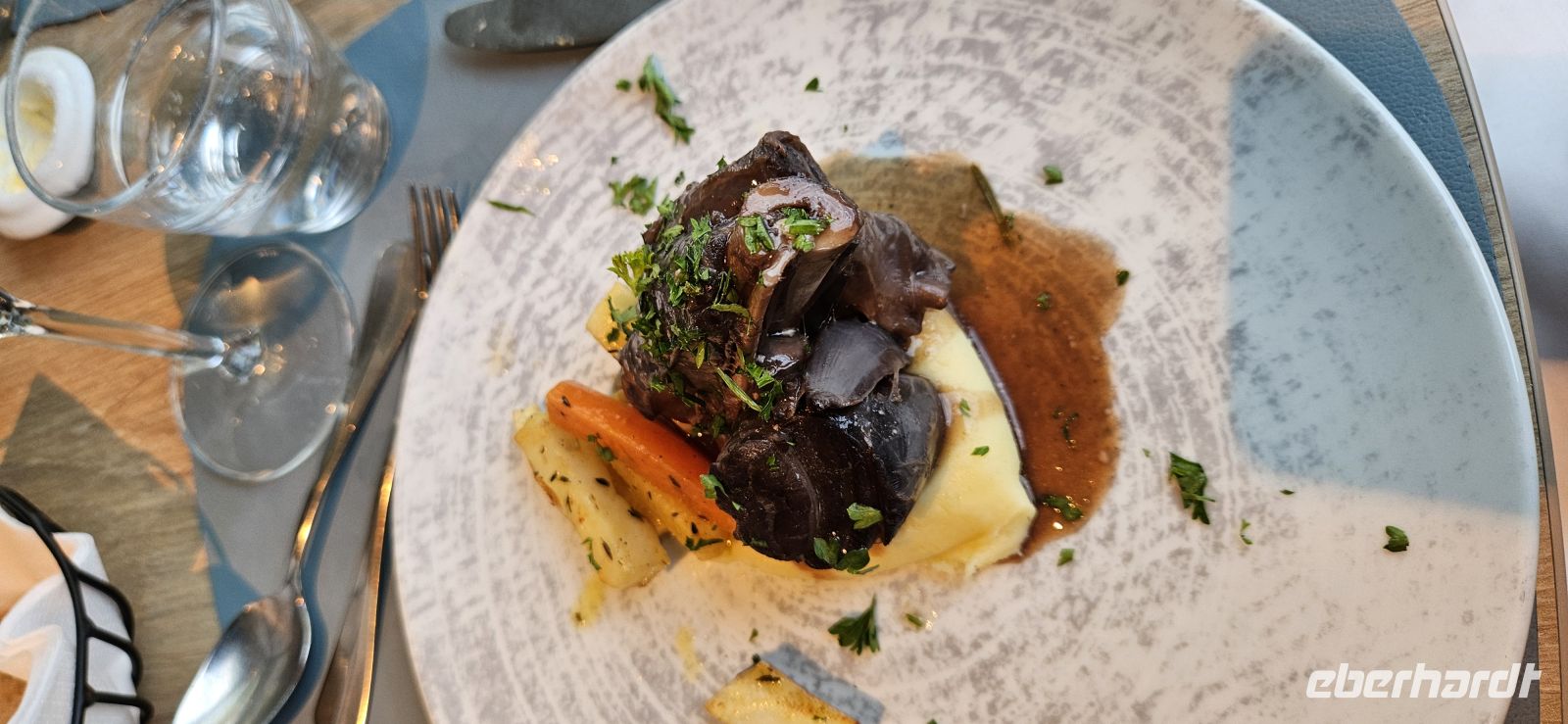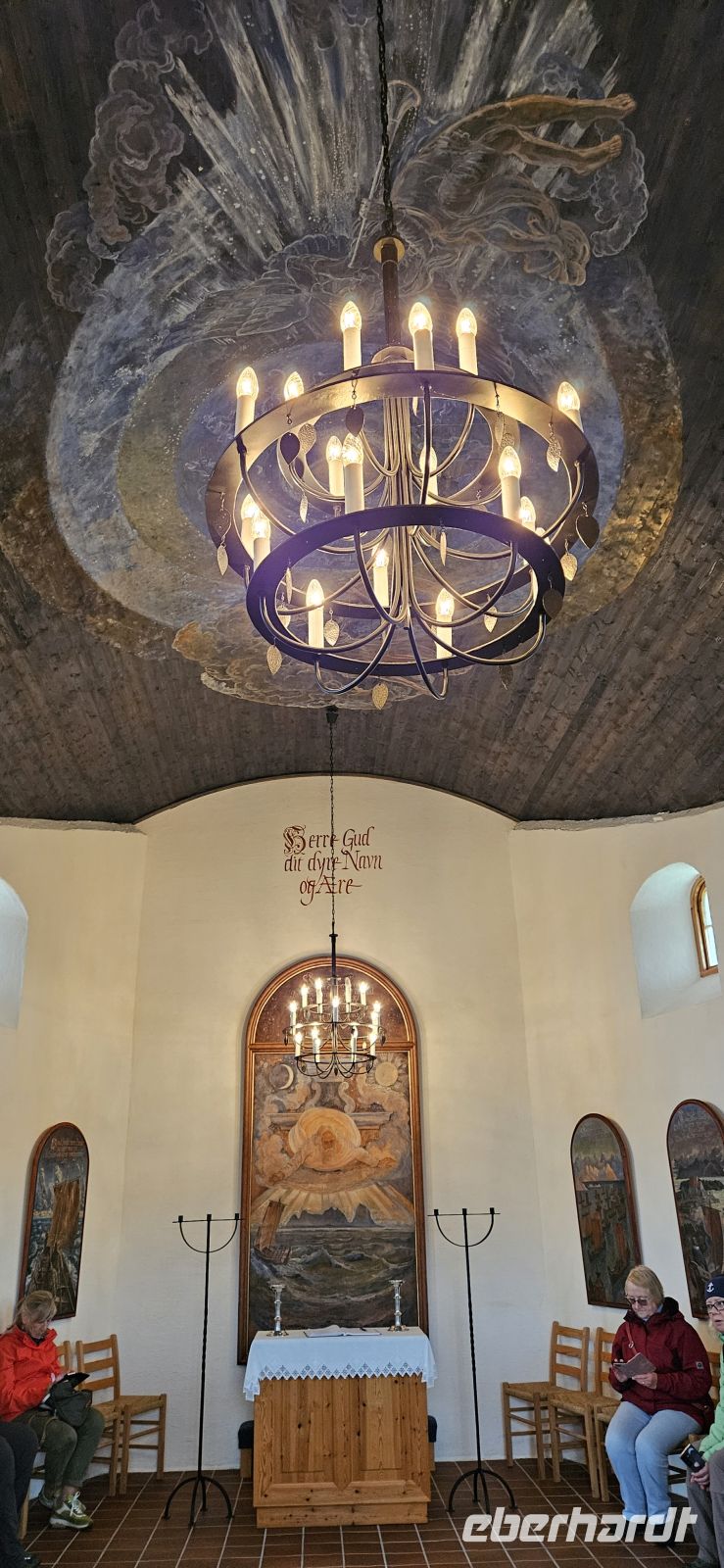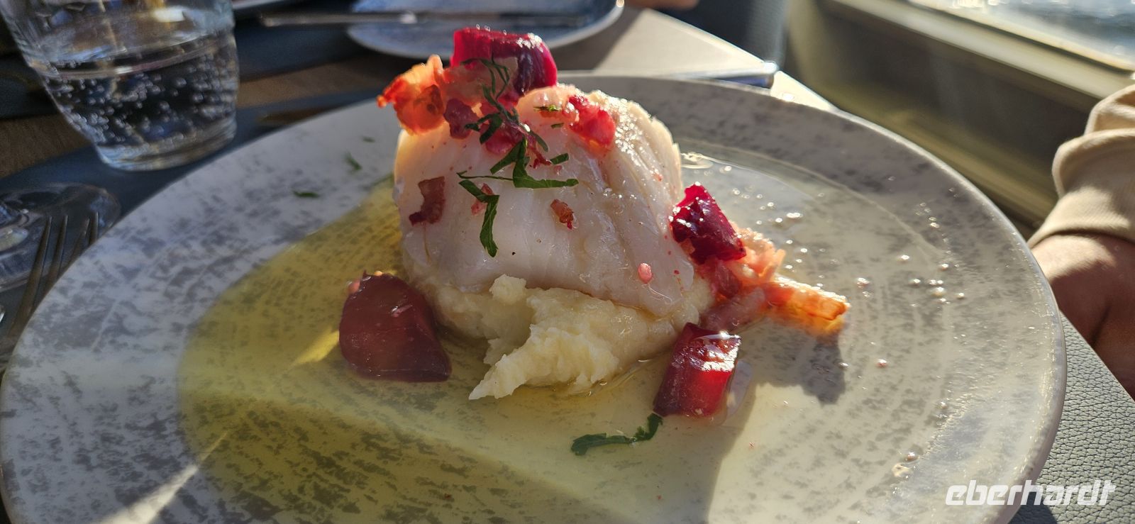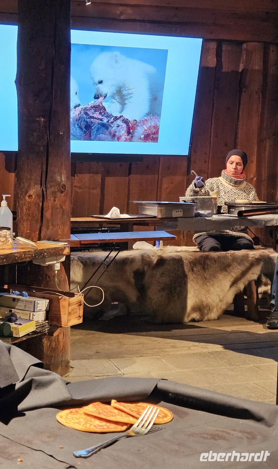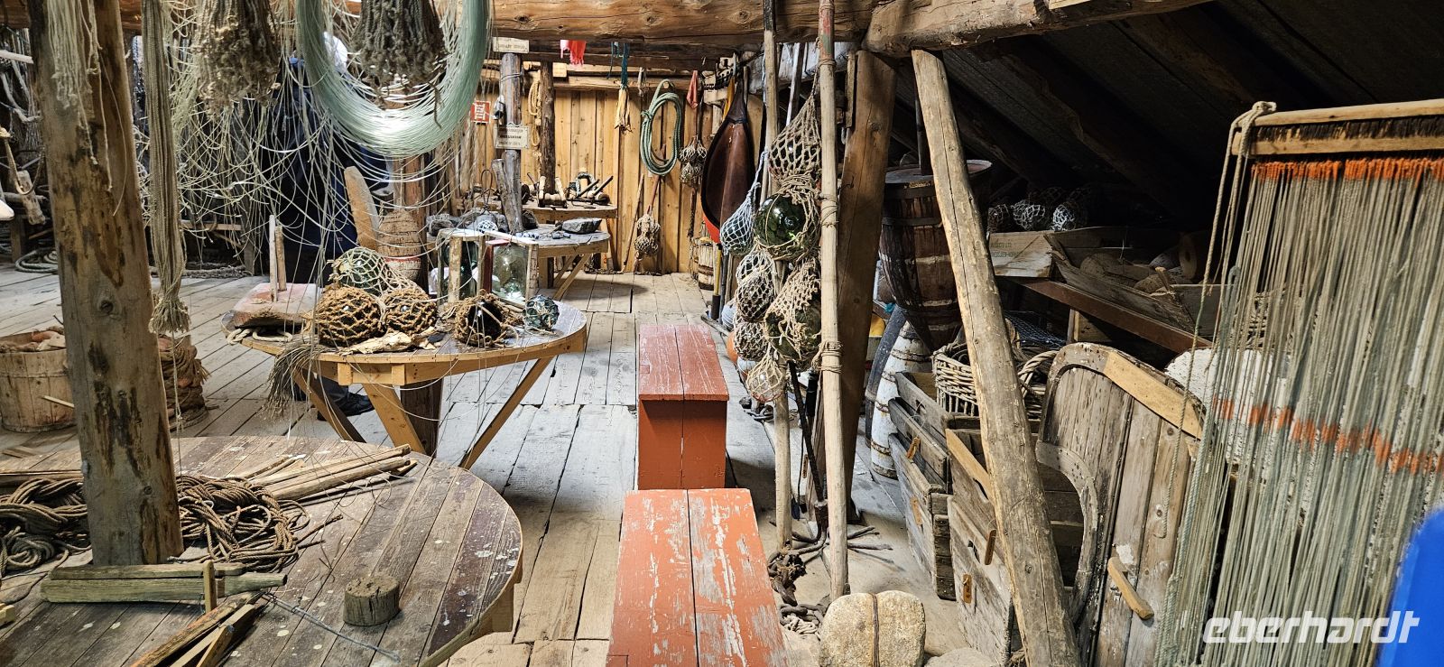 Während des Frühstücks erreichten wir den Hafen von Reine auf den Lofoten. Unsere Gruppe nahm geschlossen am Ausflug Lofoten teil. Unser Bus wurde von Jule als Reiseleiterin begleitet. Als studierte Geologin gab sie uns viele Informationen zur Geologie der Lofoten, zum Lofotenfischfang und zum Leben der Bevölkerung. Die vielen Inseln sind mit Brücken verbunden und die Strassen führen zunehmend durch Tunnel und so ist man sicherer unterwegs. Über die legendäre Strasse E10, auch König Olavs Weg genannt, fuhren wir nach A in das letzte Dorf der Lofoten. Dort nahmen uns Museumsführer in Empfang, bebleiteten uns in den Ort und zeigten uns alles Sehenswerte. Der kleine Ort war und ist vom Fischfang geprägt und so kann man noch alte Boote, Werkzeuge, Fischerhütten und vieles mehr besichtigen. In der alten Bäckerei, die einst die Fischer versorgte, gibt es heute die besten Zimtschnecken und viele andere Leckereien. Mit dem Bus fuhren wir dann zurück, vorbei an einer Lachstreppe und vorbei an Reine nach Ramberg. Dort besuchten wir eine Kirche und in Ramberg machten wir unsere Mittagspause. Es gab eine leckere Fischsuppe und einen Nachtisch. Das Ramberg Resort liegt an einem wunderschönen Sandstrand und bei schönem Wetter hätte man vielleicht ein Bad im Nordmeer nehmen können. Leider regnete es und so stand diese Option nicht wirklich. So fuhren wir zurück zum Schiff. Am Nachmittag trafen wir uns wieder bei Leo vom Expeditionsteam, sahen nochmals die Polarkreis Taufe im Film und erfuhren alles Wichtige zu unserem Aufenthalt in Tromsö. Unser Abend Menue war wieder ein besonderer Gaumenschmaus und dann ließen wir den Abend auf Deck 8/9 ausklingen.