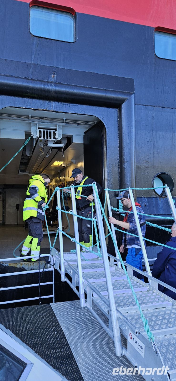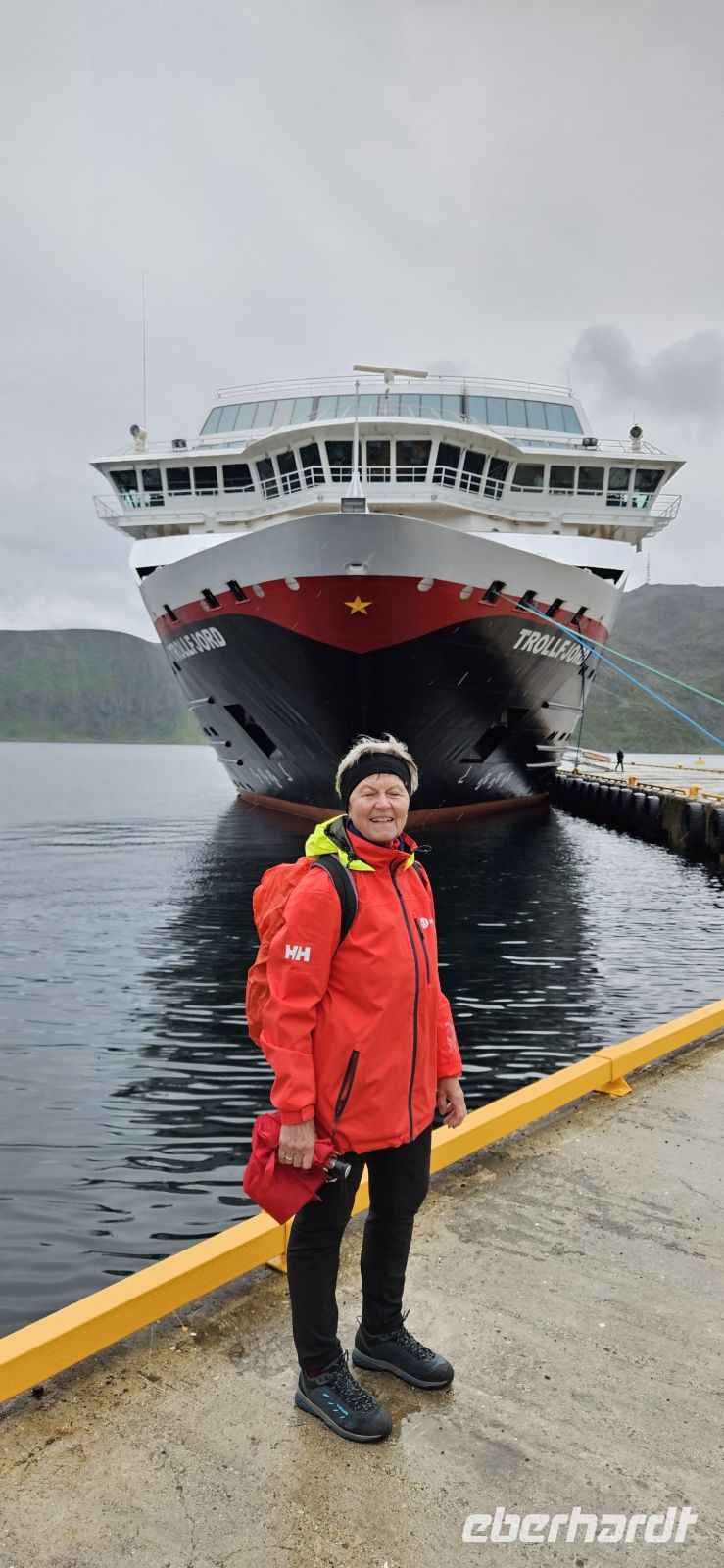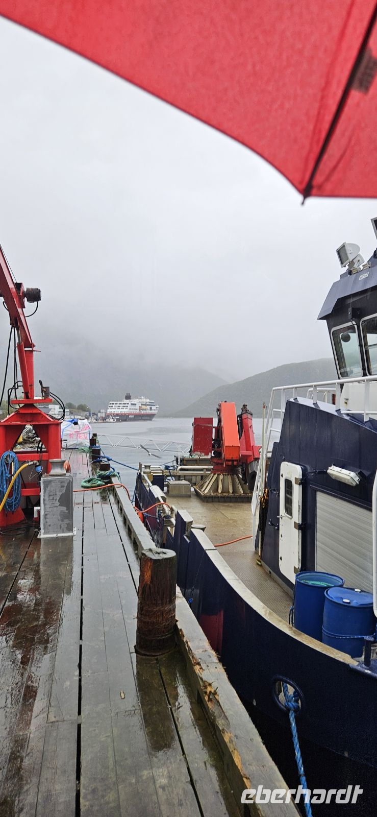 Heute Nacht fuhren wir an der Insel Melkoya vorbei und schon weithin war die Flamme der Raffinerie zu sehen. Am Vormittag konnten wir uns abschließend mit der Bildersuche an Bord beschäftigen und nun sind alle Beteiligten gespannt, ob sie richtig lagen. Am Vormittag legte unser Schiff einen technischen Stopp vor Tromsö ein, um unter anderem den Müll von Spitzbergen zu entladen. Wir schauten uns die Präsentation zu Hurtigruten entlang der norwegischen Küste an. Dann gab es Mittagessen und am Nachmittag wurde uns ein interessanter Vortrag zur Geschichte der Hurtigruten von Johann präsentiert und danach begann unser tägliches Treffen beim Expeditionsteam. Die Anlandung auf der Insel Senja war leider recht spät und so hatten alle, die an Ausflügen teilnahmen, wenig Zeit fürs Abendessen. Auf der Insel Senja regnete es ununterbrochen, dennoch machte ich einen Erkundungsspaziergang durch den kleinen Ort. Die Ausflügler unserer Gruppe kamen nach und nach zurück und vor allem die Fahrt mit dem RIB Boot war wohl der Knaller trotz Regen. Aber auch die Busrundfahrt war sehr erlebnisreich und wurde von Fabian geführt, der unsere Eberhardt Gruppen auch in Tromsö begleitet.