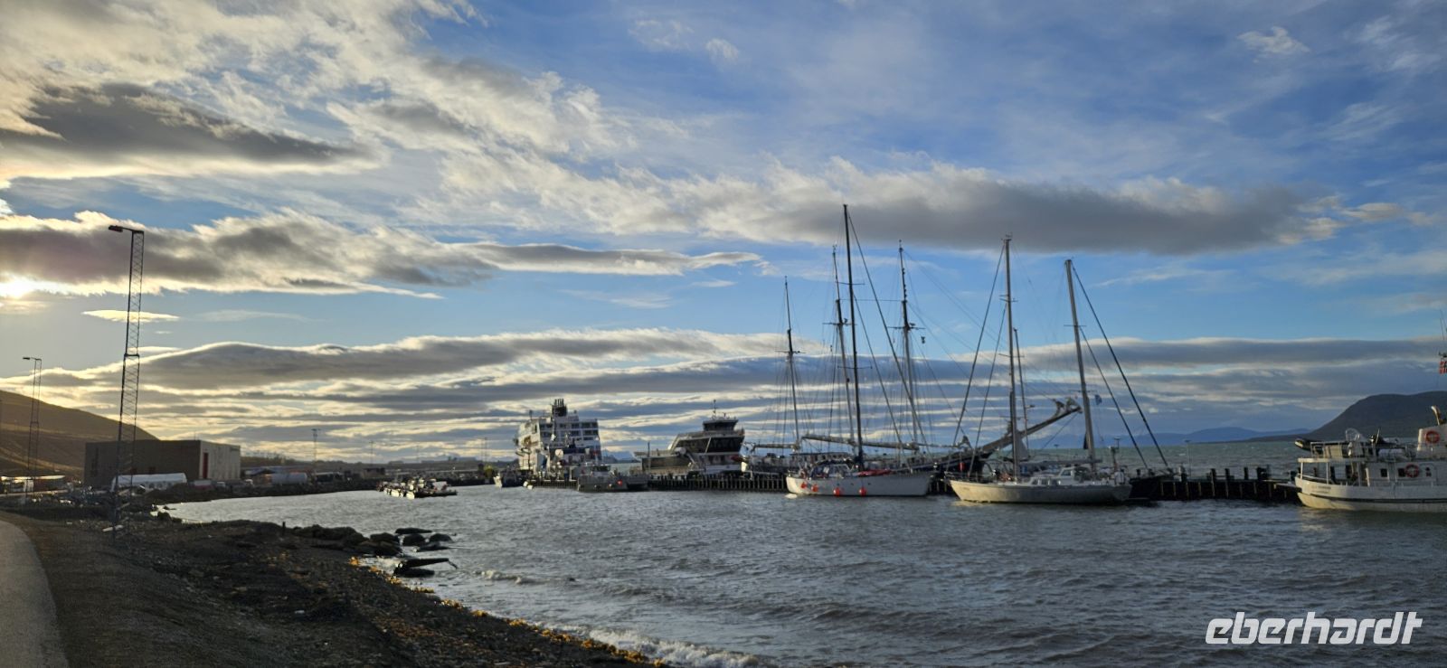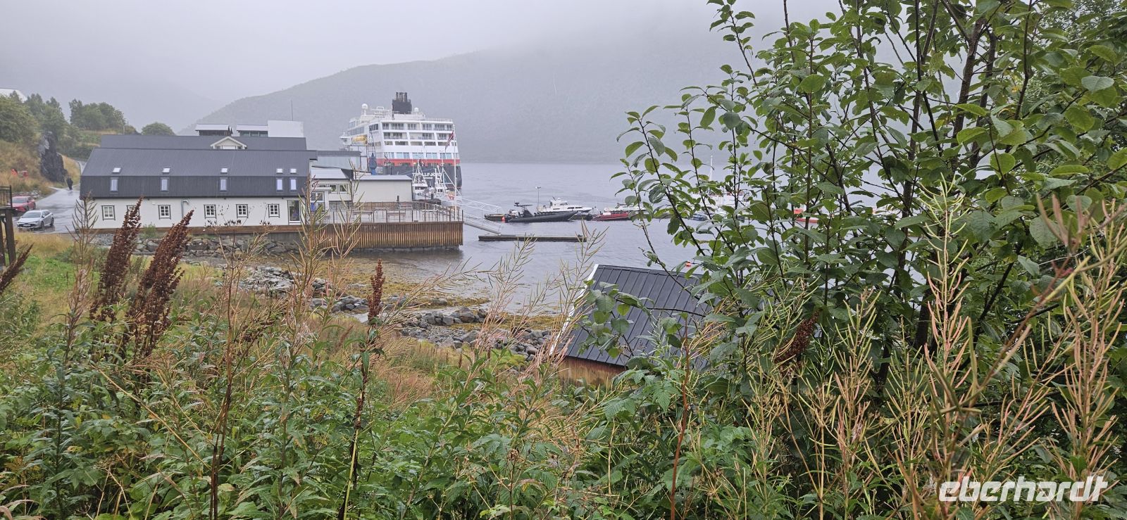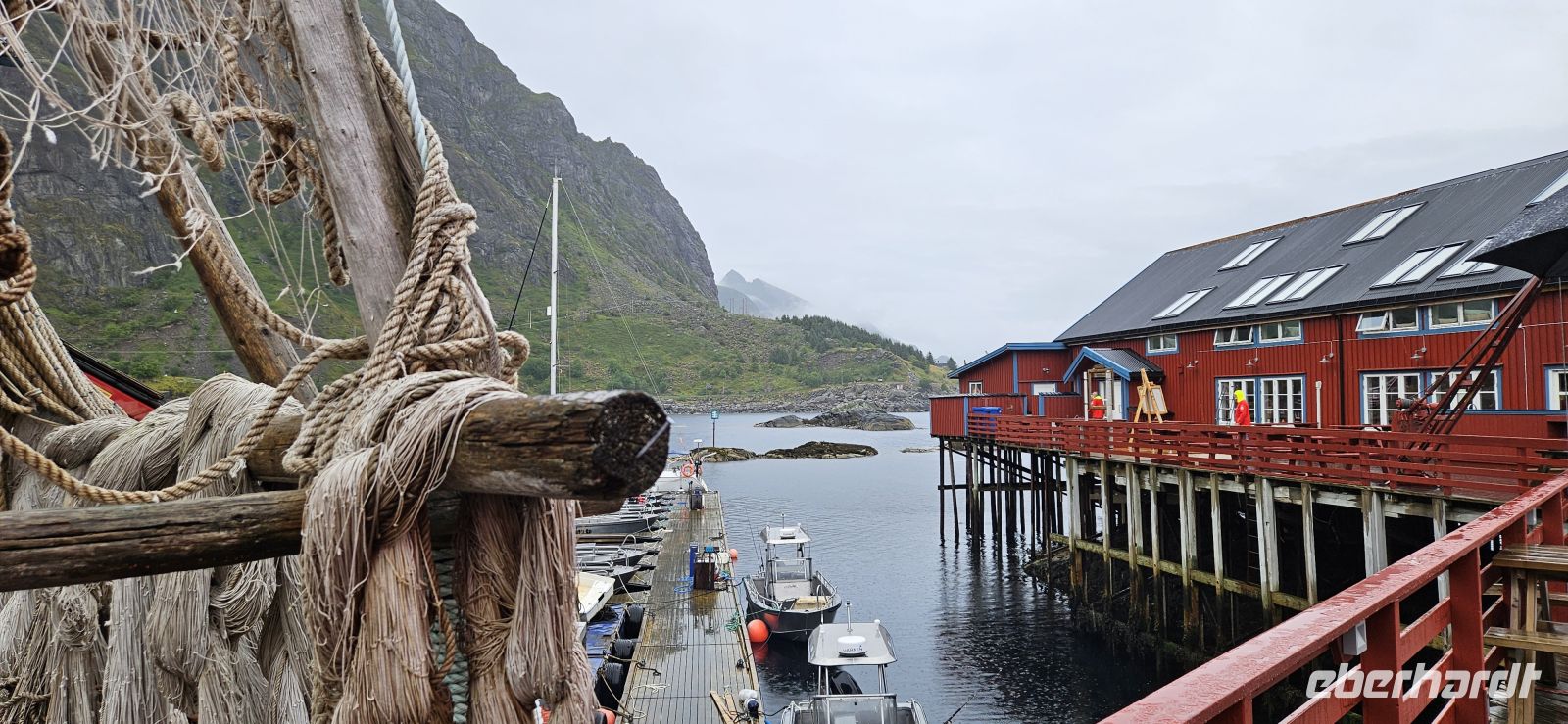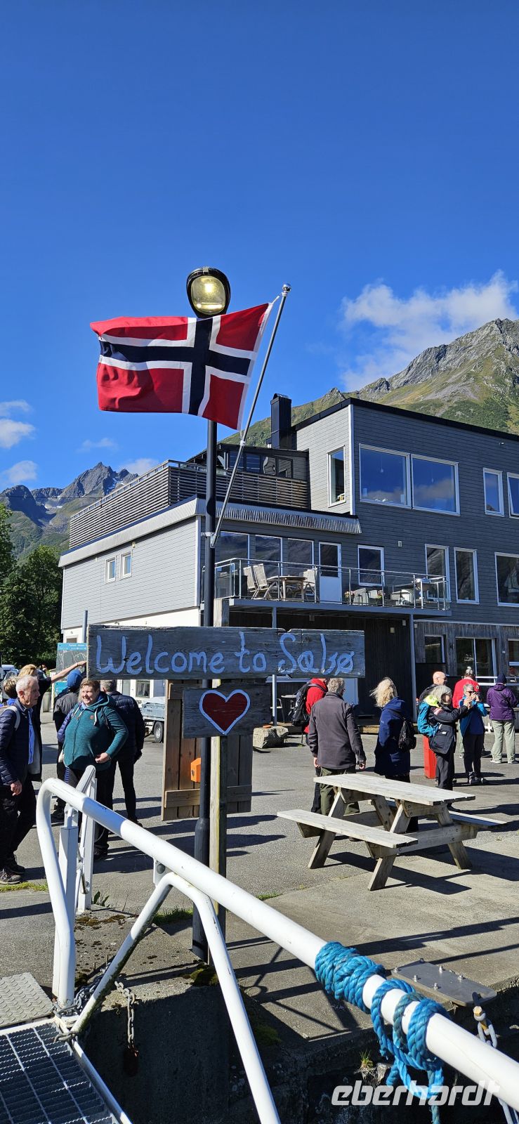 Heute Nacht fuhren wir an der Insel Melkoya vorbei und schon weithin war die Flamme der Raffinerie zu sehen. Am Vormittag konnten wir uns abschließend mit der Bildersuche an Bord beschäftigen und nun sind alle Beteiligten gespannt, ob sie richtig lagen. Am Vormittag legte unser Schiff einen technischen Stopp vor Tromsö ein, um unter anderem den Müll von Spitzbergen zu entladen. Wir schauten uns die Präsentation zu Hurtigruten entlang der norwegischen Küste an. Dann gab es Mittagessen und am Nachmittag wurde uns ein interessanter Vortrag zur Geschichte der Hurtigruten von Johann präsentiert und danach begann unser tägliches Treffen beim Expeditionsteam. Die Anlandung auf der Insel Senja war leider recht spät und so hatten alle, die an Ausflügen teilnahmen, wenig Zeit fürs Abendessen. Auf der Insel Senja regnete es ununterbrochen, dennoch machte ich einen Erkundungsspaziergang durch den kleinen Ort. Die Ausflügler unserer Gruppe kamen nach und nach zurück und vor allem die Fahrt mit dem RIB Boot war wohl der Knaller trotz Regen. Aber auch die Busrundfahrt war sehr erlebnisreich und wurde von Fabian geführt, der unsere Eberhardt Gruppen auch in Tromsö begleitet.