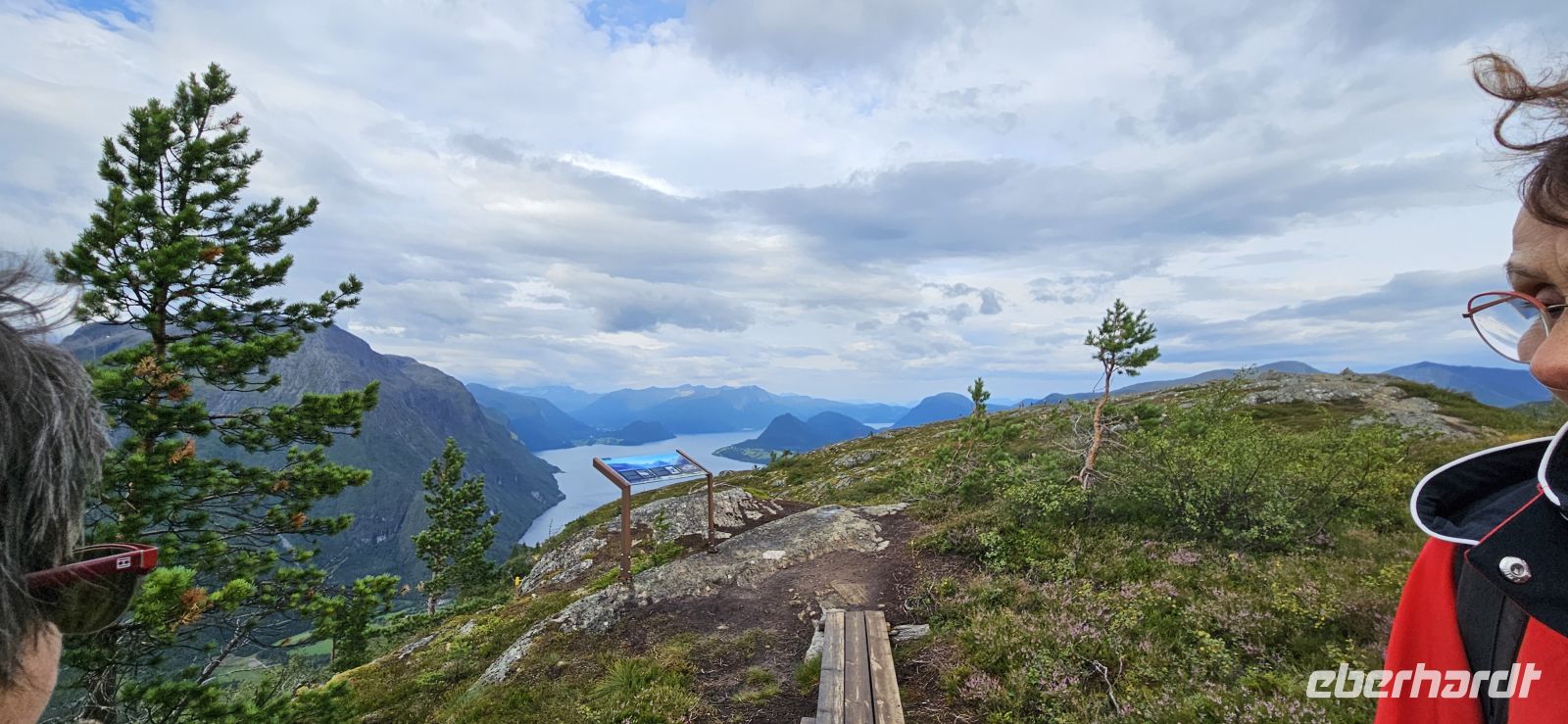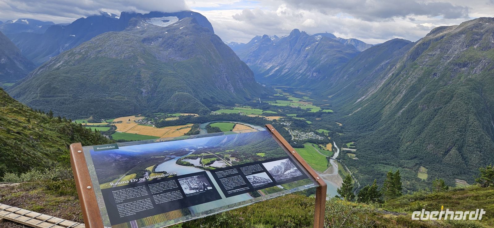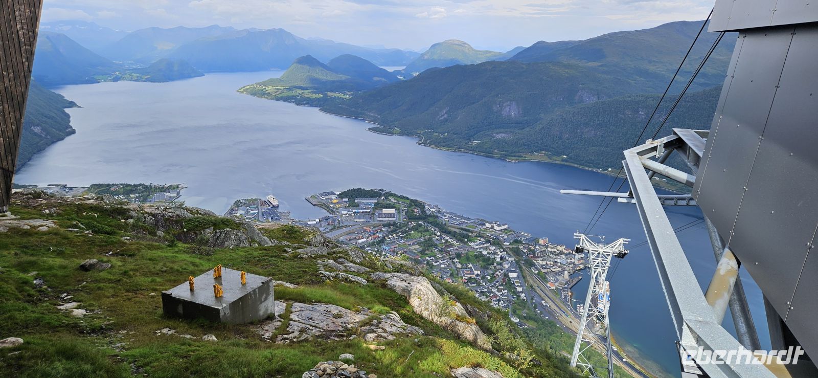 Immer von 7 bis 10 Uhr gab es jeden Morgen ein überaus reichliches Frühstück und so starteten wir gut gestärkt in den Tag. In Andalsnes lag unser Schiff etwas ausserhalb und so nutzten wir den Shuttlebus ins Stadtzentrum. Viele Singles hatten einen Ausflug gebucht und 5 begaben sich mit mir individuell in die Stadt und mit der Romsdal Gondel binauf auf den Hausberg Neskla. Es klarte auf und so hatten wir eine wunschöne Sicht auf die Stadt am Fjord und bis hin zur Trollstigen Strasse. Oben auf dem Berg wanderten wir auf einem wunderschönen Weg und hatten dabei viele tolle Ausblicke und Fotomotive. Wieder unten in Aldalsnes erkundeten wir das Zentrum und kauften erfolgreich ein. Danach fuhren wir mit dem Shuttlebus zurück zum Schiff und genossen unser Mittagessen. 14 Uhr legte die MS Trollfjord ab und 15 Uhr gab es eine ausführliche Information zu den noch buchbaren Ausflügen nordgehend.