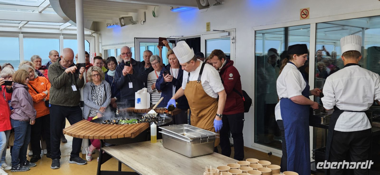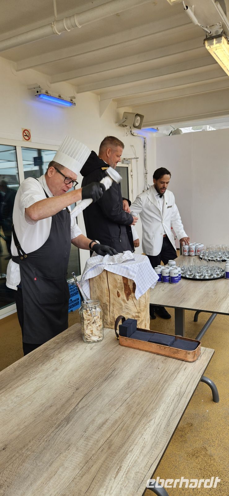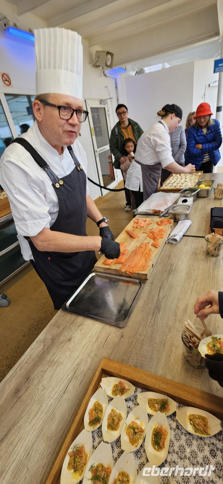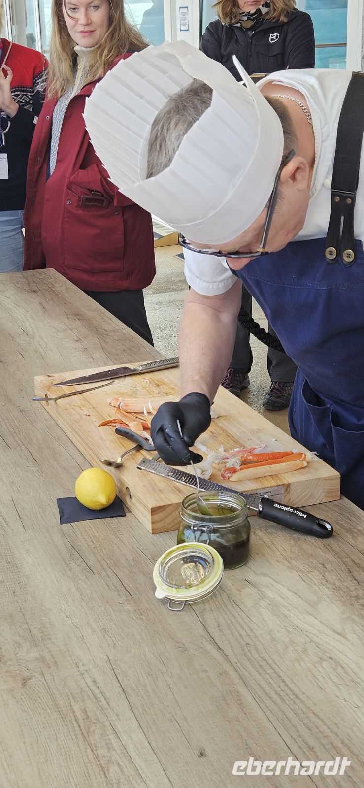 18.30 Uhr nahmen wir wieder an unseren reservierten Tischen das Abend Menue ein. Ein Treffen in der Bar auf Deck 9 war schon selbstverständlich und da waren wir schon "vor Ort" als die Lachspräsentation 21.30 Uhr begann. Wir durften anschließend den frischen Lachs, ein Lachstatar und geräucherte Lachshaut probieren.