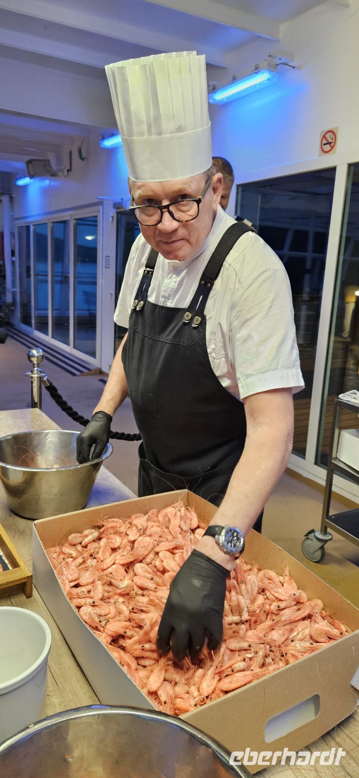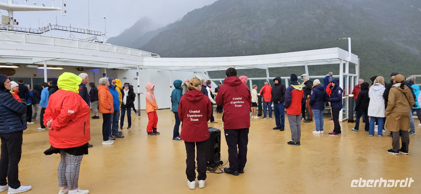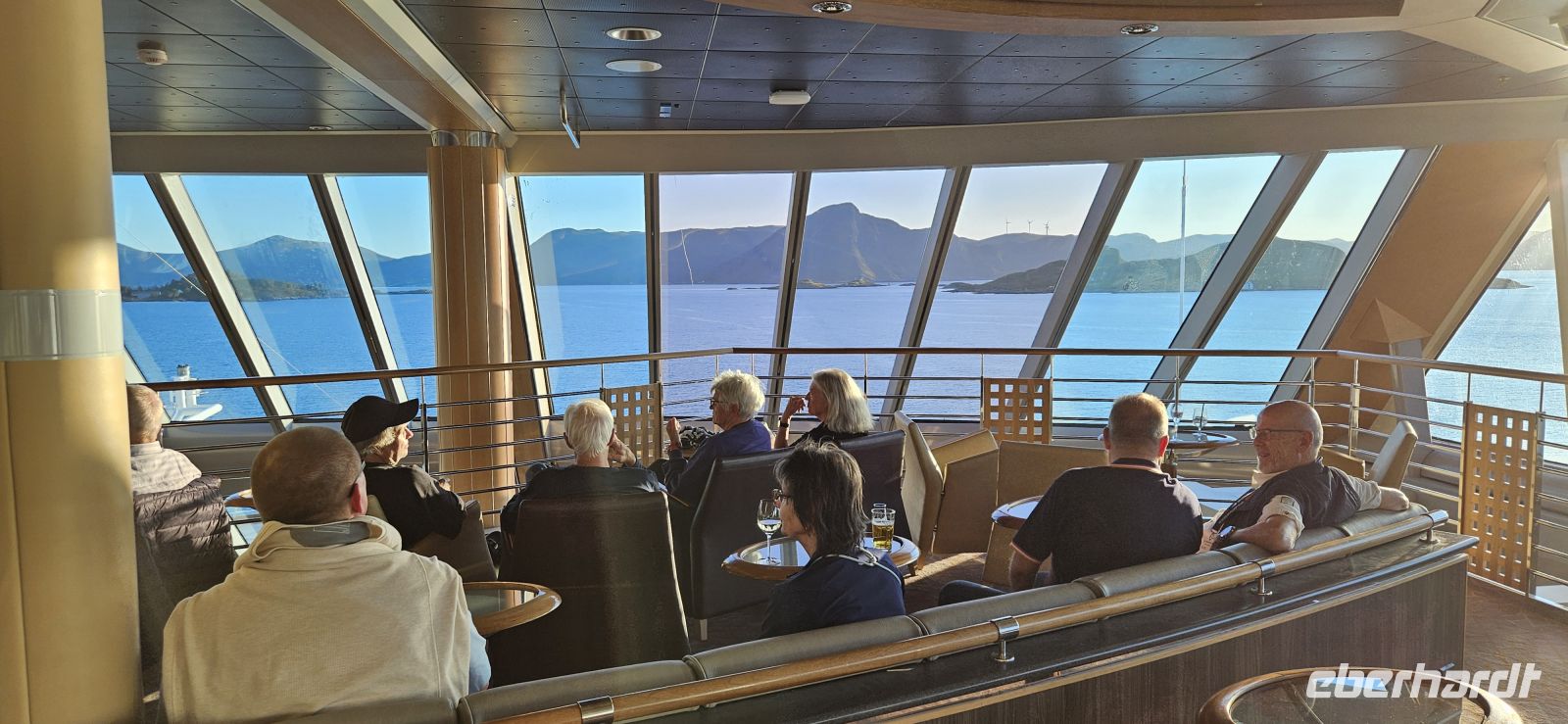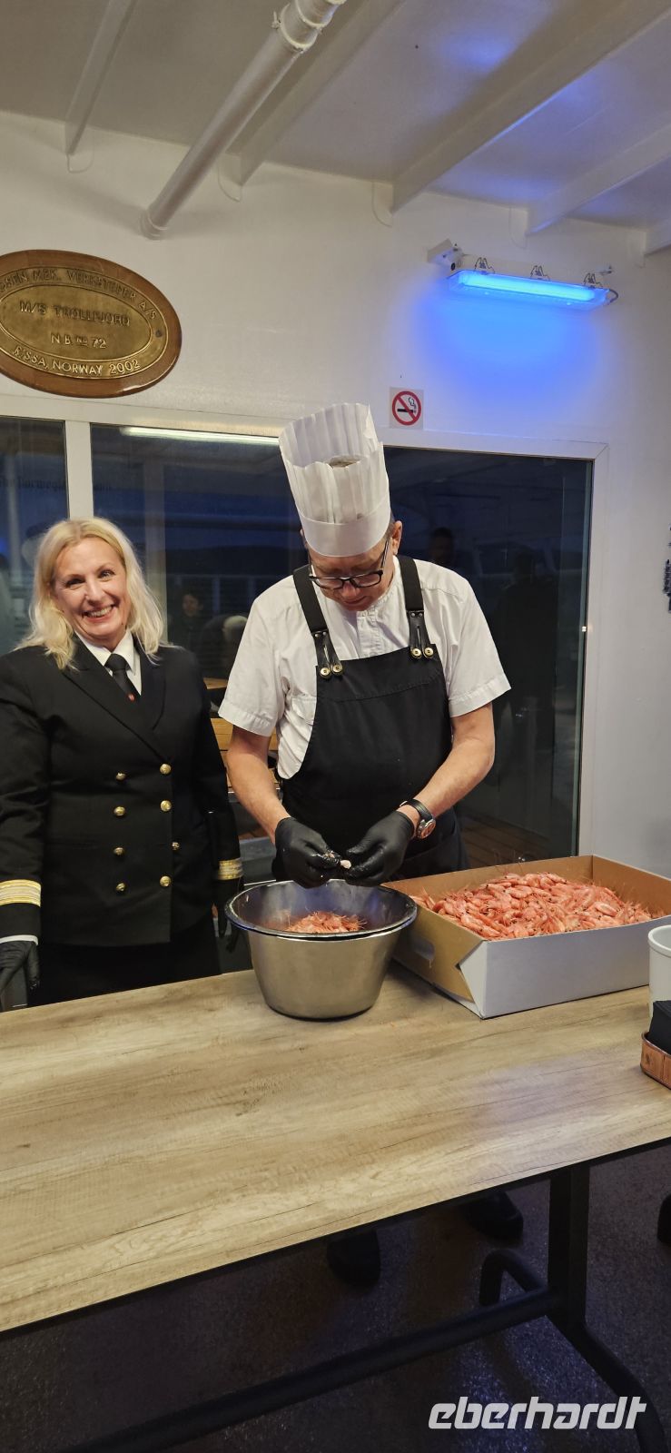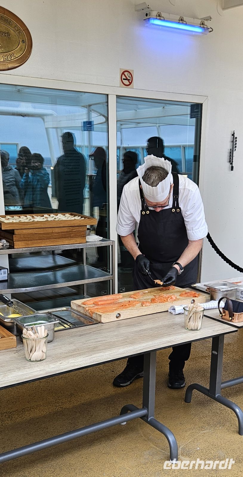 Es gab aber auch eine schöne Wanderung im flachen Ufer Bereich in der Nähe des Torghatten. Leider gab der Regentroll heute mal wieder alles und öffnete alle seine Schleusentore gleichzeitig. Er schaffte es aber nicht, uns die gute Laune zu verderben. 12 Uhr verließen wir Bronnoysund, fuhren noch einmal vorbei am Torghatten und am frühen Nachmittag gab es wieder ein Treffen mit dem Chefkoch zum Thema Lachs beizen und in 5 verschiedenen Arten dann zerlegen mit einem scharfen Messer. Wir durften anschließend auch reichlich probieren, weil nur wenige Interessenten auf Deck 9 anwesend waren. Am Nachmittag wurden wir über die Ausschiffung informiert und anschließend beim Expeditionsteam über unseren letzten Ausflugstag. Das online checkin nahmen wir am Abend vor und die Taxfree Belege mussten sortiert und ausgefüllt werden. Nach dem Abendessen trafen wir uns wie jeden Abend in der Bar auf Deck 9 und liessen den Abend gemütlich ausklingen.