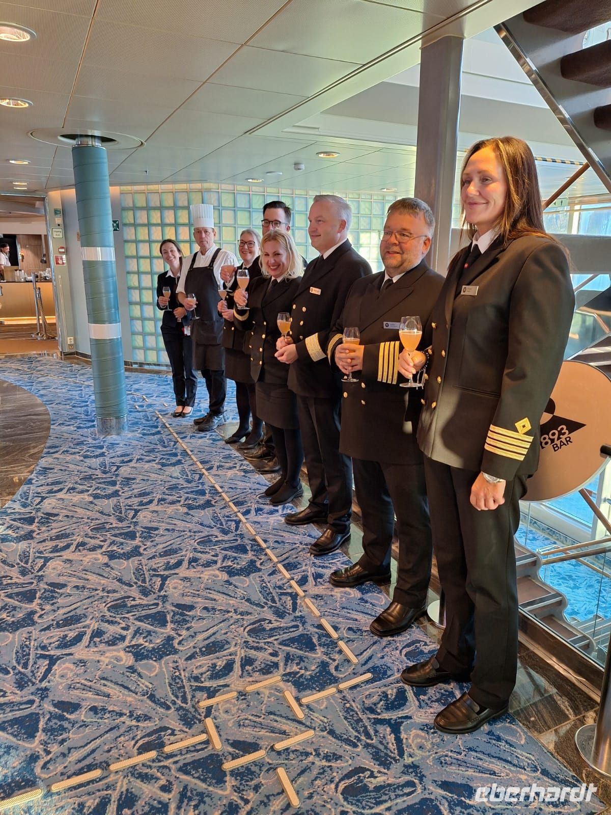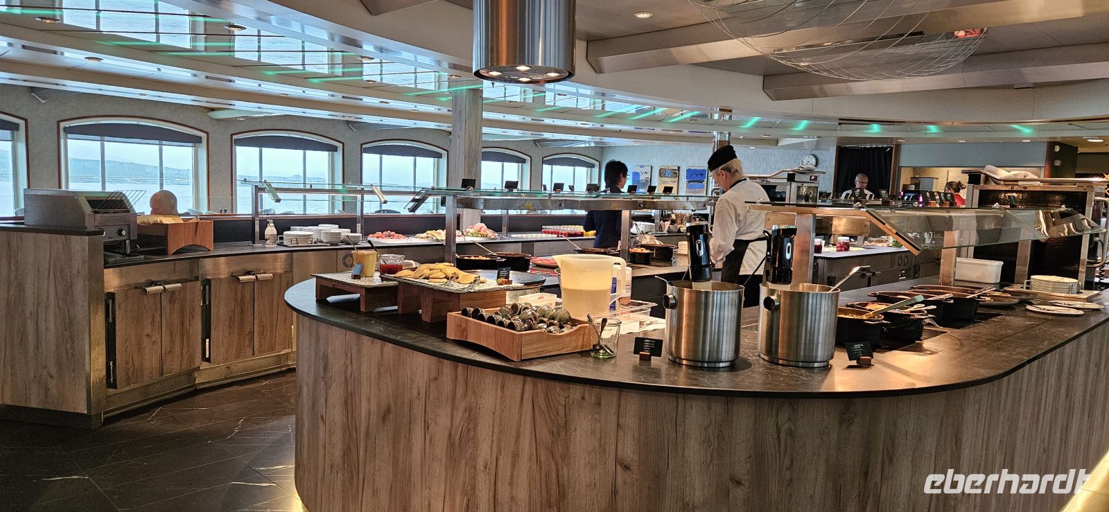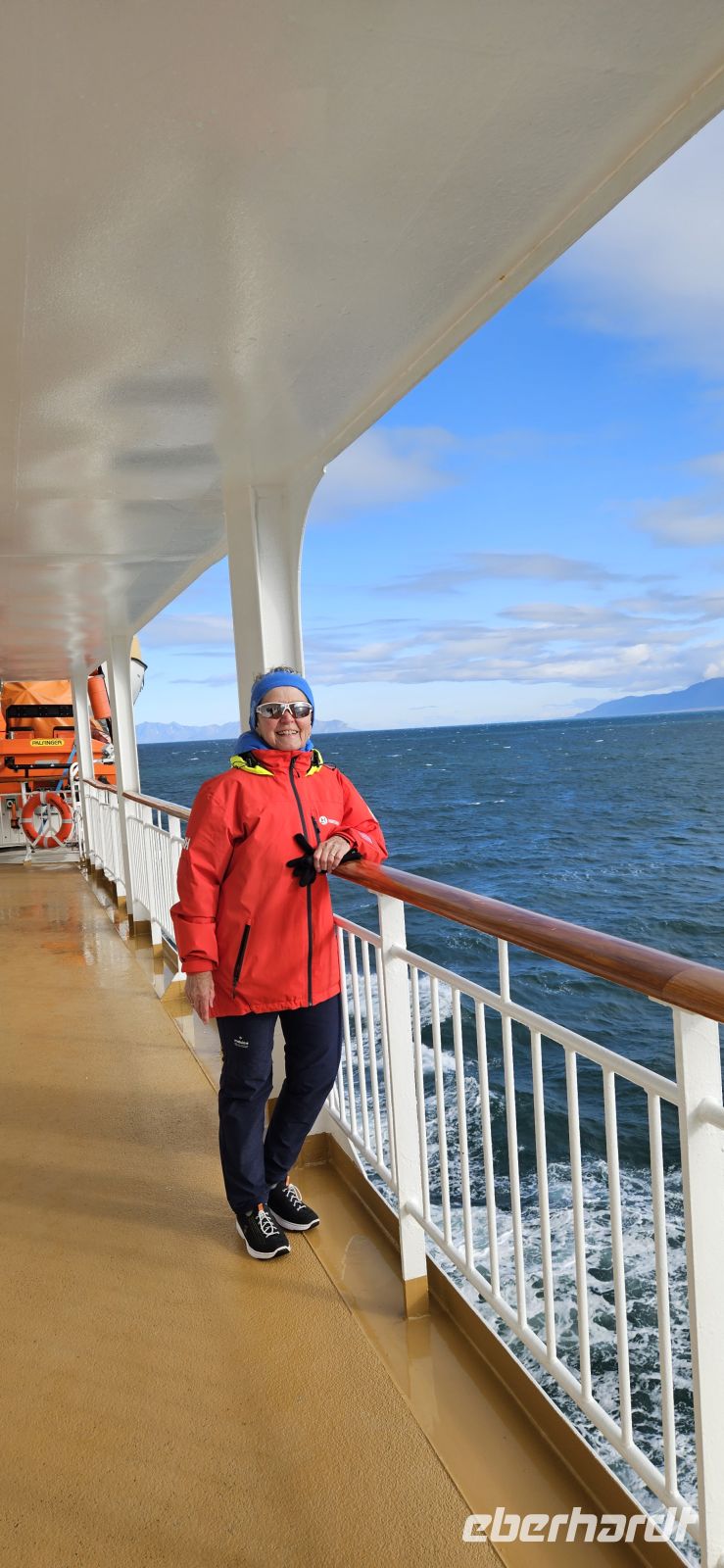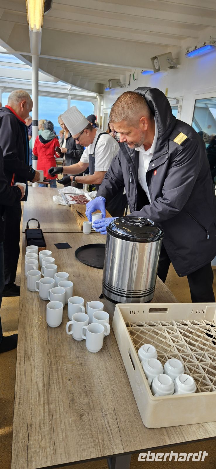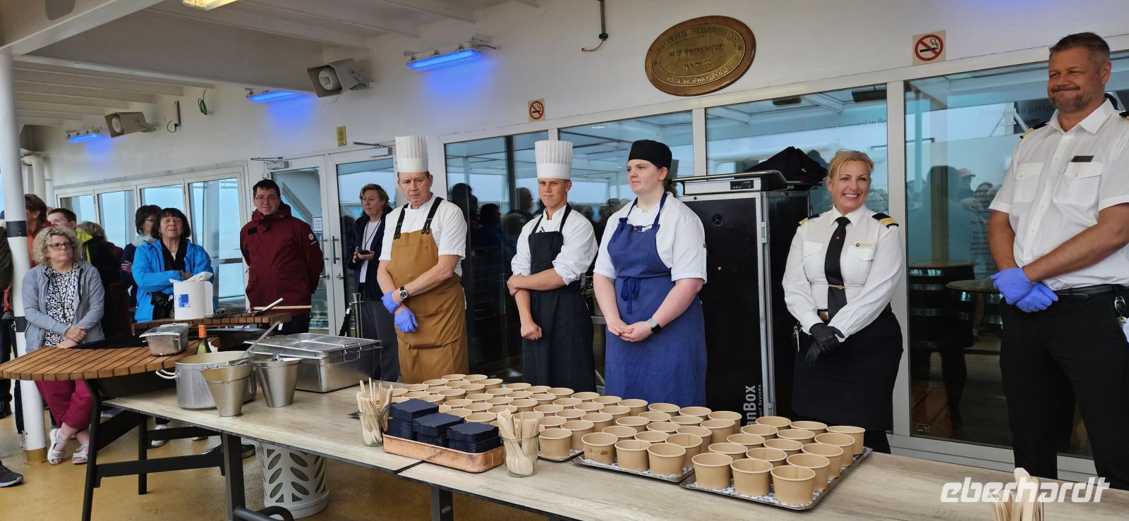 Es gab aber auch eine schöne Wanderung im flachen Ufer Bereich in der Nähe des Torghatten. Leider gab der Regentroll heute mal wieder alles und öffnete alle seine Schleusentore gleichzeitig. Er schaffte es aber nicht, uns die gute Laune zu verderben. 12 Uhr verließen wir Bronnoysund, fuhren noch einmal vorbei am Torghatten und am frühen Nachmittag gab es wieder ein Treffen mit dem Chefkoch zum Thema Lachs beizen und in 5 verschiedenen Arten dann zerlegen mit einem scharfen Messer. Wir durften anschließend auch reichlich probieren, weil nur wenige Interessenten auf Deck 9 anwesend waren. Am Nachmittag wurden wir über die Ausschiffung informiert und anschließend beim Expeditionsteam über unseren letzten Ausflugstag. Das online checkin nahmen wir am Abend vor und die Taxfree Belege mussten sortiert und ausgefüllt werden. Nach dem Abendessen trafen wir uns wie jeden Abend in der Bar auf Deck 9 und liessen den Abend gemütlich ausklingen.