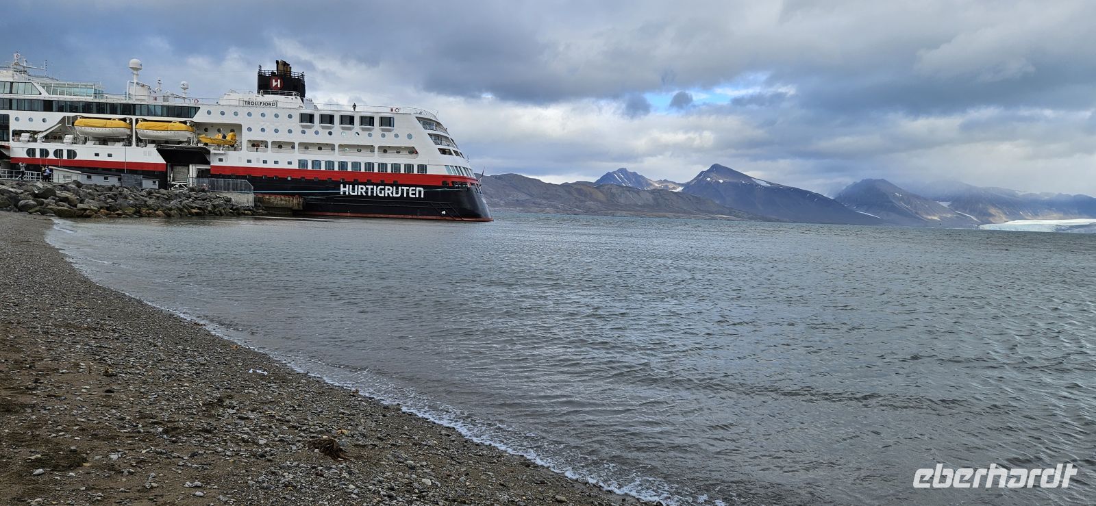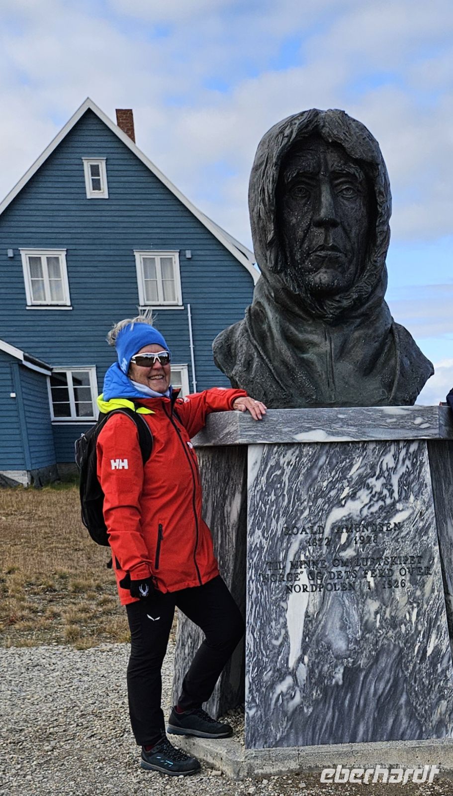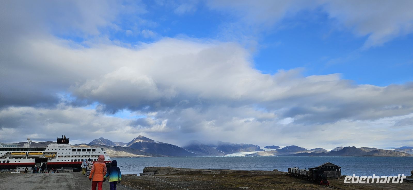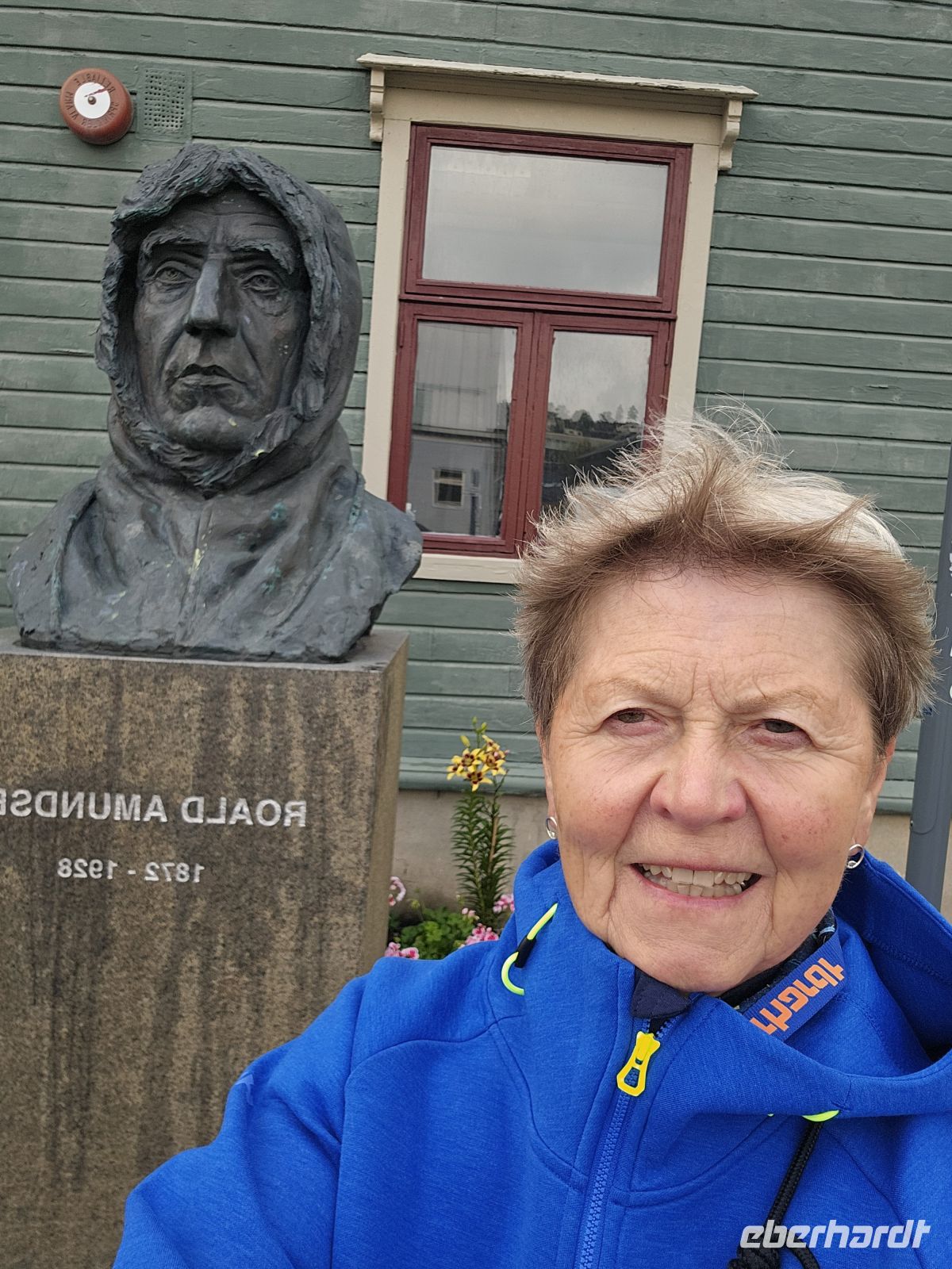 Trotz Tageslicht rund um die Uhr hatten wir ein bisschen geschlafen und trudelten so nach und nach beim Frühstück ein. Am Vormittag gab es keine Veranstaltungen, aber das bordeigene Internet wurde abgeschaltet und so hatten wir keinerlei Ablenkung durch die Medien. Erst kurz vor dem Mittagessen trafen wir uns auf Deck 9 bei herrlichem Sonnenschein und bestaunten den Blomstrand Gletscher ganz aus der Nähe sowie die interssanten Berge auf der Halbinsel Blomstrandhalvoya. Einst versuchte ein Geschäftsmann dort Marmor abzubauen, was aber nicht von Erfolg gekrönt war. Nun gab es wieder Mittagessen und gegen 13 Uhr legte MS Trollfjord in Ny Alesund an. Die Mitarbeiter des Expeditionsteams verteilten sich in der kleinen Siedlung und gaben Informationen. Für den Spaziergang bis zum Mast, wo Roald Amundsen einst sein Luftschiff festmachte, durften wir in Gruppen das "Eisbären sichere Gelände" mit Begleitung eines bewaffneten Rangers verlassen. Beim Warten entdeckten wir einen Polarfuchs, der offenbar von den vielen Menschen irritiert war. In der Siedlung besuchten wir weiter die Büste von Roald Amundsen, das Museum, das ehemalige Postamt und den Souvenir Laden. Einige von uns schickten Karten nach Hause und sind nun gespannt, wie lange sie unterwegs sein werden. Schon im Vorfeld des Ausfluges in Ny Alesund wurde immer wieder über das Baden im arktischen Meer gesprochen und so nahmen 2 Damen unserer Singlegruppe und ich diese einzigartige Möglichkeit auch wahr. Bei ca. 5 bis 6 Grad Wassertemperatur und der gleichen Lufttemperatur war das ein ganz besonderes Erlebnis !