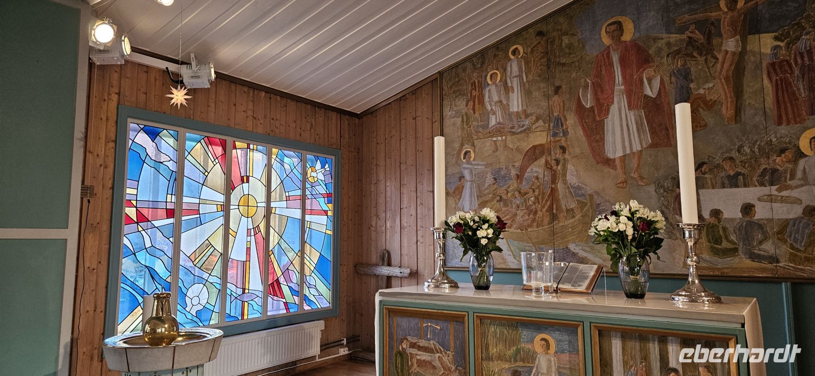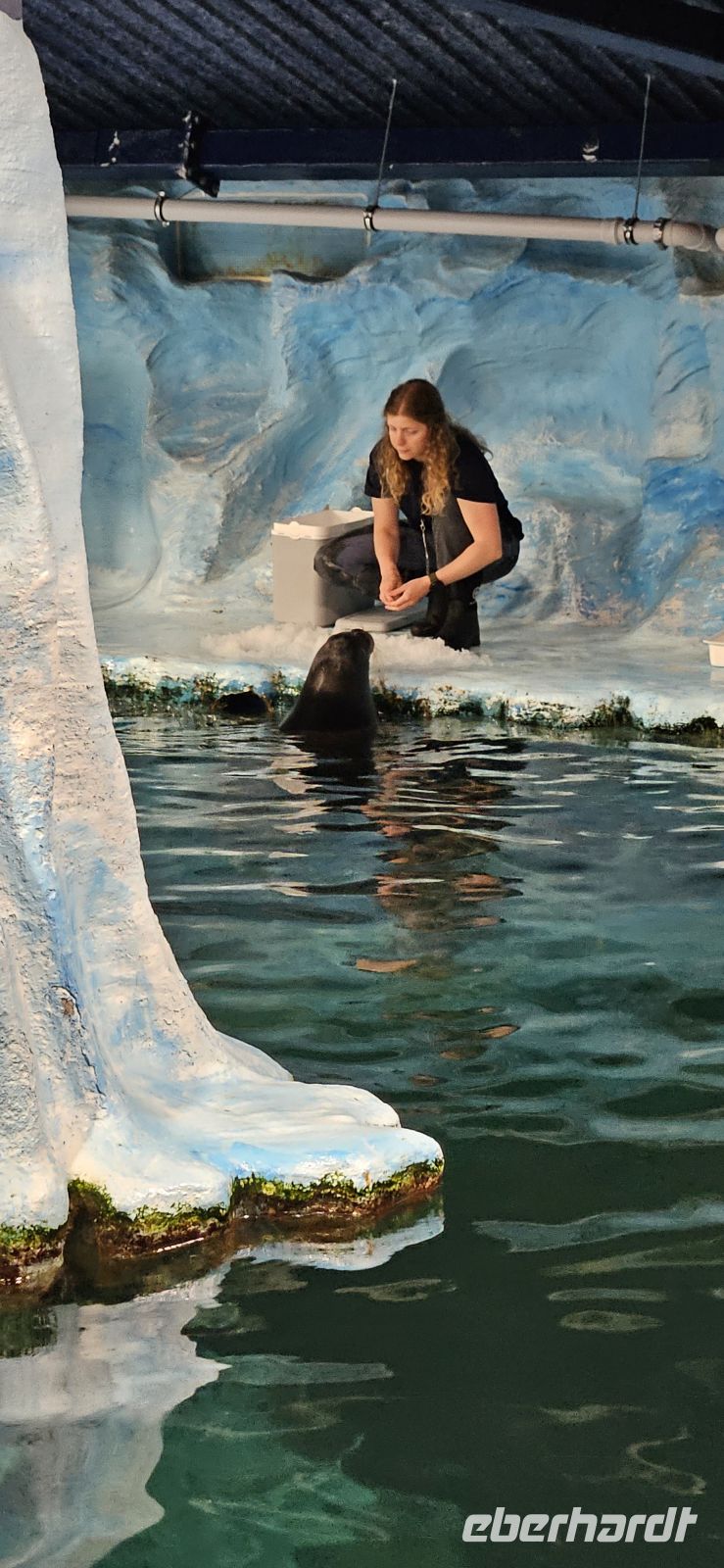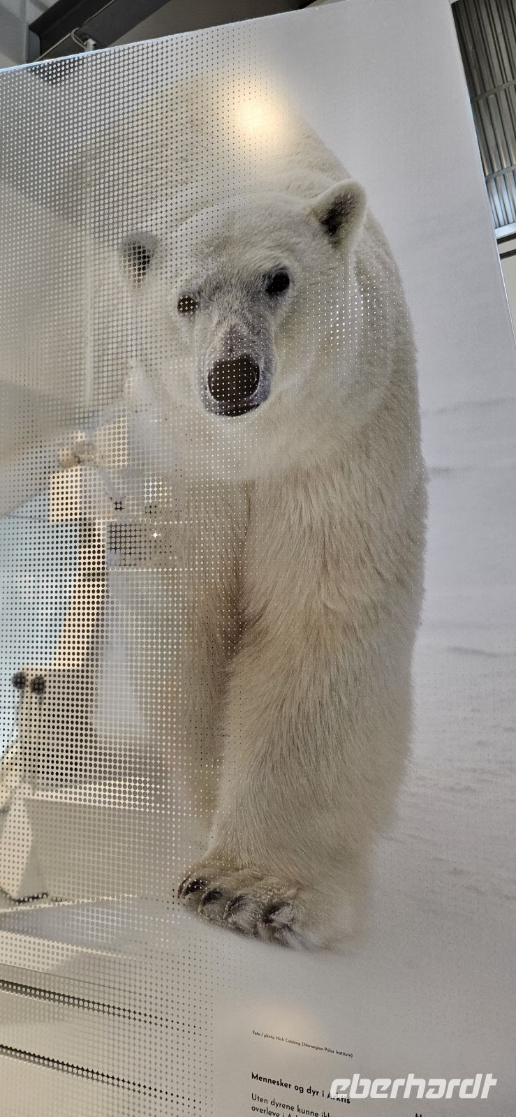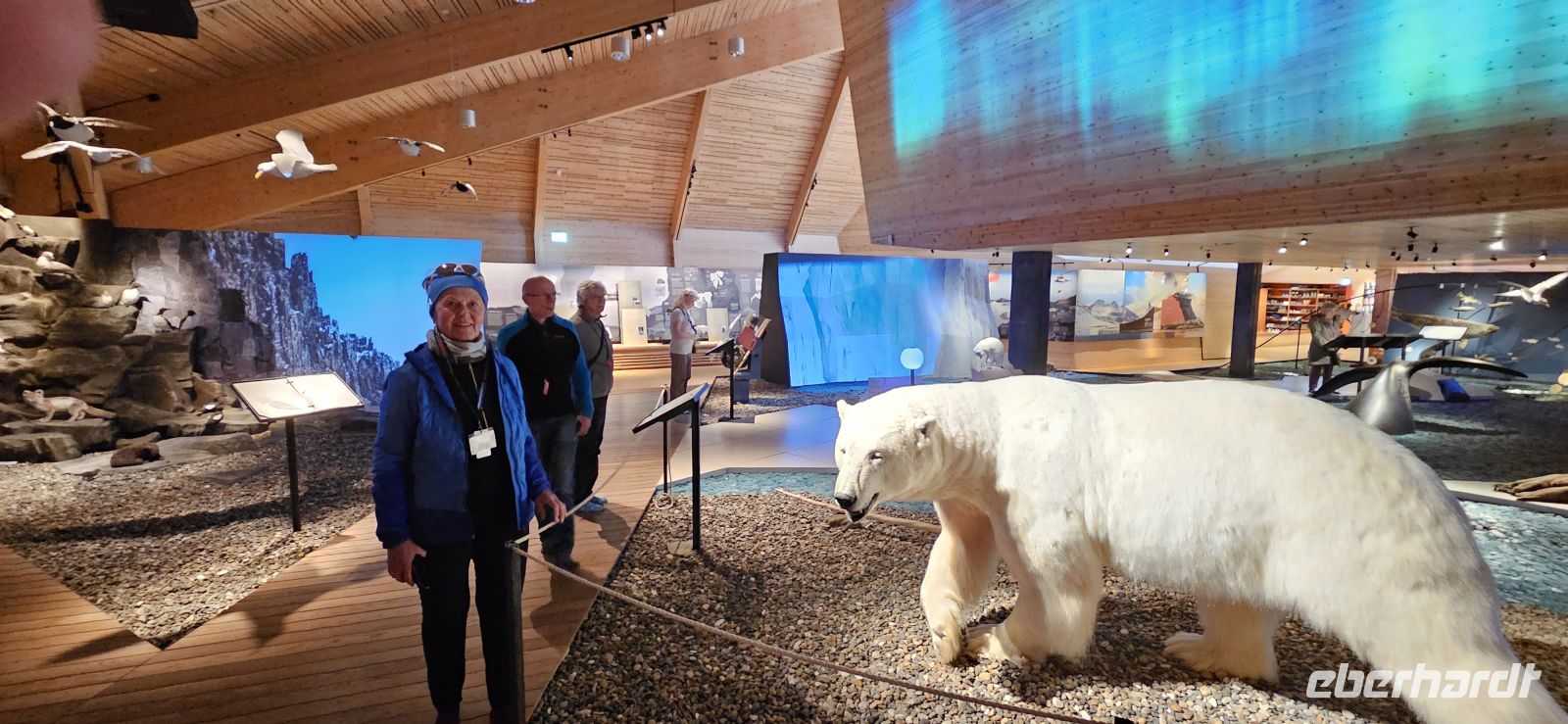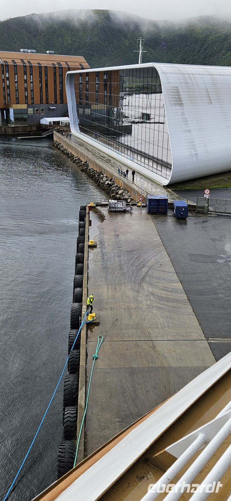 Bereits 8 Uhr während des Frühstücks erreichten wir Tromsö und machten im Stadthafen fest. So konnten wir problemlos von Bord gehen und die Stadt zu Fuss erkunden. Nach 9 Uhr begannen unsere Ausflüge in Tromsö und ich nahm mit vielen Singles unserer Gruppe am Ausflug Tromsö, die arktische Hauptstadt teil. Wir fuhren über die Brücke aufs Festland und dort mit der Fjellheisen Gondel in nur 4 Minuten hinauf auf den 421 Meter hohen Storsteinen. Eine fantastische Aussicht auf die Tromsinsel mit dem Zentrum von Tromsö lag uns zu Füssen und das Wetter gab alles - Wind, leichter Nieselregen, Sonne, Regenbogen und viele Fotomotive konnten so eingefangen werden. Der ständige Wetterwechsel machte den Aufenthalt auf dem Berg so interessant. Mit der Gondel schwebten wir dann wieder hinunter und fuhren ein kurzes Stück mit dem Bus bis zur Eisemeerkathedrale. Dieser imposante Bau war heute sehr stark besucht und so machten wir kurz unsere Fotos und fuhren danach über die Brücke zurück auf die Tromsinsel. Dort stand der Besuch von Polaria noch auf dem Programm. Wir kamen gerade rechtzeitig im großen Kinosaal an und sahen einen eindrucksvollen Film über die Tierwelt und die Landschaft von Spitzbergen. Das war eine gute Einstimmung auf unser nächstes Ziel und natürlich den Höhepunkt unserer Reise überhaupt. Danach blieb Zeit für individuelle Erkundungen im Polaria. In vielen Aquarien konnte man die hier in der Arktis lebenden Fische bewundern und zum Schluss noch der Robben Fütterung beiwohnen. Eine Rundfahrt durch das Zentrum von Tromsö beendete unseren Ausflug. Danach gab es Mittagessen an Bord und bis zum Ablegen 16 Uhr konnte jeder die Stadt nochmals individuell erkunden. Nach dem Ablegen folgten ein Stopp zum Beladen mit Gütern für Spitzbergen und ein Stopp zum Betanken unseres Schiffes. Derweil nahmen wir wieder unser leckeres Abend Menue ein.