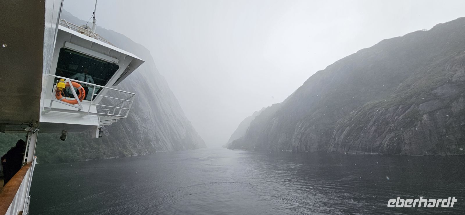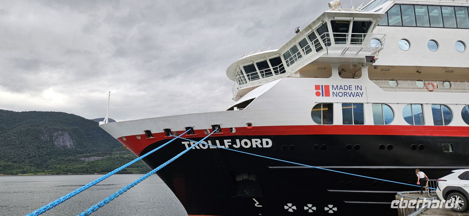 Weiter gings durch die Innenstadt zum neuen Fischmarkt und durch den traditionellen Fischmarkt hinüber zum Bryggenviertel. Diese wohl bekannteste Sehenswürdigkeit von Bergen erkundeten wir ganz intensiv und spazierten durch verschiedene Gassen. Am Ende jeder Gasse gab es ein Gebäude, in dem Feuer gemacht werden durfte und wo man sich zum essen traf. Danach sahen wir die deutsche Kirche und über die Hauptstrasse hinter Bryggen liefen wir zur Talstation der Floyenbahn. Noch ein kleiner Schlenker durch die Altstadt, am Denkmal für Holbein vorbei, erreichten wir die neuen Fischhallen und dort wartete unser Bus. Der Busfahrer fuhr dann nicht direkt zum Hurtigruten Terminal, sondern zeigte uns noch die Innenstadt. So sahen wir die Edward Grieg Konzerthalle ganz aus der Nähe und konnten zumindest einen kurzen Blick zum blauen Stein und zum Konzert Pavilion im Zentrum erhaschen. Im Hurtigruten Terminal gaben wir beim Checkin unsere Koffer ab und begaben uns mit dem Handgepäck zur Sicherheitsunterweisung und dann gleich an Bord von MS Trollfjord. Wir wurden herzlich willkommen geheissen und begaben uns sogleich zum Mittagessen. Dabei entdeckten wir auch schon die für unsere Gruppe reservierten Tische . Endlich sitzen und das erste Essen an Bord geniessen ! 14 Uhr waren unsere Kabinen bezugsfertig und bereits 14.30 Uhr trafen wir uns auf Deck 9, um mit einem Glas Sekt auf unsere Kreuzfahrt anzustoßen. Leider regnete es beim Ablegen, aber das konnte unsere Vorfreude nicht trüben. Um 15 Uhr trafen wir uns dann zum ersten mal beim Expeditionsteam auf Deck 5 und da informierte uns Leo über alles Wichtige an Bord. Nun richtete sich jeder in seiner Kabine ein und 18 Uhr trafen wir uns wieder zum Abendessen im Flora Restaurant. Wir sassen lange zusammen und probierten auch schon mal den für Norwegen typischen Aquavit. Einige liessen den Tag in der Bar ausklingen. Die meisten aber freuten sich auf ihr Bett. Unser Schiff glitt sanft über das Meer und schaukelte uns in den Schlaf.