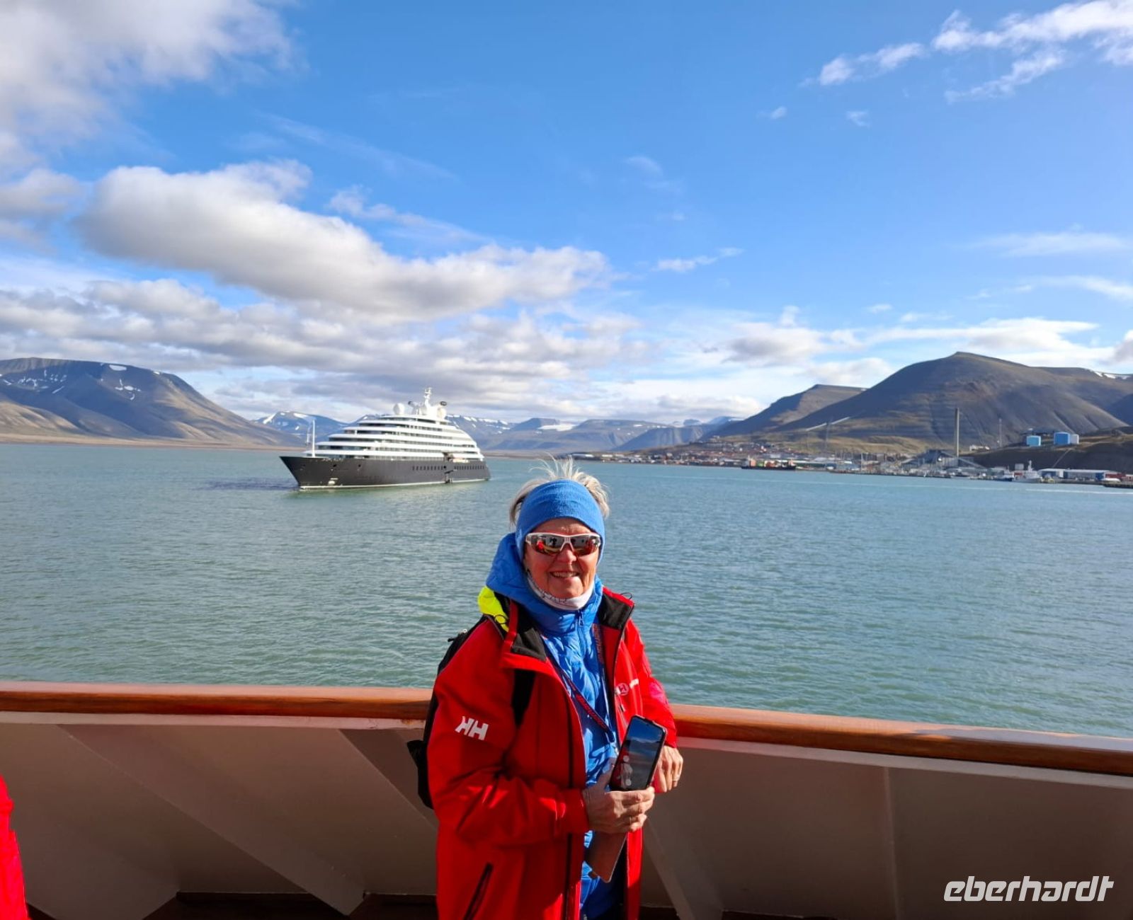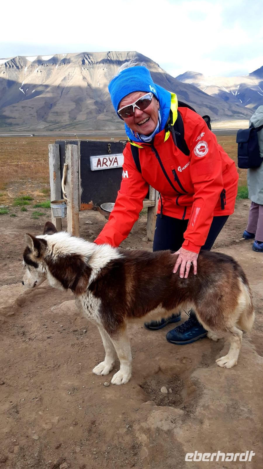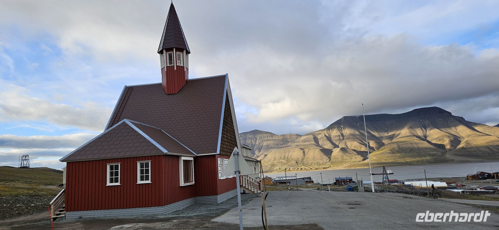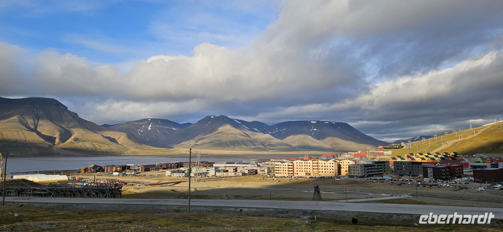 15 Uhr legten wir in Longyerbyen an und da hatten wir ganz verschiedene Ausflüge gebucht. Ich nahm am Ausflug Geschichte und Wildnis Spitzbergen teil. Wir wurden im Bus von Julia englisch und deutschsprachig betreut und begannen unsere Besichtigung im Svalbord Museum. In Spitzbergen ist es üblich, dass man beim Betreten eines Gebäudes die Schuhe ausziehen muss und das war auch im Museum notwendig. Danach fuhren wir zum Camp Barentz und wurden von der Eisbären Schutz Frau Katarina empfangen. Sie trug ein Gewehr, die Munition dazu in der Hosentasche und eine Schreckschusspistole. Allerdigs wurde der letzte Eisbär in Longyerabyen im Februar diesen Jahres gesichtet. Das Camp Barentz gehört zu Green Dog Svalbard und unterhält mehrere Hundeschlitten Höfe. Wir waren bei den "Senioren" der Schlittenhunde und wir durften die Tiere nach einer interessanten Vorstellung des Unternehmens auch verwöhnen. Dann gingen wir in eine gemütliche Holzhütte mit Feuer in der Mitte und bekamen frische Pfannkuchen mit Marmelade und ein heisses Getränk. Julia bot dann eine informative Präsentation über die Eisbären mit wunderbaren Fotos. Auf dem Rückweg gab es einen Fotostopp am Eisbären Warnschild und dann bestand die Möglichkeit, im Stadtzentrum auszusteigen. Das nutzten unsere Gäste und wir gingen zu Fuss ins Stadtzentrum, besuchten den Supermarkt und hatten die Möglichkeit, mit dem Shuttlebus zurück zum Schiff zu fahren. Zwei Gäste gingen mit mir noch zur Kirche. Dort mussten wir wieder die Schuhe ausziehen. In der Kirche gab es einen Gemeindesaal, wo man auch was essen und trinken konnte und im kleinen Shop hätten wir auch handgefertigte Produkte von Partner Gemeinden in Südafrika und Betlehem erwerben können. Auf dem Rückweg zum Schiff genossen wir Longyerabyen in der Abendsonne und an Bord dann unser wohlverdientes Abendessen. Heute war unser Bergfest und bei der Mitternachtssonne hätten wir bis zum Morgen durchfeiern können. Aber wir brauchten etwas Kondition auch für morgen in Ny Alesund - dem zweiten Hafen auf Spitzbergen.