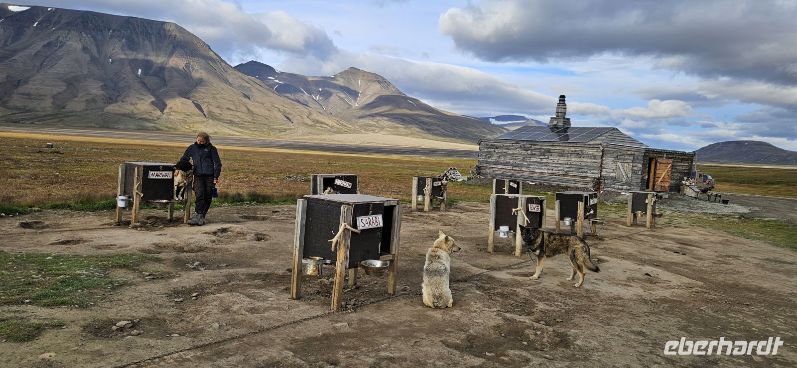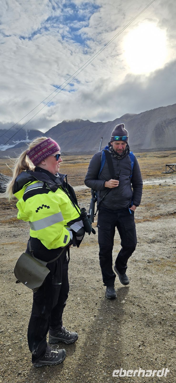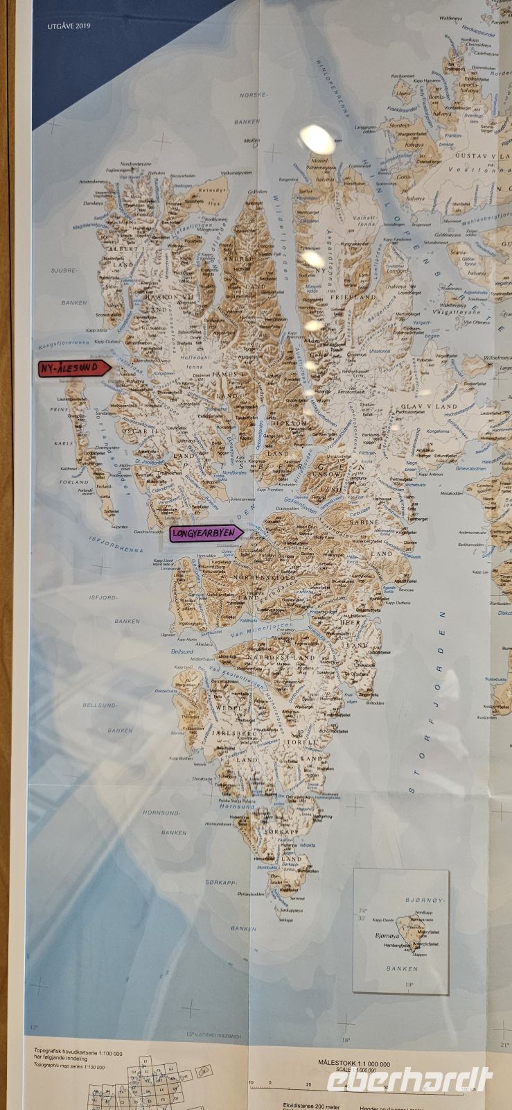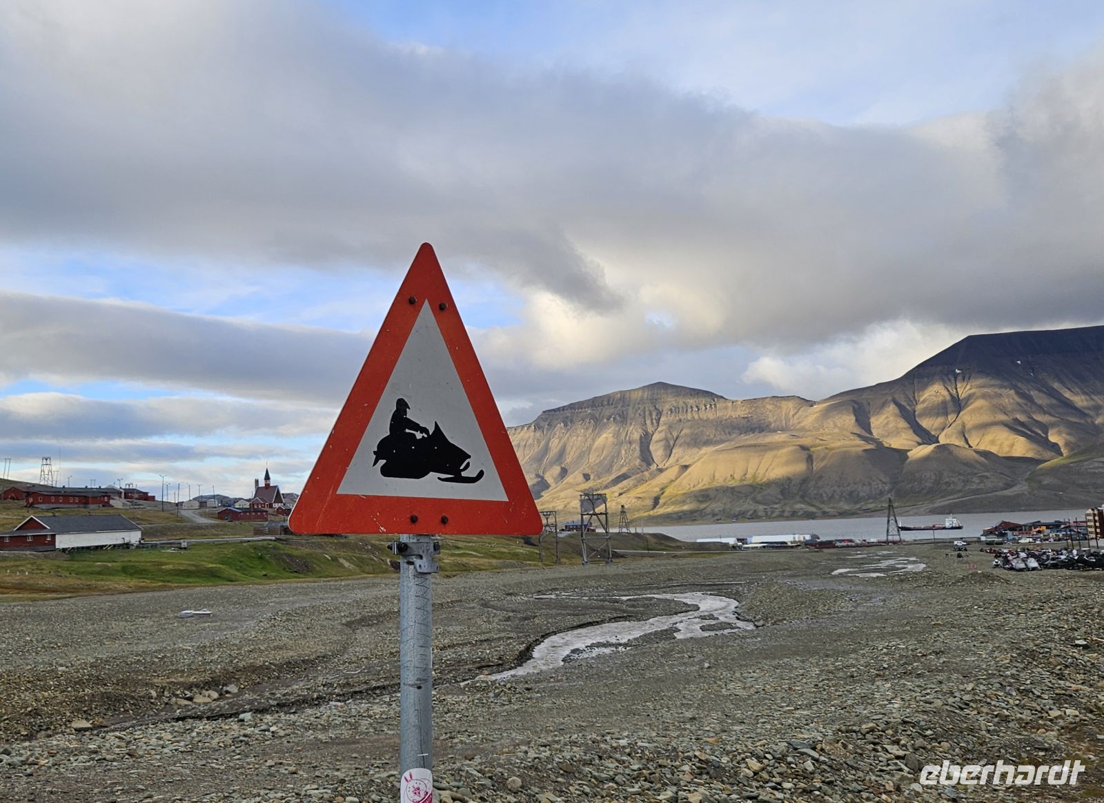 15 Uhr legten wir in Longyerbyen an und da hatten wir ganz verschiedene Ausflüge gebucht. Ich nahm am Ausflug Geschichte und Wildnis Spitzbergen teil. Wir wurden im Bus von Julia englisch und deutschsprachig betreut und begannen unsere Besichtigung im Svalbord Museum. In Spitzbergen ist es üblich, dass man beim Betreten eines Gebäudes die Schuhe ausziehen muss und das war auch im Museum notwendig. Danach fuhren wir zum Camp Barentz und wurden von der Eisbären Schutz Frau Katarina empfangen. Sie trug ein Gewehr, die Munition dazu in der Hosentasche und eine Schreckschusspistole. Allerdigs wurde der letzte Eisbär in Longyerabyen im Februar diesen Jahres gesichtet. Das Camp Barentz gehört zu Green Dog Svalbard und unterhält mehrere Hundeschlitten Höfe. Wir waren bei den "Senioren" der Schlittenhunde und wir durften die Tiere nach einer interessanten Vorstellung des Unternehmens auch verwöhnen. Dann gingen wir in eine gemütliche Holzhütte mit Feuer in der Mitte und bekamen frische Pfannkuchen mit Marmelade und ein heisses Getränk. Julia bot dann eine informative Präsentation über die Eisbären mit wunderbaren Fotos. Auf dem Rückweg gab es einen Fotostopp am Eisbären Warnschild und dann bestand die Möglichkeit, im Stadtzentrum auszusteigen. Das nutzten unsere Gäste und wir gingen zu Fuss ins Stadtzentrum, besuchten den Supermarkt und hatten die Möglichkeit, mit dem Shuttlebus zurück zum Schiff zu fahren. Zwei Gäste gingen mit mir noch zur Kirche. Dort mussten wir wieder die Schuhe ausziehen. In der Kirche gab es einen Gemeindesaal, wo man auch was essen und trinken konnte und im kleinen Shop hätten wir auch handgefertigte Produkte von Partner Gemeinden in Südafrika und Betlehem erwerben können. Auf dem Rückweg zum Schiff genossen wir Longyerabyen in der Abendsonne und an Bord dann unser wohlverdientes Abendessen. Heute war unser Bergfest und bei der Mitternachtssonne hätten wir bis zum Morgen durchfeiern können. Aber wir brauchten etwas Kondition auch für morgen in Ny Alesund - dem zweiten Hafen auf Spitzbergen.