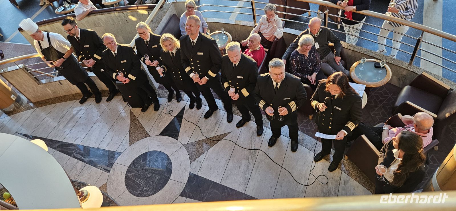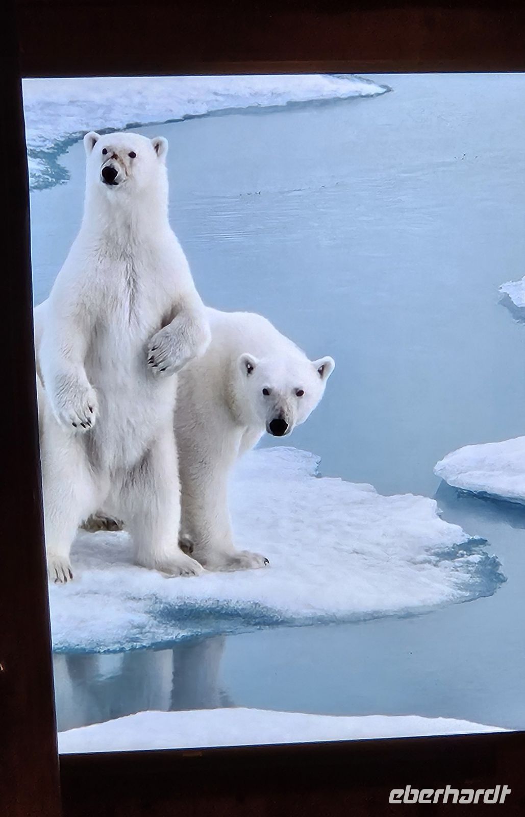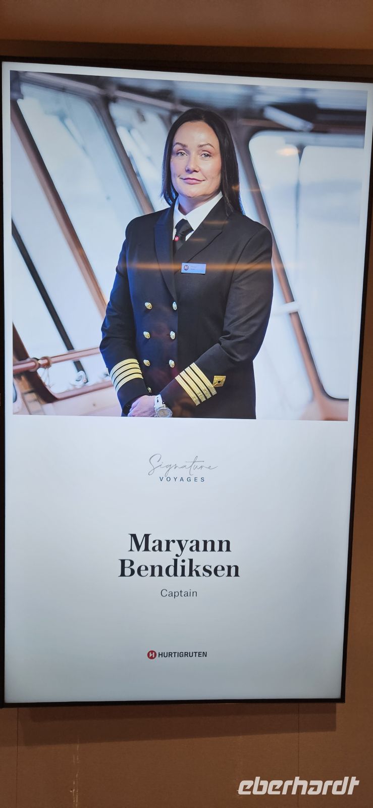 Heute war wieder ein Tag zum Ausschlafen und Relaxen. Am Vormittag standen uns Passagieren 4 Crew Mitglieder Rede und Antwort und nun wissen wir, dass 410 Passiere an Bord sind und uns 102 Crewmitglieder umsorgen. In Longyerabyen wechselte der Kapitän und nun ist Maryann Bendiksen die Chefin des Schiffes. Nach dem Mittagessen stellte Leo vom Expeditionsteam die Ausflüge südgehend vor und danach sass unsere Gruppe noch zusammen, um das eine und andere zu besprechen. Am späten Nachmittag war der alltägliche Treff mit dem Expeditionsteam diesmal zum Thema Nordkap. Abendessen gab es wieder als 3 Gang Menue. Nach 22 Uhr unterhielten uns 2 Crew Mitglieder mit klassischer Musik.