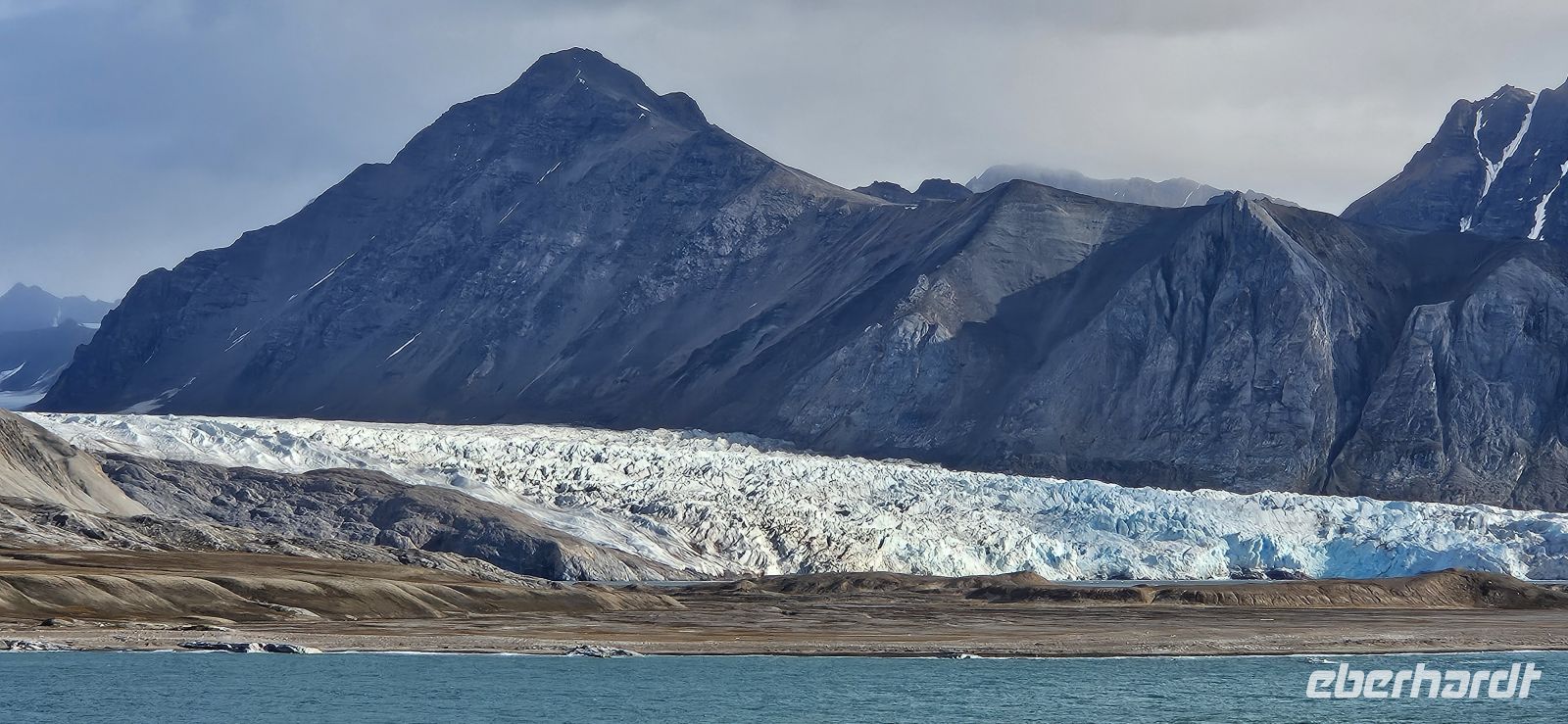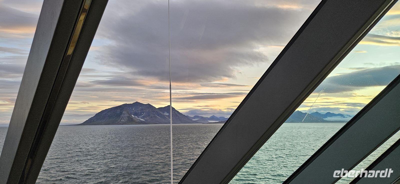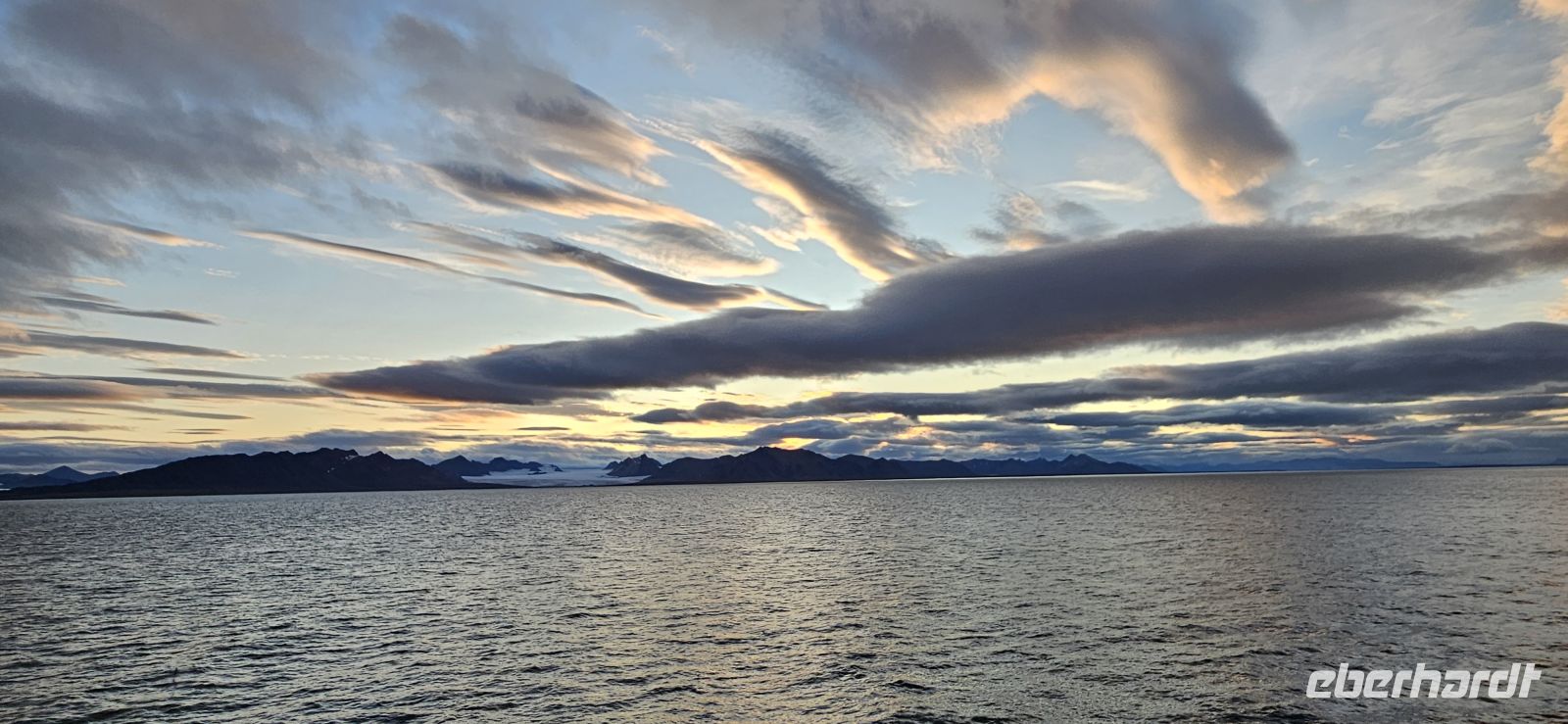 Über Nacht hatten wir die Küste von Svalbord erreicht und fuhren immer weiter nach Norden mit Blick auf die Hauptinsel Spitzbergen. Hier ist noch immer die Zeit der Mitternachtssonne und so sahen wir die Sonne rund um die Uhr wenn sie nicht gerade von Wolken verdeckt wurde.