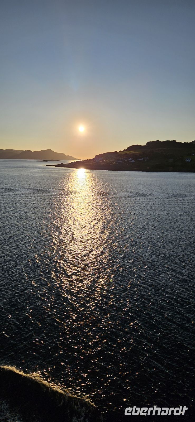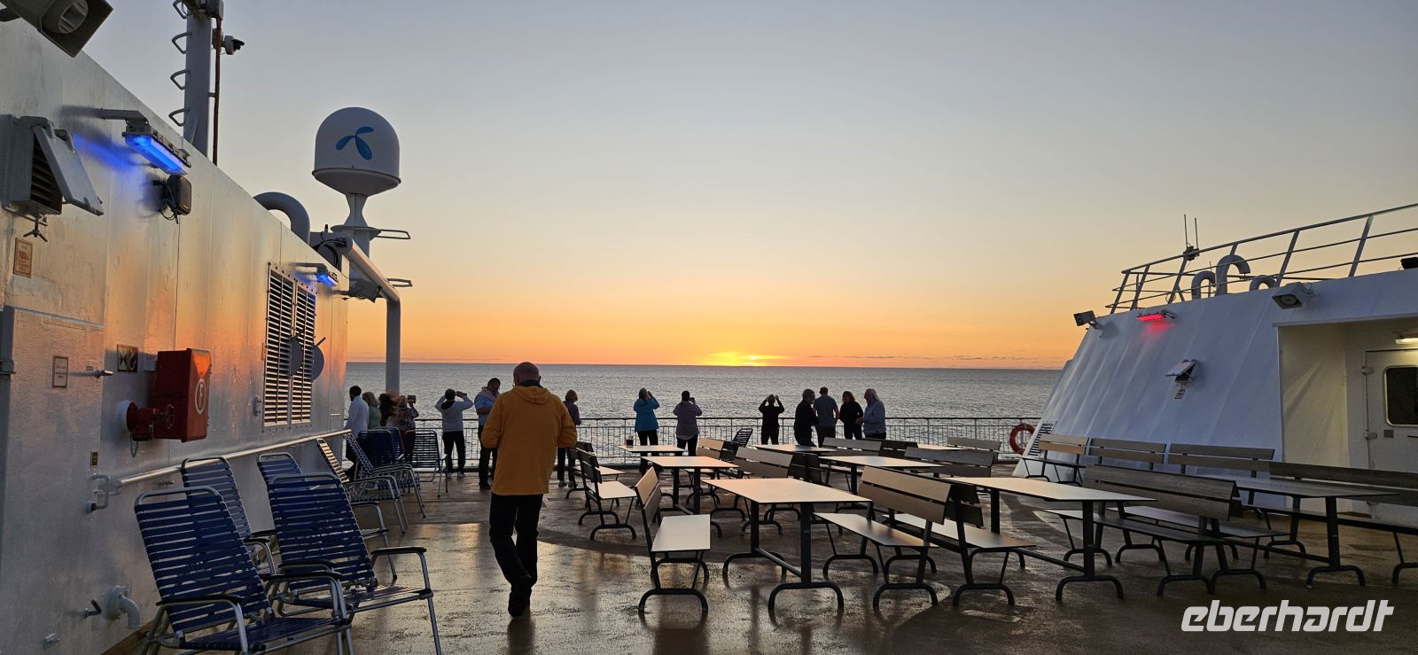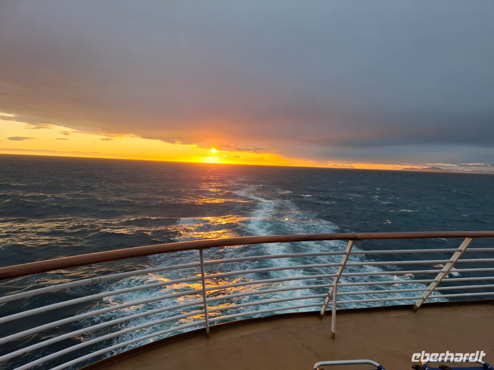Wieder zurück an Bord wurden nun Fotos ausgetauscht und das Erlebte ausgewertet. Nach dem Ablegen 17 Uhr präsentierte uns der Chefkoch Königskrabben mit einer besonderen Sose aus Seetang. Danach gab es wieder Abendessen als 3 Gang Menue. Den nochmals hellen Abend liessen wir in der Bar auf Deck 9 ausklingen. Und Mitternacht verwöhnte uns die Sonne vorerst ein letztes Mal.