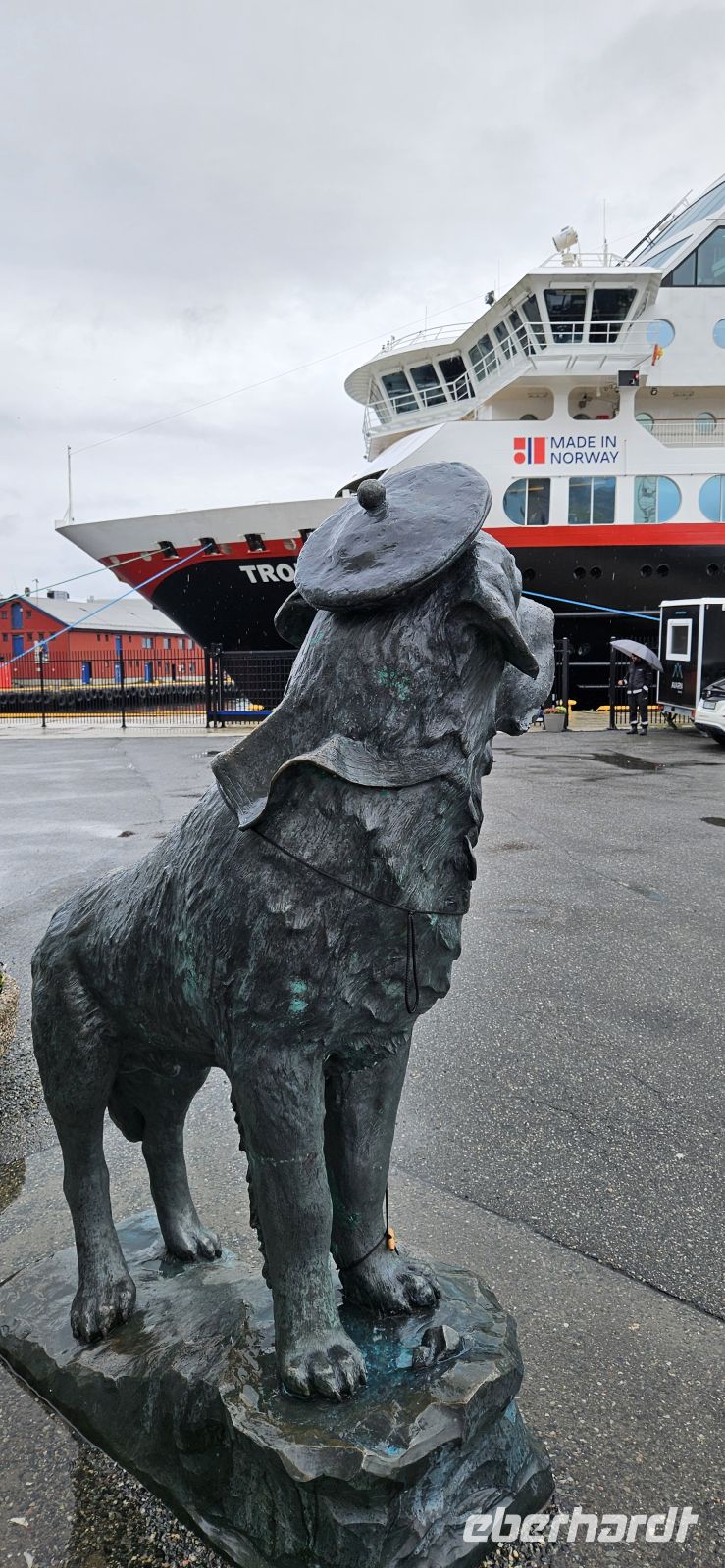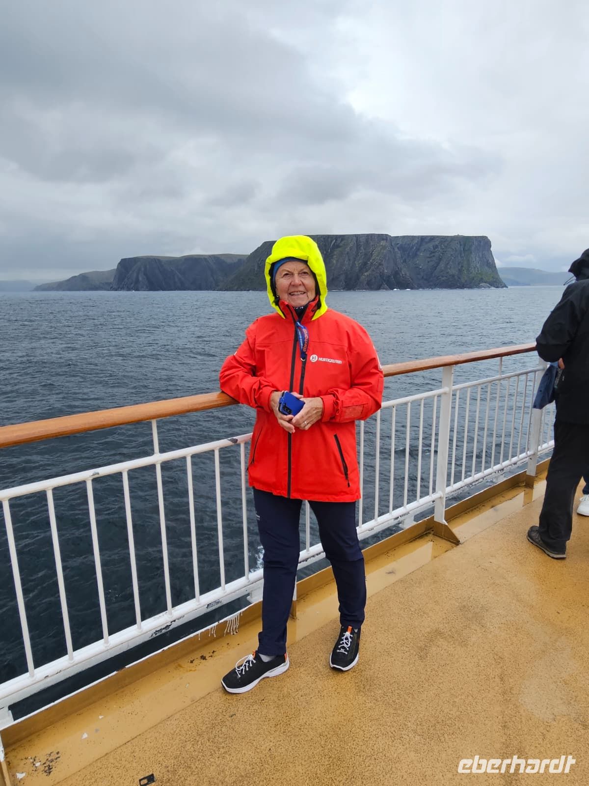 Nach dem Frühstück war viel Zeit für eigene Unternehmungen und dann trafen wir uns beim Expeditionsteam diesmal zusammen mit den norwegischen Passagieren. Wir sahen den Film von Ny Alesund und es gab eine Vorschau auf die Insel Senja. Dann wurden wir nach draußen auf Deck 9 gerufen und fuhren am Nordkap Felsen vorbei. Die Geschichte der Entdeckung des Nordkaps als nördlichster Punkt des europäischen Festlandes wurde vorgetragen und wir machten trotz schlechten Wetters viele Fotos. Das Mittagessen begann schon früher, weil gleich nach dem Anlegen in Honningsvag die ersten Ausflüge starteten. Ich begab mich mit einigen Gästen auf eine kleine Spazierrunde durch Honningsvag - zum Leuchtturm, zur Kirche und durch die Hauptstrasse wieder zurück zum berühmten Hund Bamse gleich neben unserem Schiff. Viele Geschäfte luden zum Stöbern ein. Nach und nach kamen die Ausflügler zurück und zwischen 18 und 20 Uhr konnten wir das Abendessen im Flora Restaurant geniessen. Nach dem Ablegen gab es einen Interessenpunkt auf Deck 9 zum Mageroysundet. Dort queren alljährlich im Herbst die Rentiere schwimmend den Sund, nachdem sie sich über den Sommer auf Mageroy gestärkt haben. Zu später Stunde trafen wir uns am "Kaminfeuer" mit Leo zur Märchenstunde und bekamen 2 südnorwegische Märchen vorgelesen.