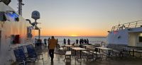 Heute am Sonntag konnten wir ganz entspannt ausschlafen und das Frühstück ausgiebig genießen. Die MS Trollfjord glitt sanft durch die Wellen und die Sonne zeigte sich hin und wieder. Wir vertrieben uns die Zeit mit Lesen, Stöbern im Bord Shop und einige spielten Karten. Auch spazieren oder Laufen auf Deck 6 wurde ausgiebig genutzt und der Besuch der Sauna ebenfalls. Dann war auch schon wieder Zeit fürs Mittagessen. Aber davor gab es auf Deck 9 eine leckere Probe vom Rentierschinken. Nach dem Mittagessen nutzte wieder jeder die Zeit zum Relaxen. 15 Uhr fand die tägliche Infoveranstaltung beim Expeditionsteam statt und da wurden wir schon mal ausführlich zu Spitzbergen unterrichtet. Die Bäreninsel Bjonoya erreichten wir vorzeitig bereits 17.30 Uhr. Sie trug einen mystischen Schleier, aber die Felsen am Südufer waren sehr gut zu erkennen. 18.30 Uhr gab es wie immer unser Abendessen als 3 Gang Wahlmenue. Am späteren Abend konnten wir einen Film über Roald Amundsen sehen oder an einem Musik Quiz teilnehmen. So verging der Seetag ganz entspannt und schneller als gedacht. Am Abend waren Delphine zu sehen ganz dicht bei unserem großen Schiff.