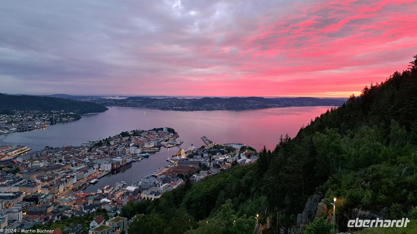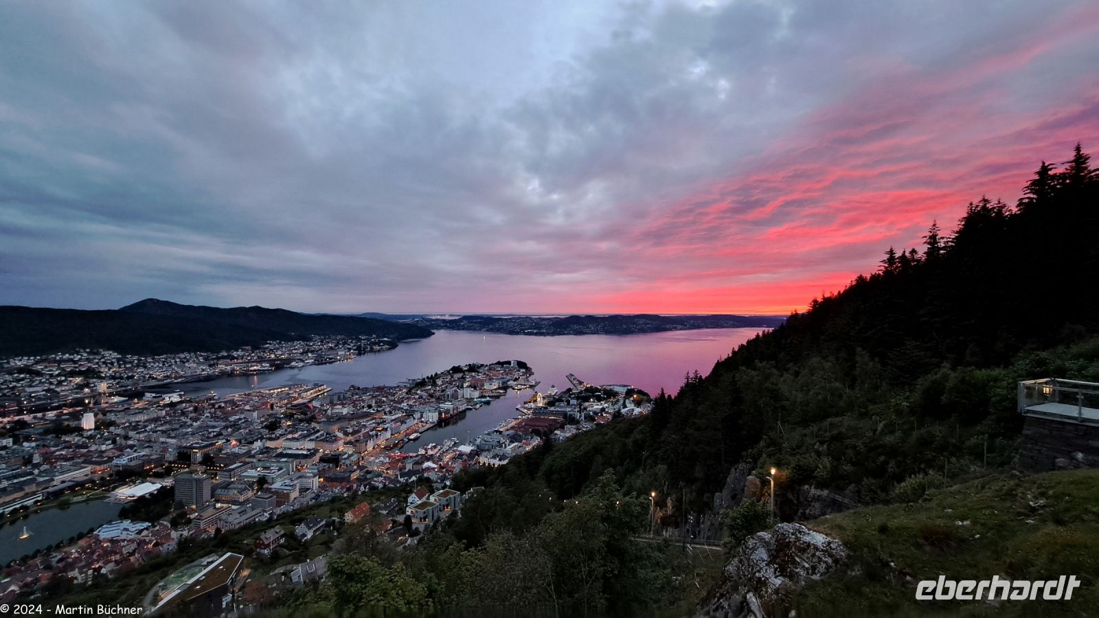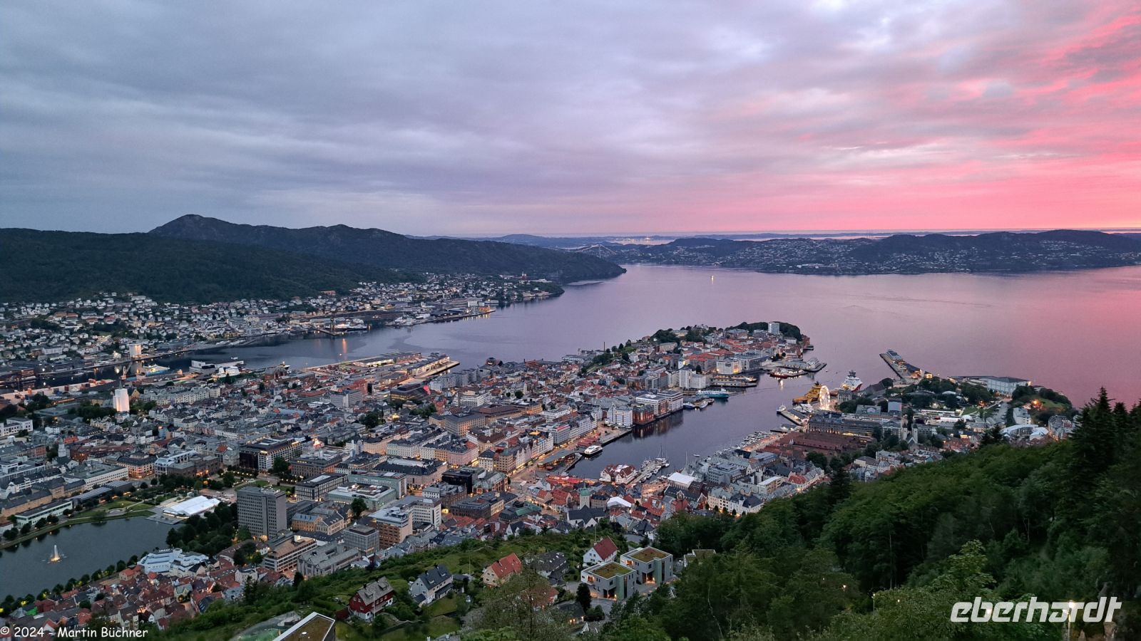 Nach einer Stärkung und einem ersten Kennlernen bei einem Abendessen schließen wir den Abend und Ankunftstag mit der Auffahrt zum „Fløyen“ ab. Die berühmte Standseilbahn bringt uns im romantischen Licht der Abenddämmerung auf einen der sieben Hausberge Bergens.