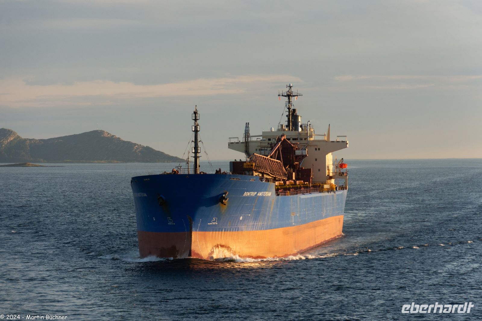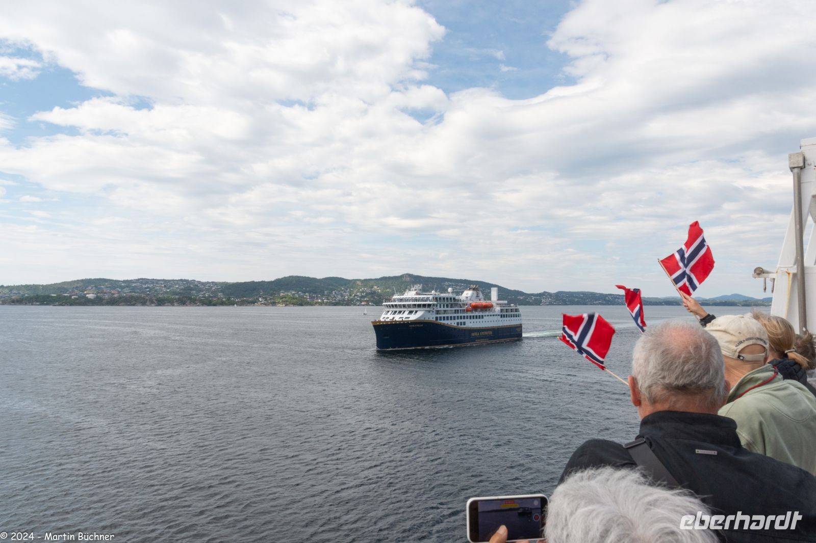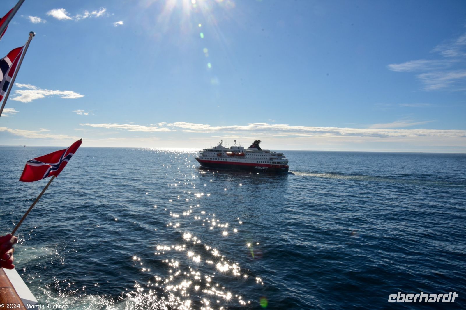 Am Morgen kommt uns die südwärts gehende M/S Otto Sverdrup entgegen, die als Nordkapp-Express sich auf dem Weg nach Hamburg befindet.