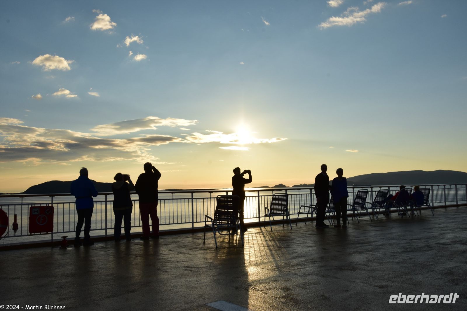 Am späten Abend verzieht sich der Nebel – strahlende Sonne und blauer Himmel – keine Wolken mehr. Und dass zu Mittsommer! Es ist Mittsommernacht – unvergesslich! Die Sonne geht nicht unter – denkt nicht mal daran – um Mitternacht steht sie hoch am Himmel wie in Mitteleuropa an einem Sommernachmittag. Alle sind gebannt von dieser Schönheit. Keiner kann sich motivieren ins Bett zu gehen.