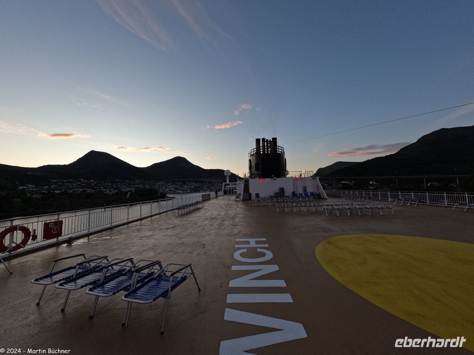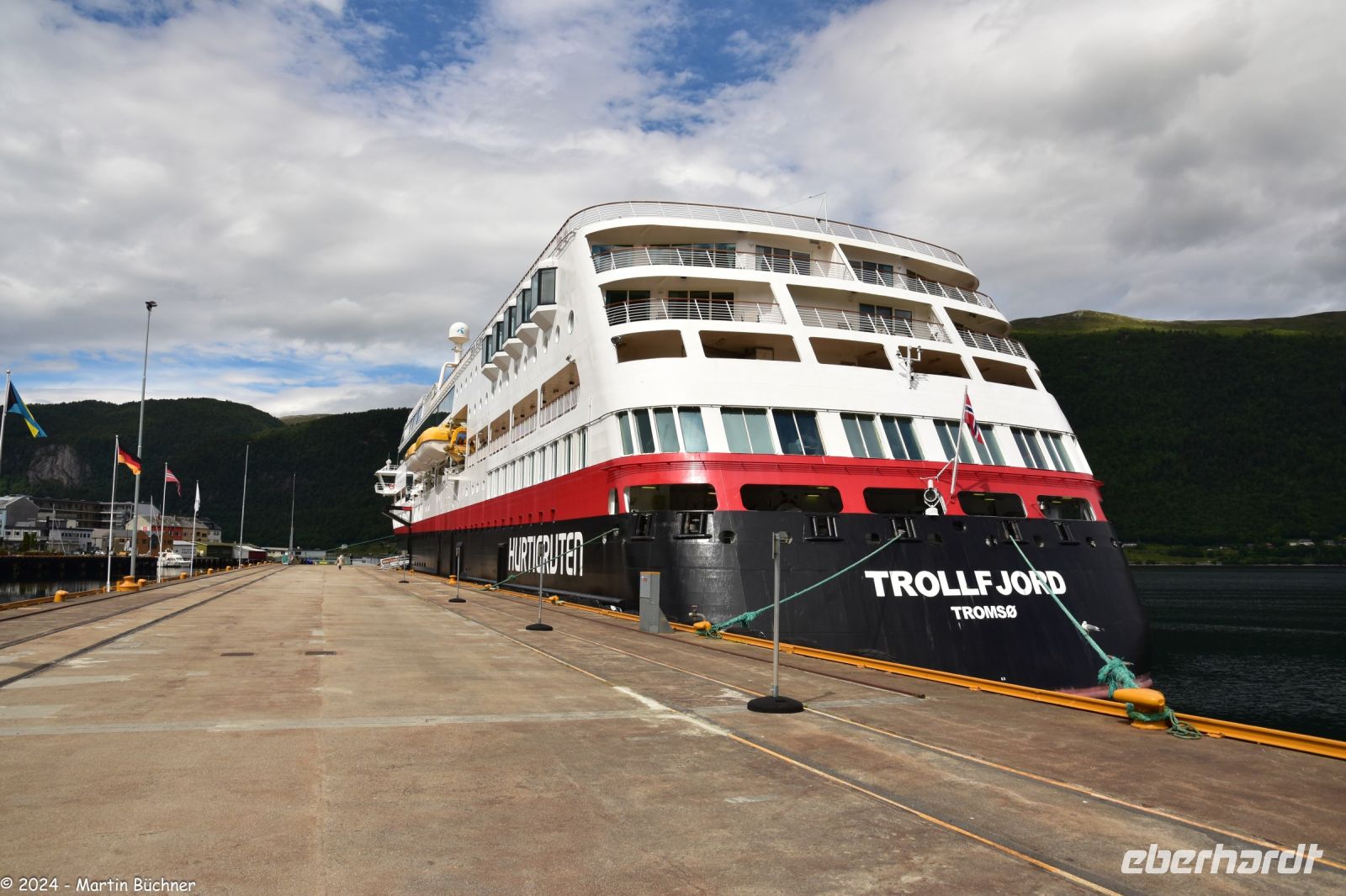 Ein Bustransfer bringt uns vom Hotel zum Jektvik Terminal, in dem die Einschiffung und Sicherheitsunterweisung für die M/S Trollfjord beginnt. Am frühen Nachmittag heißt es dann „den nordgående Svalbard-Express M/S Trollfjord er nå straks klar for avgang“ – „der nordwärts gehende Svalbard-Express ist zur Abfahrt bereit“.