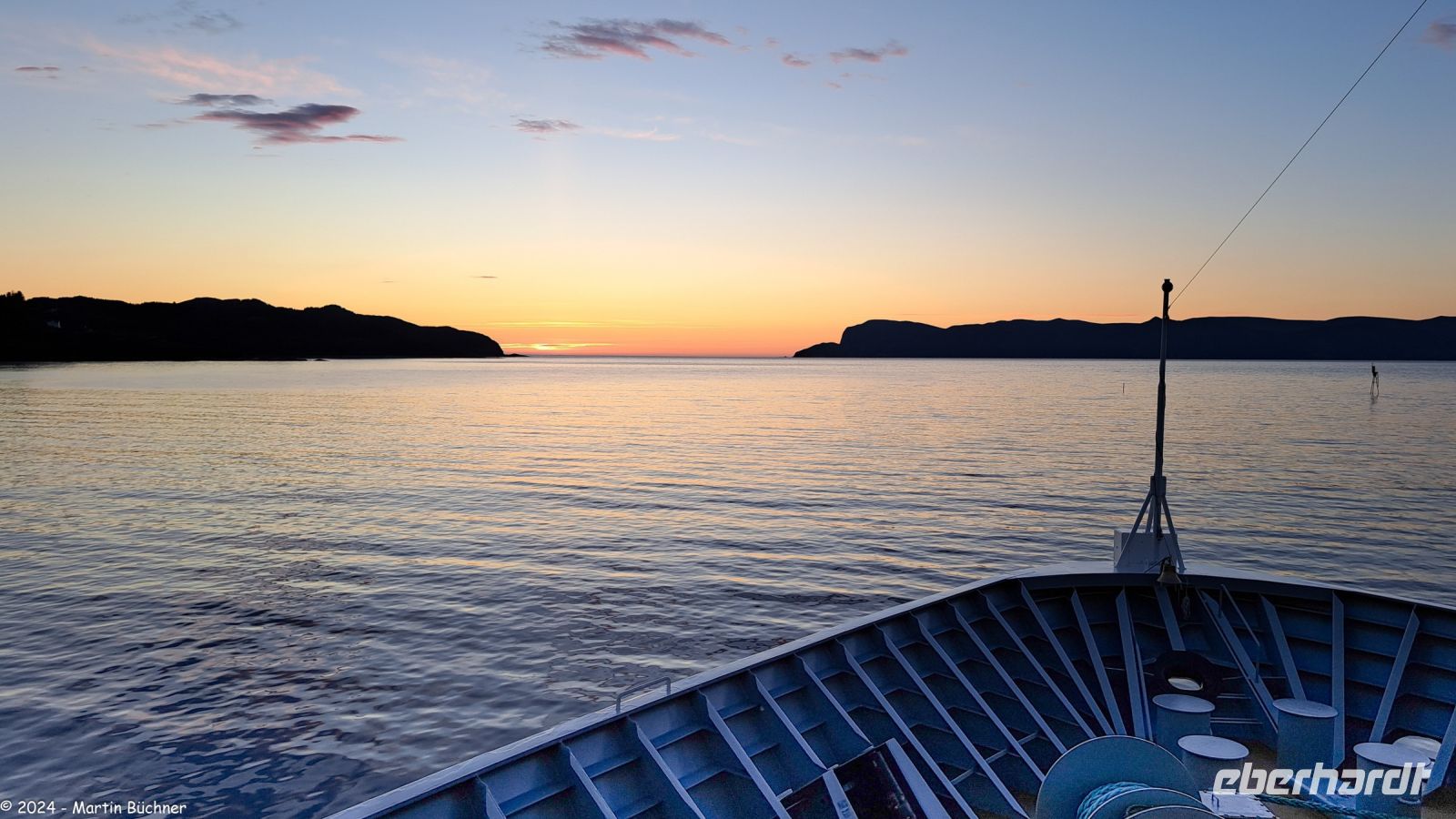 Gegen Mitternacht legen wir in Richtung Süden ab. Die Sonne kommt heraus, Mitternachtssonne! In Abwechslung mit den Regenschauern werden wir Zeuge eines unbeschreiblichen Regenbogens, der sich unterhalb der Horizontallinie zu einem Vollkreis schließt, doppelt selbstverständlich. Auch ich habe so etwas noch nie zuvor gesehen.