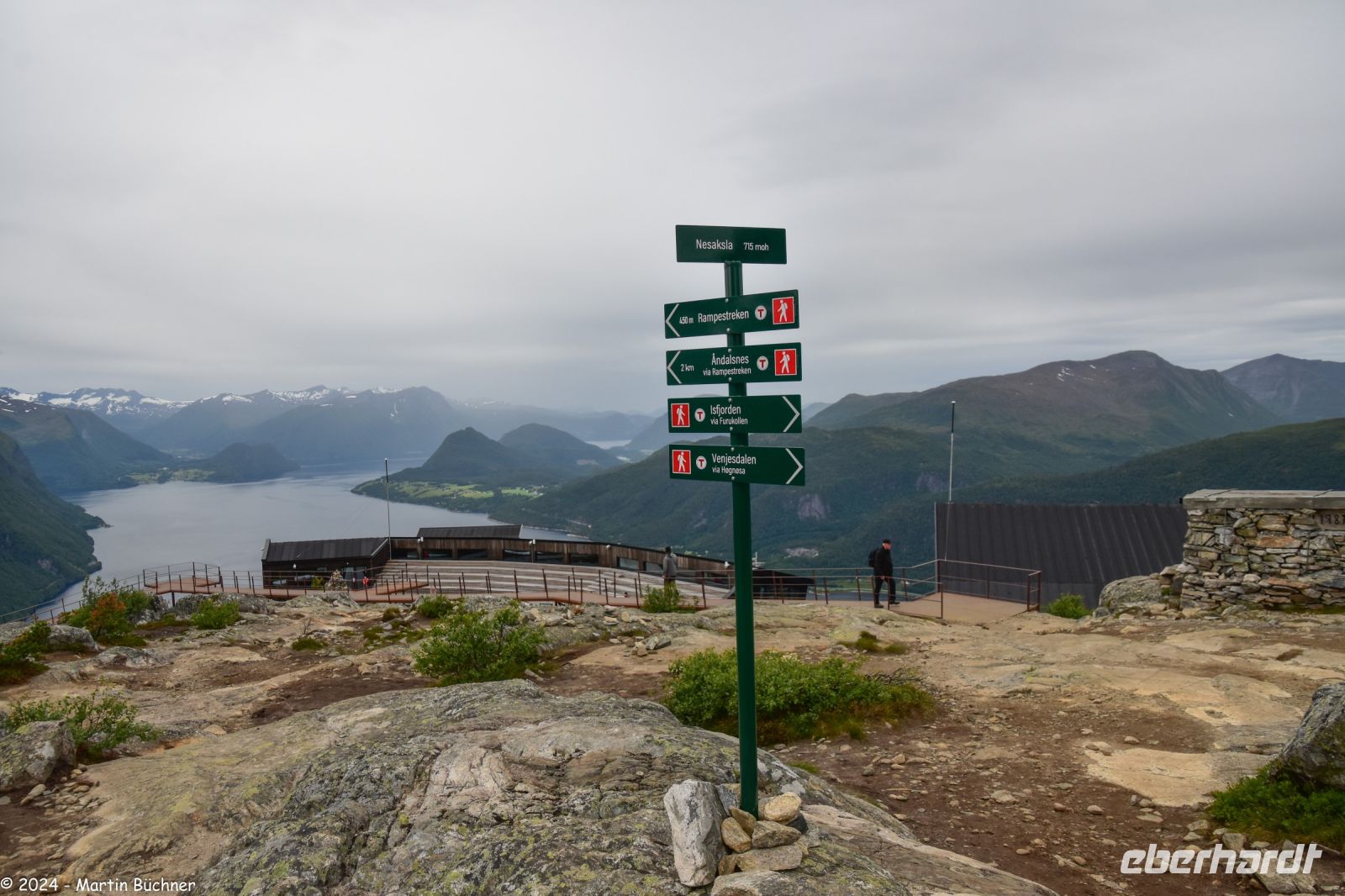 Der andere Teil der Gruppe nutzte die Gelegenheit, die nicht weniger spektakuläre Romsdalengondola zu nutzen, eine der wenigen Seilbahnen in Norwegen. Diese Seilbahn brachte uns hinauf zum Hausberg Nesaksla (715 m). Wer trittsicher ist, kann von hier kleinere Bergtouren unternehmen. Unter anderem beginnt hier ein Wanderweg über den Bergrücken Romsdalseggen in dessen Verlauf man schnall gut 1.200 Höhenmeter erreichen kann, aufgrund der nördlichen Breite definitiv hochalpines Gelände. Wir nutzen die Gelegenheit für eine kurze Wanderung, ebenso machen wir uns erstmals mir der nordisch-arktischen Vegetation vertraut.