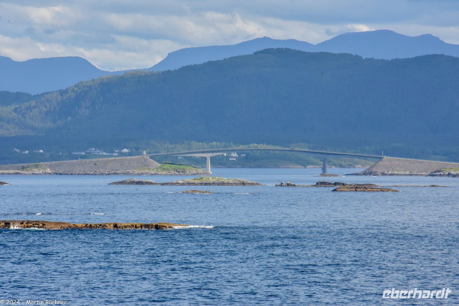 Von der Fahrrinne hat man einen Blick auf den „Atlanterhavsvegen“ – die Atlantikstraße. Ein gut 8 km langer Abschnitt der Fv 64, der über unzählige Schären, die mit zahlreichen Brücken verbunden sind, eine Straße durch den Atlantik bildet und die Öffnung des Lauvøyfjorden überwindet. Die Fv 64 stellt mit dem Atlanterhavstunnelen (Atlantiktunnel) eine Straßenverbindung zwischen Kristiansund und Molde her.