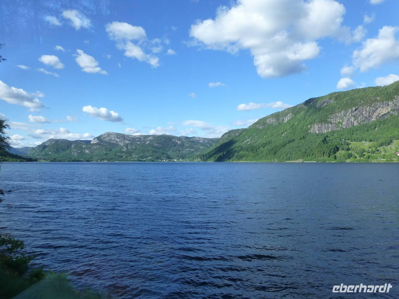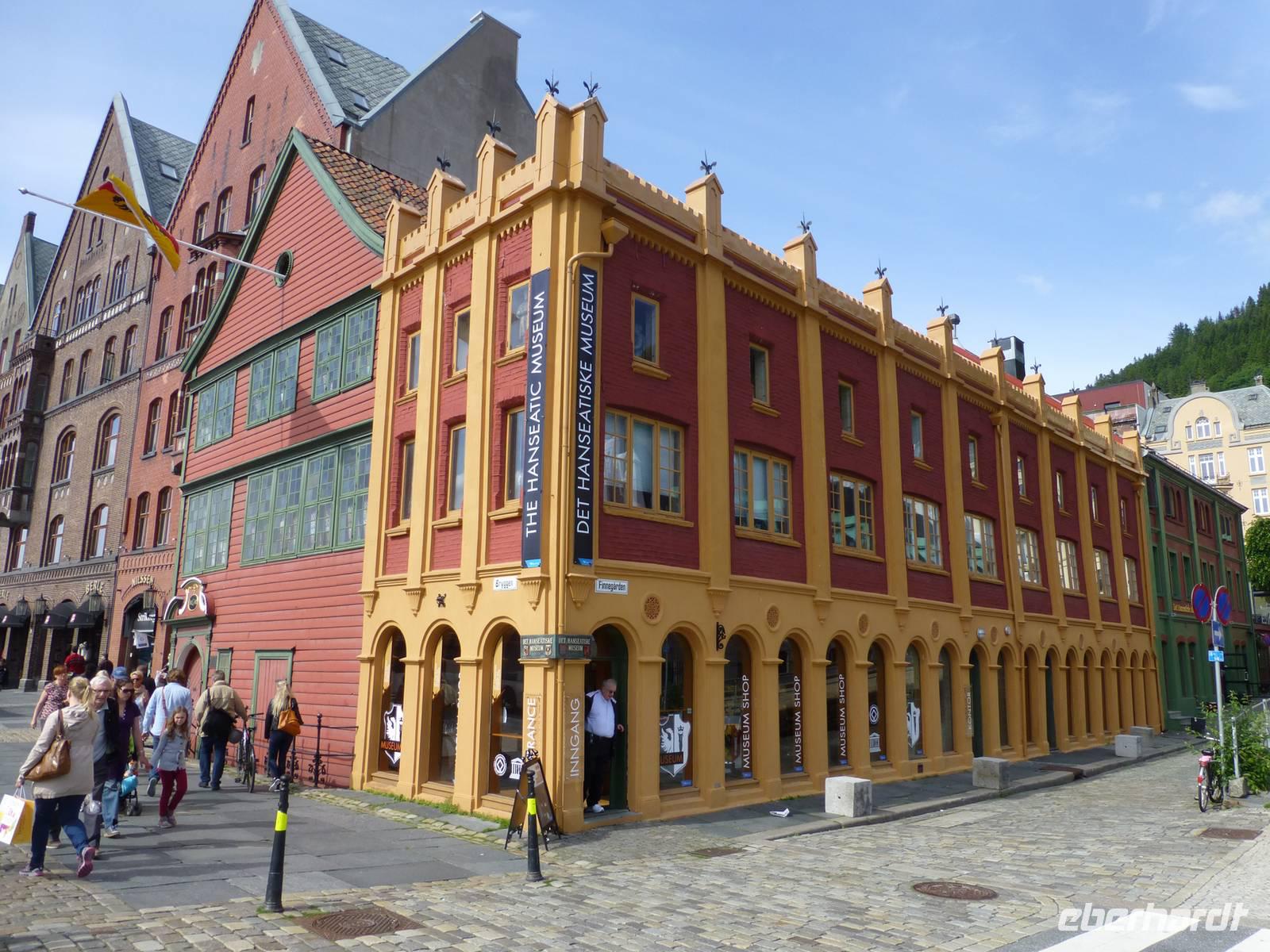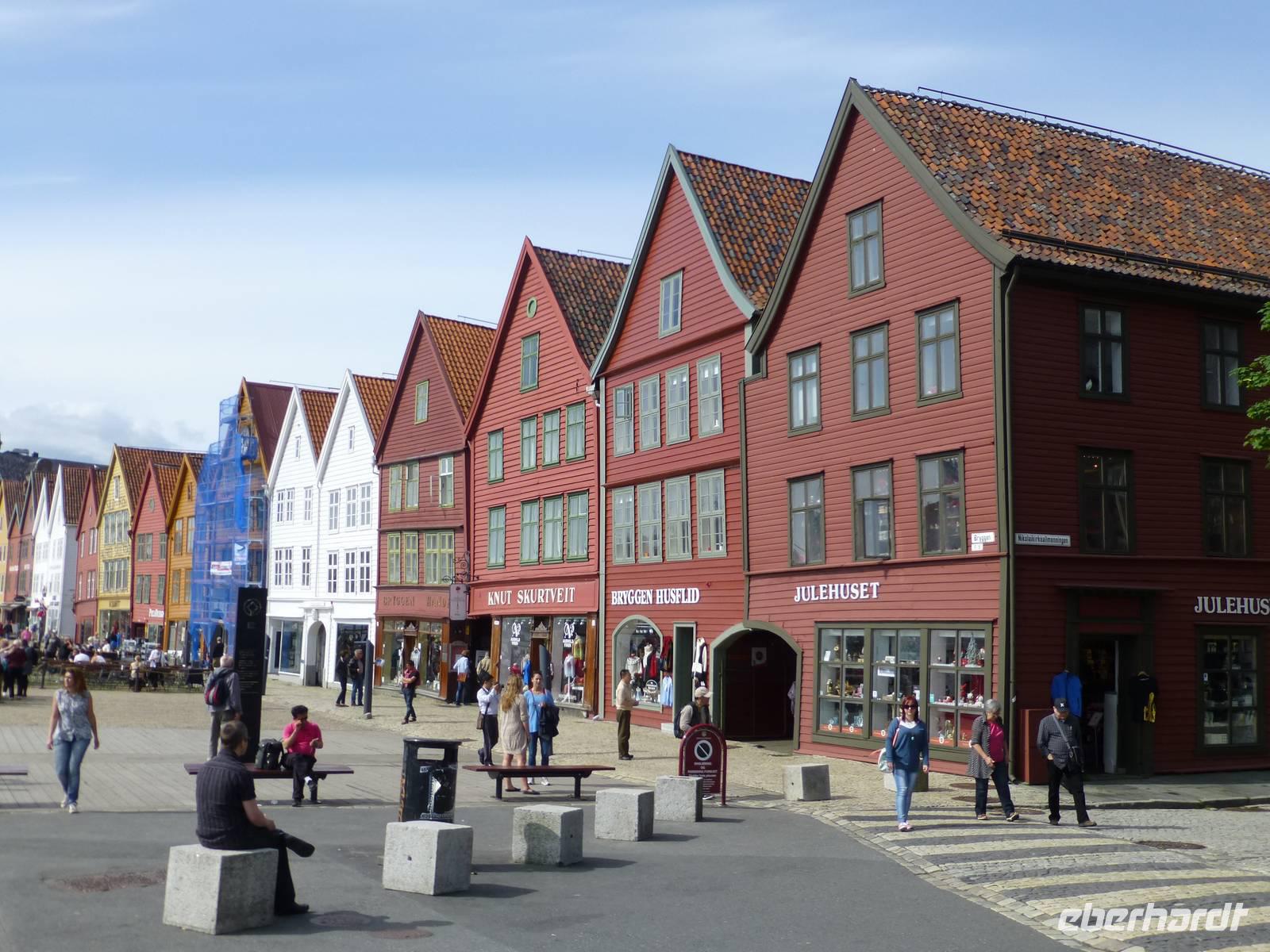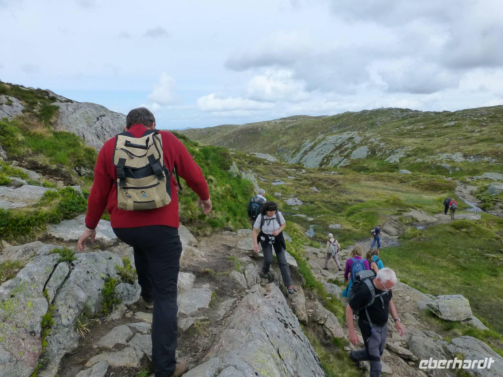 Heute verlassen wir Stavanger, unser Ziel ist die Stadt Bergen. Auf den gut 200 Kilometern bis dahin durchfahren wir mehrere einige Tunnel, welche bis zu 8 Kilometer lang sind und immer unter dem Meer hindurchführen. Die tiefste Stelle die wir durchfahren liegt bei 260 m unter dem Meeresspiegel. Zweimal fahren wir auch mit der Fähre, eine Abwechslung auf der auch landschaftlich schönen Strecke. Da wir gut in der Zeit liegen nehmen wir ab eine Nebenstraße, machen in Fitjar eine Mittagspause und erreichen dann am Nachmittag Bergen. Die Zeit reicht um zuerst im Hotel, dem Thon Hotel Bristol, unsere Zimmer zu beziehen und danach die Stadtrundfahrt zu beginnen. Annemarie, eine deutsche Studentin, ist unsere Stadtführerin. Sie bringt uns Bergen näher und zum Ende der Rundfahrt, welche uns in zahlreiche Stadtteile führte und sogar die Residenz des norwegischen Königs in Bergen führt, machen wir noch einen Spaziergang durch die Brygge. Dabei handelt es sich um die ehemaligen Handels- und Wohnhäuser der Hanskaufleute. In Bergen befand sich zur Hochzeit der Lübecker Hanse ein Kontor der selben. Haupthandelsware war Stockfisch, eingeführt wurde häufig Wein und Bier, aber auch Tuche aus England. Am Abend beginnt es zu regnen, hoffentlich ist es morgen früh vorbei, denn wir wollen wieder wandern gehen.
