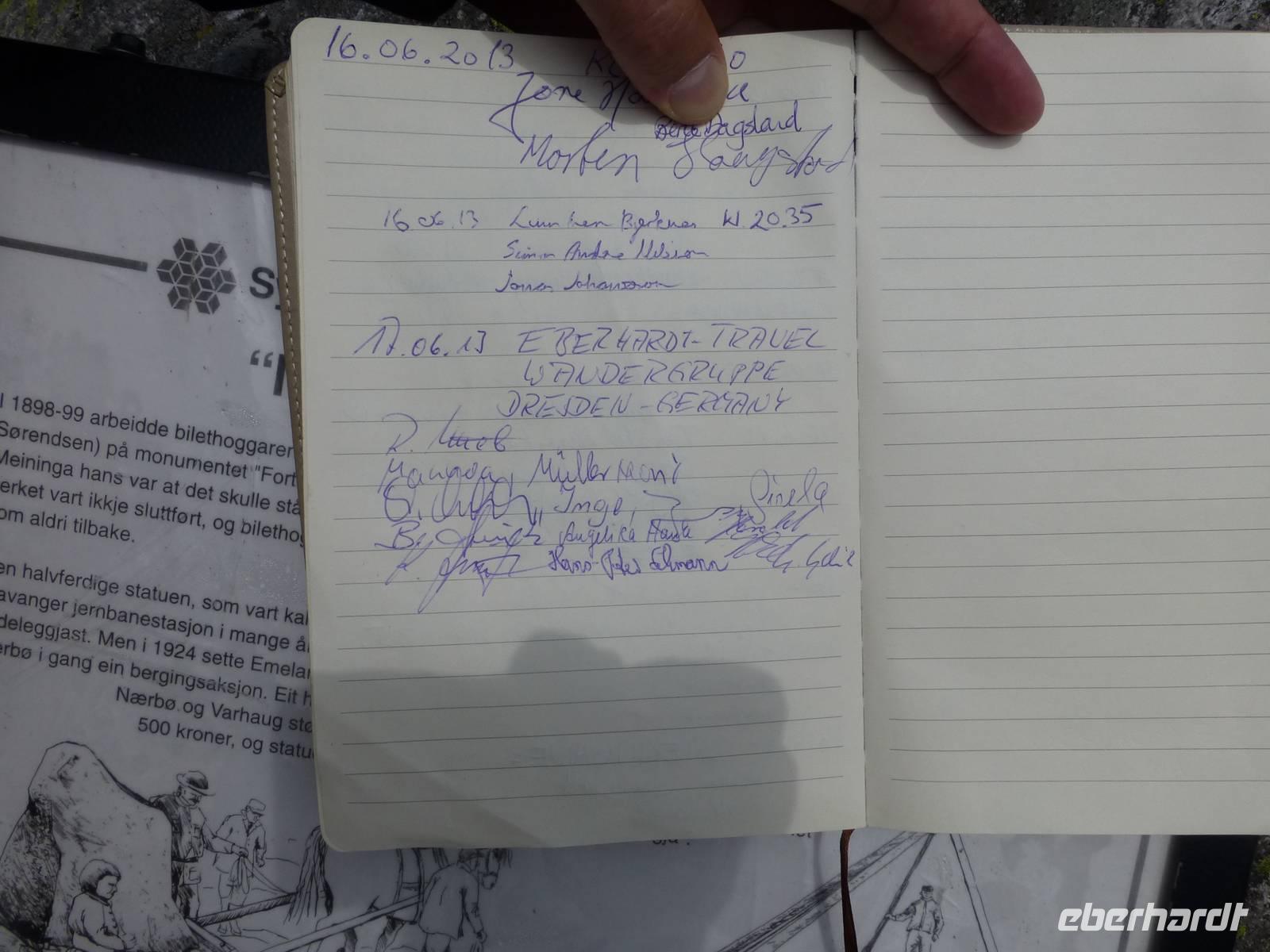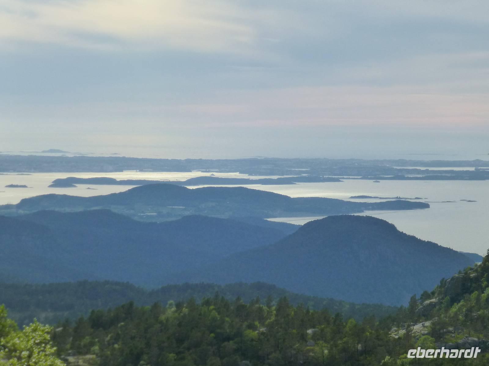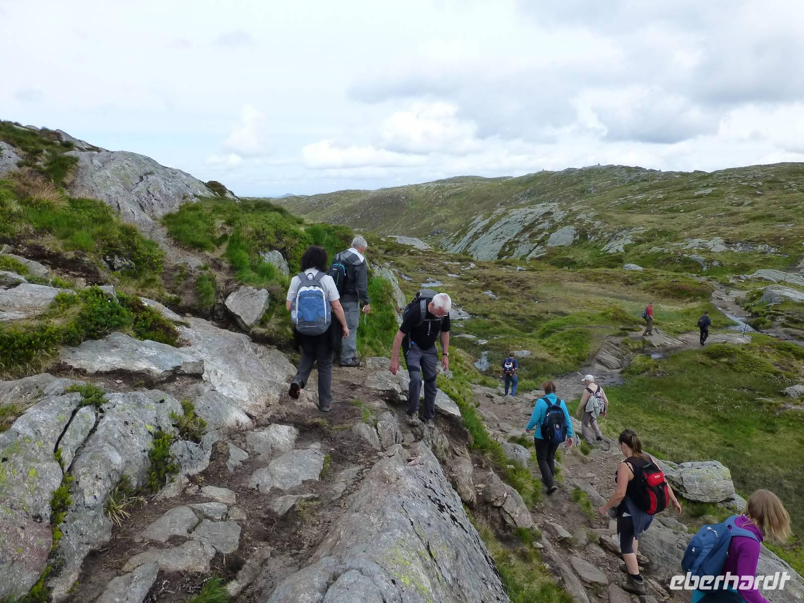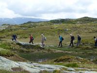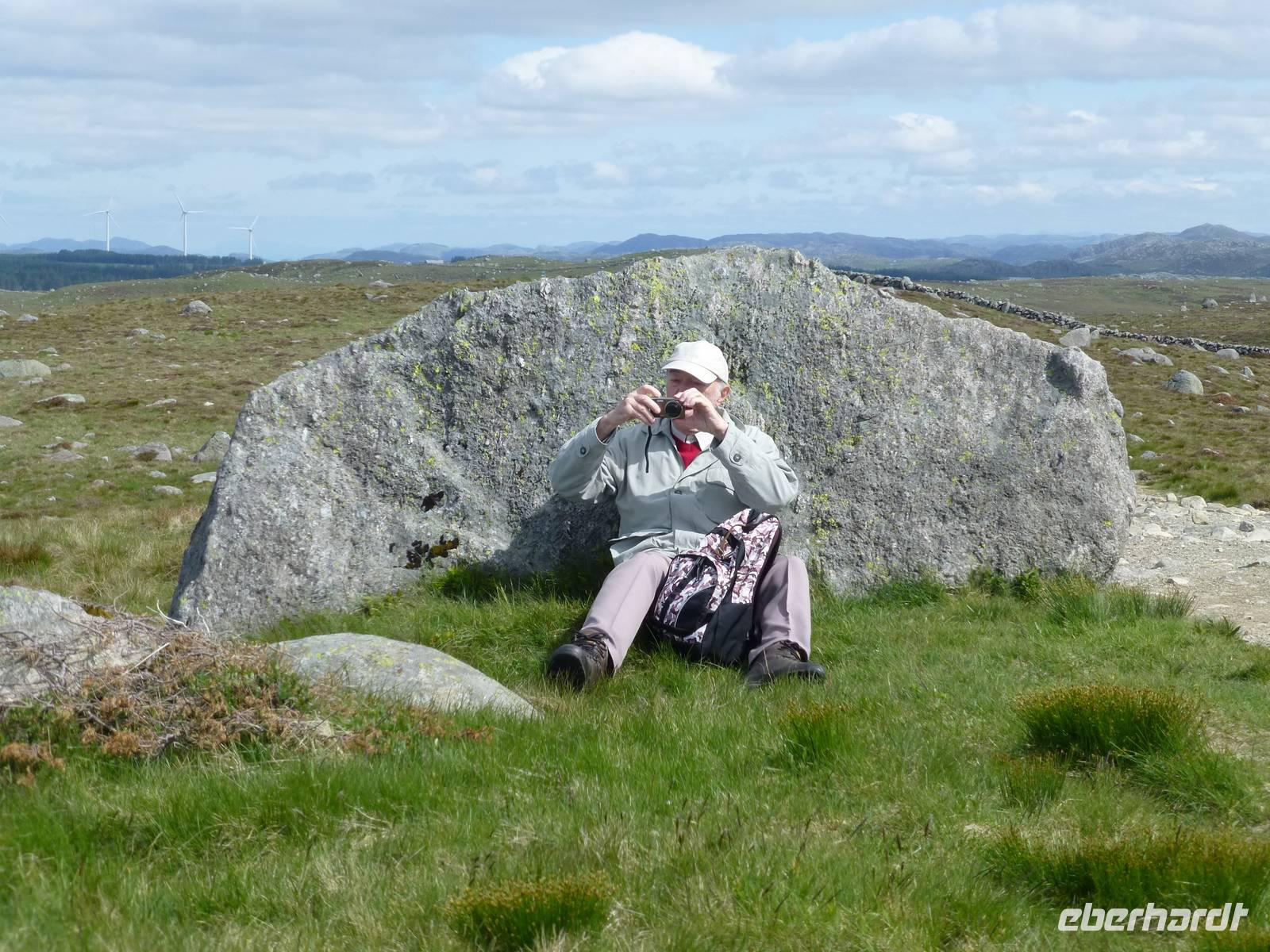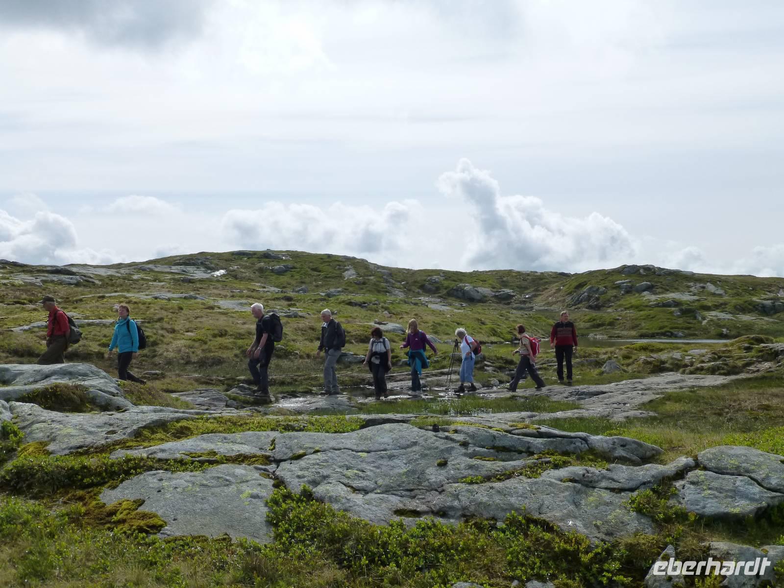 Das Frühstück genießen wir bei einem tollen Blick auf Stavanger und Umgebung in der 21. Etage unseres Hotels. Danach brechen wir auf zu unserer ersten Wanderung. Nach gut einer Stunde Fahrt beginnen wir unsere Wanderung am kleinen Stausee Vandavatnet. Durch Weideland für Kühe und Schafe, später durch offene Moorlandschaft erreichen wir schließlich den 306 m hohen Gauleksvarden. Unterwegs gibt es, dank fachkundiger Information eines Reisegastes, einiges an interessanten Pflanzen zu entdecken. So u.a. Siebenstern, Fettkraut, Sonnentau, Blutwurz oder auch Sumpfschachtelhalm. Dann steigen wir wieder leicht ab um die "Steinkjerinnga" zu erreichen. Die Steinfrau, ein Skulptur von Sigur Sørendsen aus dem Jahre 1898-99, auch Mutter Norwegens genannt, wacht über das weite Land. Sie wurde 1925 an diesem Platz aufgestellt. Nach einem Eintrag in das "Gjestbook" wandern wir hinüber zum 350 m hohen Synesvarden. Bei wunderschönem Wetter genießen wir die Aussicht auf die Umgebung und unser mitgebrachtes Mittagsbrot. Danach erfolgt der Abstieg zum See "Holmavatnet", wo Gisela mit dem Bus wartet. Auf dem Weg zurück nach Stavanger machen wir noch einen Halt am Sandstrand bei Orre. Nach dem abkühlen der Füße in der Nordsee ist ein Spaziergang durch den warmen Sand richtig toll. Mit dem gemeinsamen Abendessen geht ein richtig schöner Tag zu Ende.