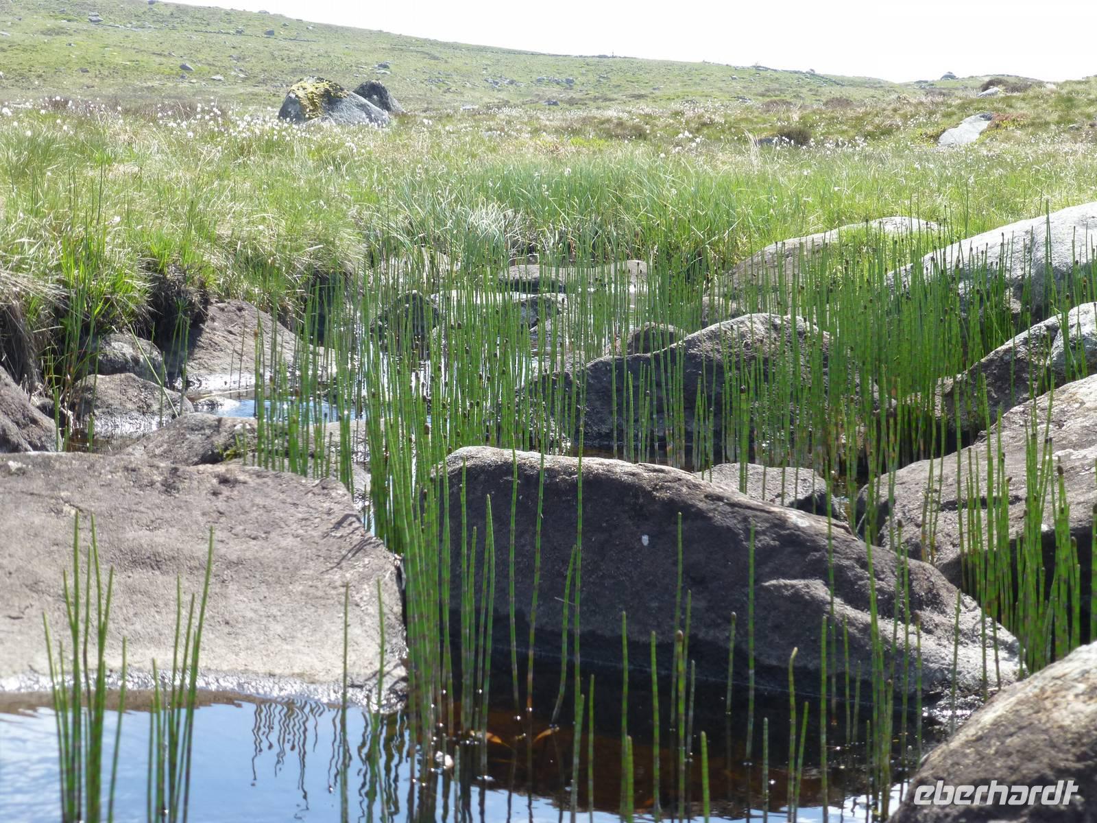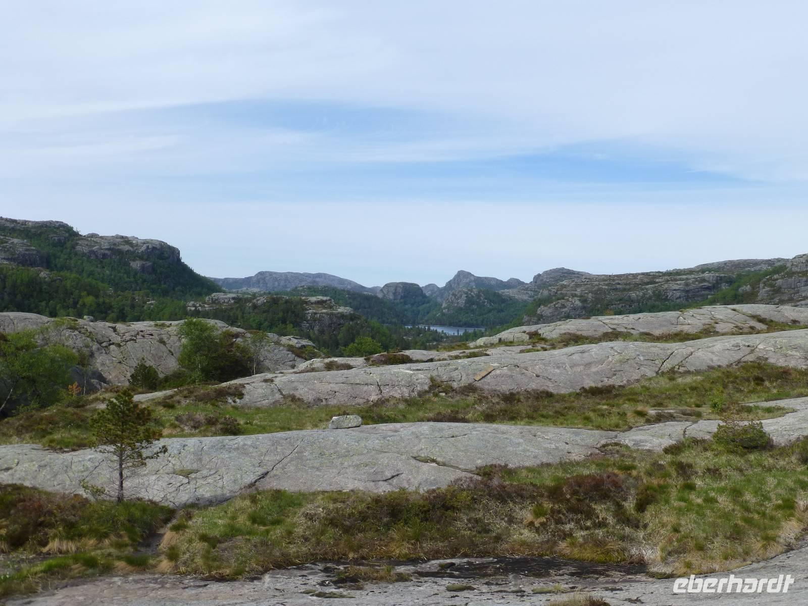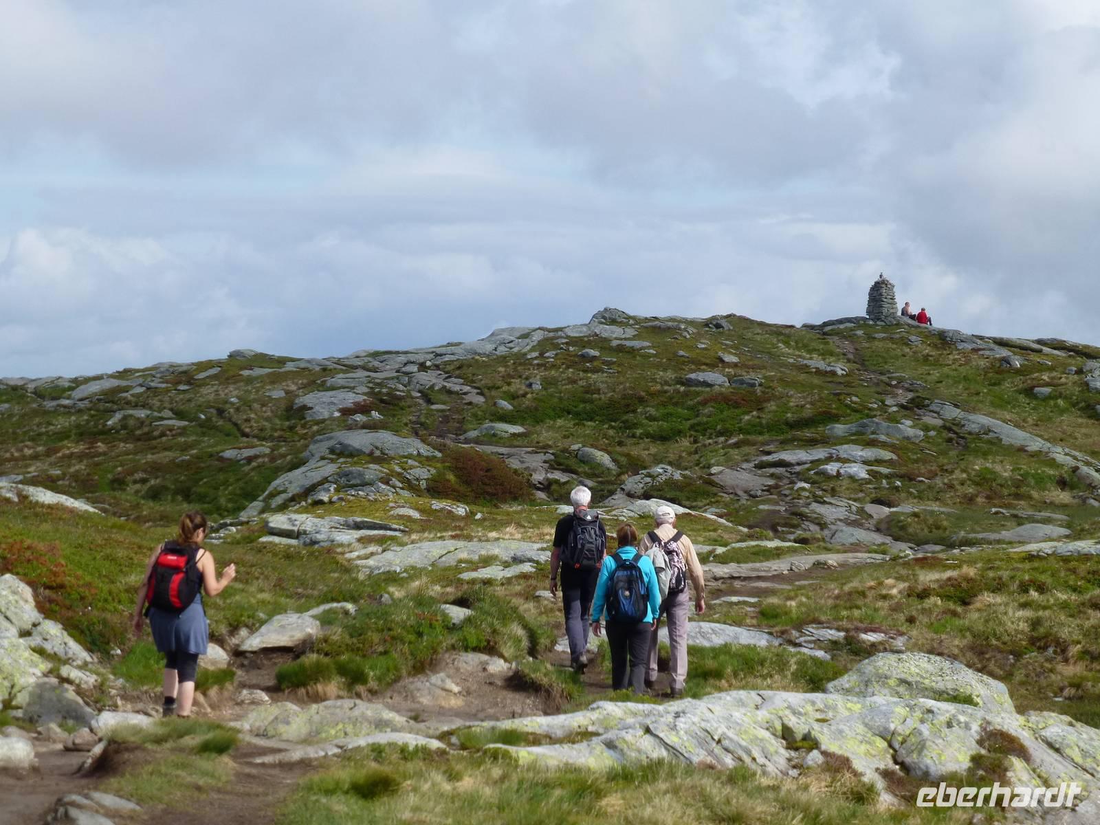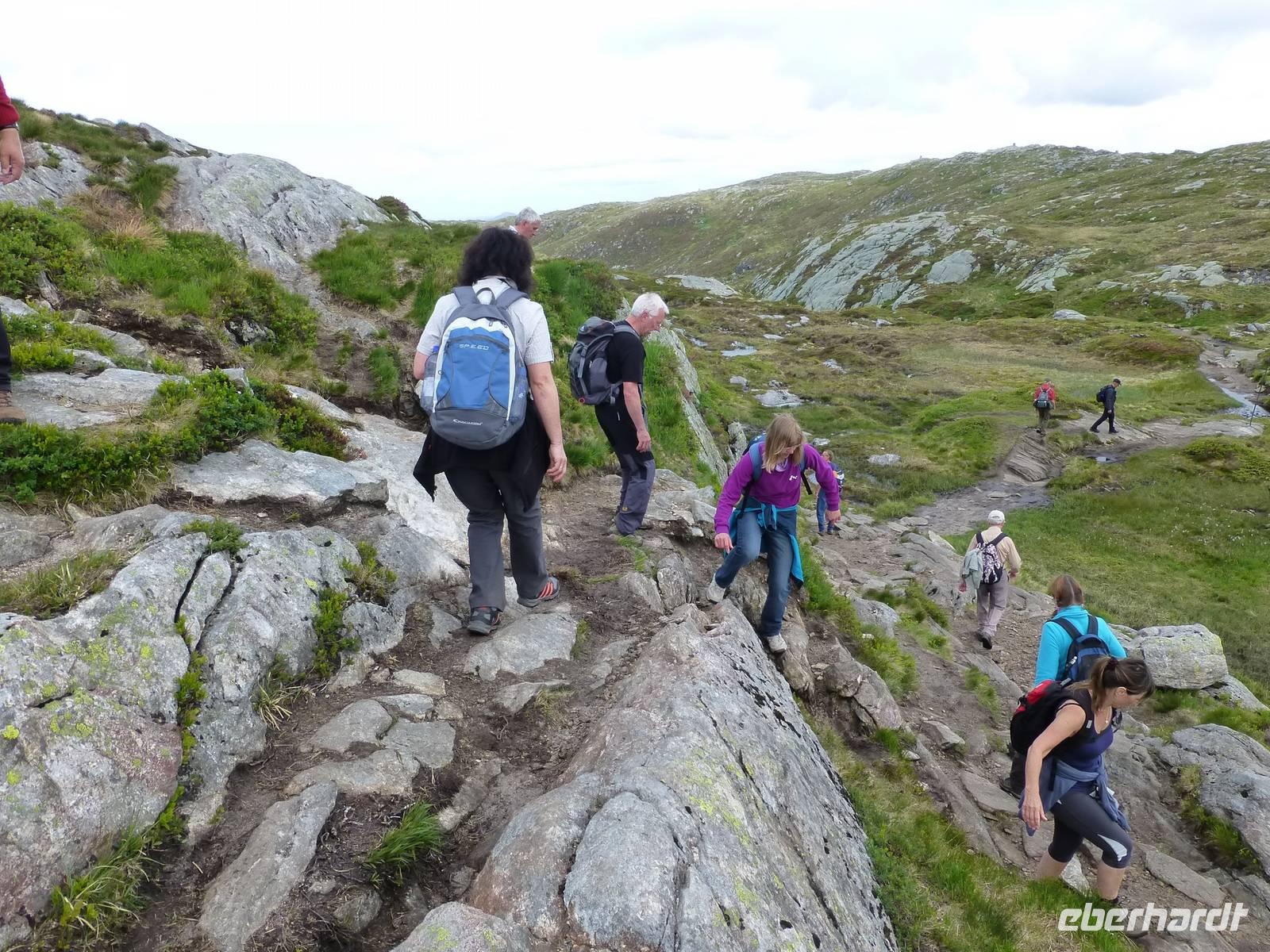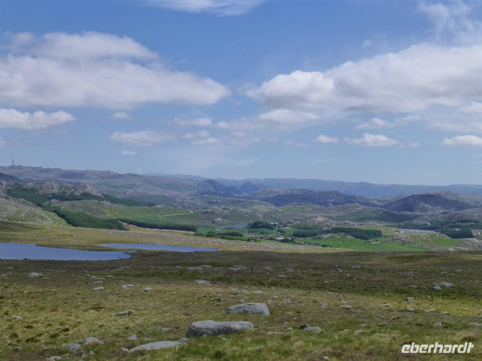 Das Frühstück genießen wir bei einem tollen Blick auf Stavanger und Umgebung in der 21. Etage unseres Hotels. Danach brechen wir auf zu unserer ersten Wanderung. Nach gut einer Stunde Fahrt beginnen wir unsere Wanderung am kleinen Stausee Vandavatnet. Durch Weideland für Kühe und Schafe, später durch offene Moorlandschaft erreichen wir schließlich den 306 m hohen Gauleksvarden. Unterwegs gibt es, dank fachkundiger Information eines Reisegastes, einiges an interessanten Pflanzen zu entdecken. So u.a. Siebenstern, Fettkraut, Sonnentau, Blutwurz oder auch Sumpfschachtelhalm. Dann steigen wir wieder leicht ab um die "Steinkjerinnga" zu erreichen. Die Steinfrau, ein Skulptur von Sigur Sørendsen aus dem Jahre 1898-99, auch Mutter Norwegens genannt, wacht über das weite Land. Sie wurde 1925 an diesem Platz aufgestellt. Nach einem Eintrag in das "Gjestbook" wandern wir hinüber zum 350 m hohen Synesvarden. Bei wunderschönem Wetter genießen wir die Aussicht auf die Umgebung und unser mitgebrachtes Mittagsbrot. Danach erfolgt der Abstieg zum See "Holmavatnet", wo Gisela mit dem Bus wartet. Auf dem Weg zurück nach Stavanger machen wir noch einen Halt am Sandstrand bei Orre. Nach dem abkühlen der Füße in der Nordsee ist ein Spaziergang durch den warmen Sand richtig toll. Mit dem gemeinsamen Abendessen geht ein richtig schöner Tag zu Ende.
