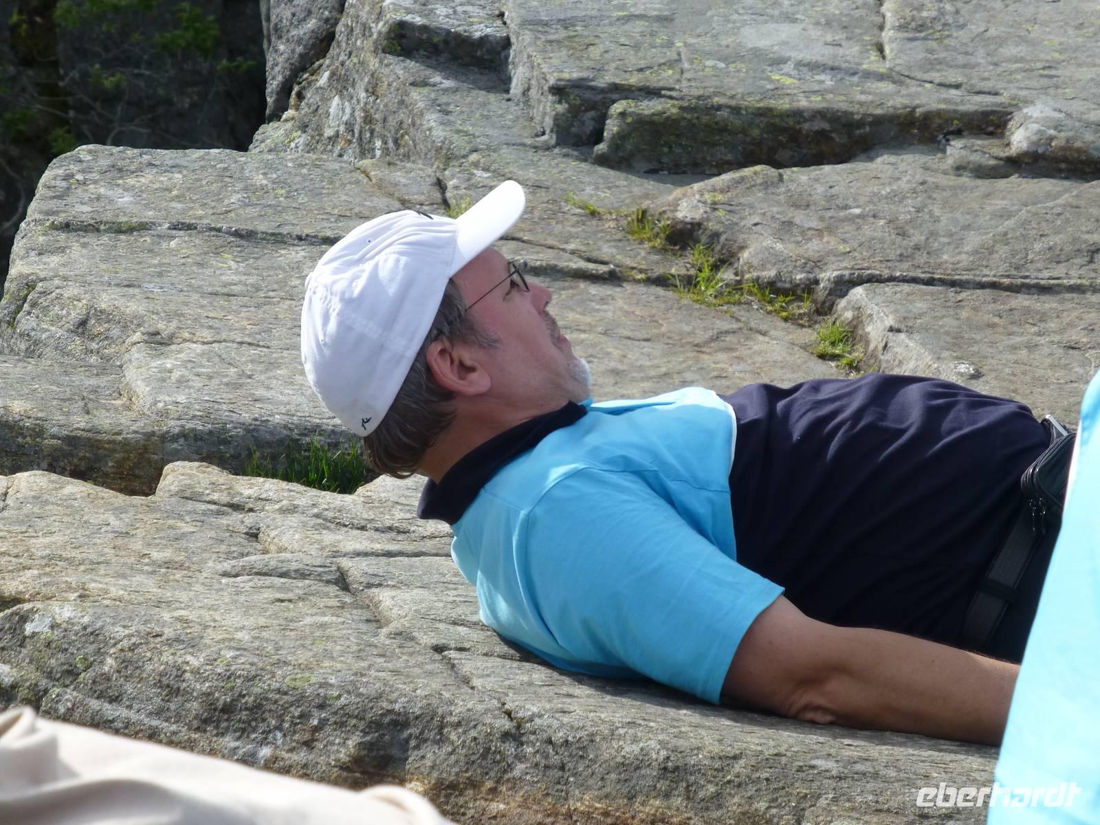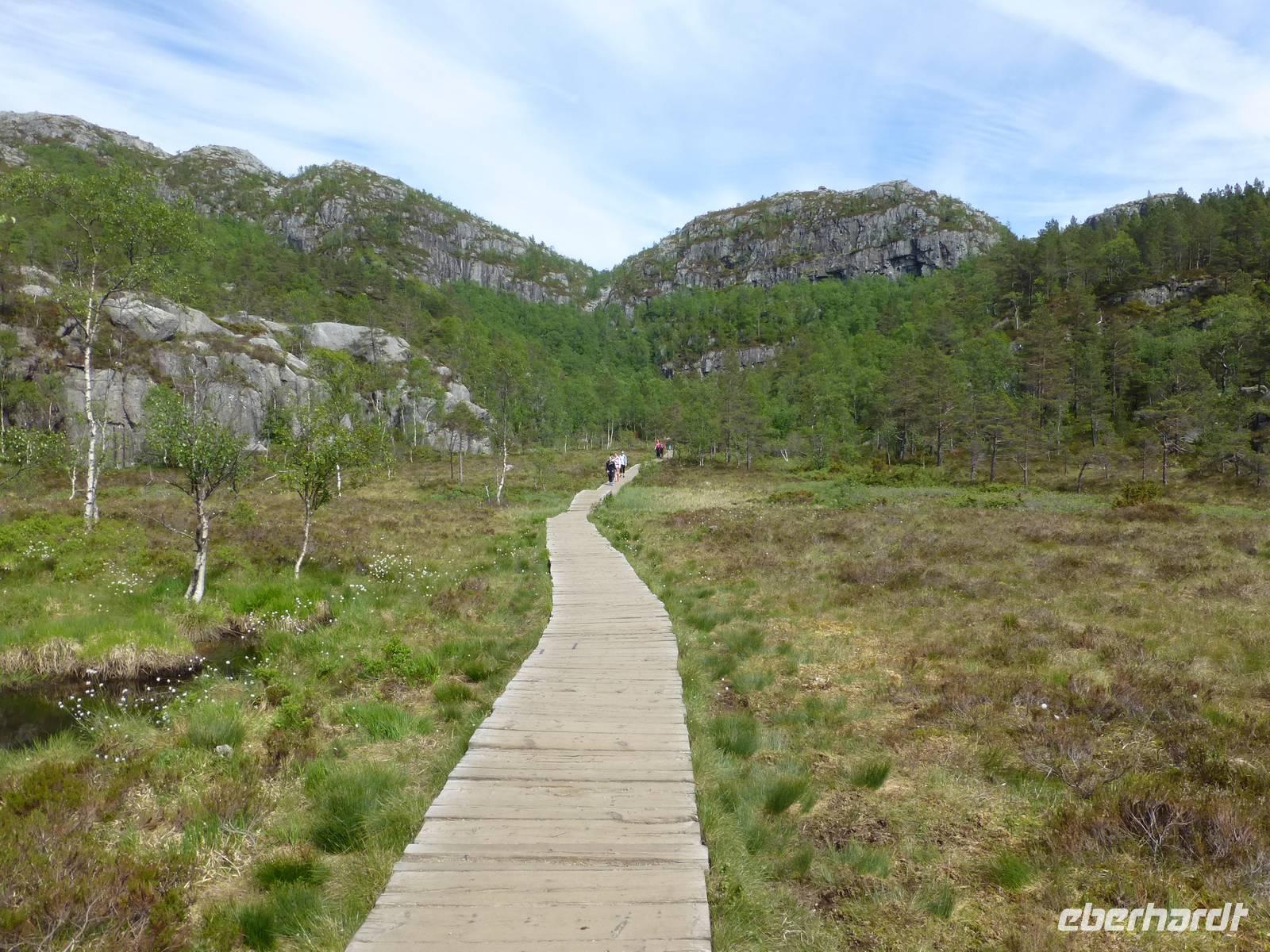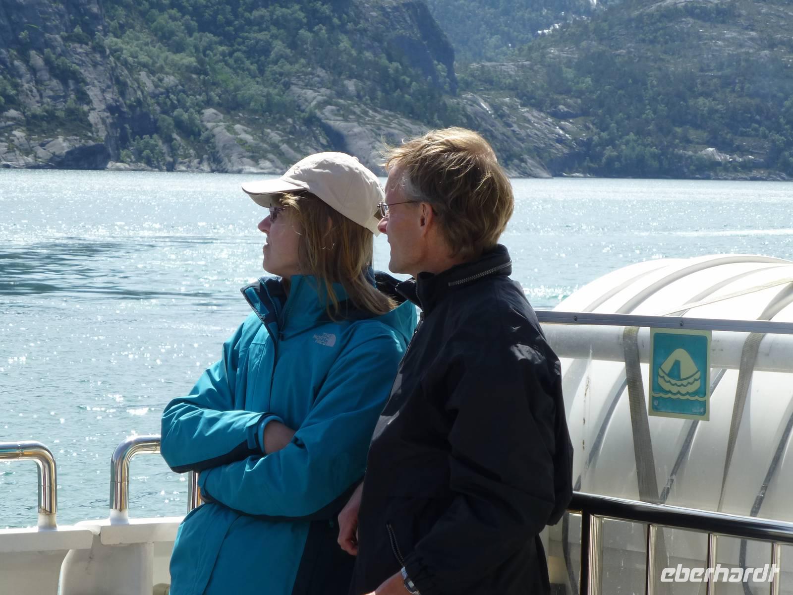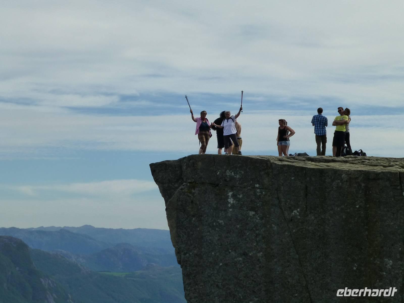 Bereits zum Frühstück lacht wieder die Sonne und so verspricht nict nur der Wetterbericht einen schönen Tag. Gemeinsam laufen wir vom Hotel in das Stadtzentrum von Stavanger, wo ausreichend Zeit bleibt dieses zu erkunden. Für den Fall der Fälle ist auch jeder mit einem Stadtplan ausgerüstet. Mittags fahren wir dann vom Altstadthafen mit dem Schiff in den Lysefjord. Allein schon die Fahrt dahin ist ein Erlebnis, eine Bilderbuchlandschaft zieht an uns vorbei. An verschiedenen Punkten wird während der Tour wird auf Deutsch erklärt. Bei Oanes biegen wir dann in den Lysefjord ein, der über 40 km läng ist, hier steigt auch noch Gisela unsere Busfahrerin zu. Und dann können wir schon mal unser Wanderziel von unten bestaunen, die mächtige Felskanzel des Prekestolen. Nach dem "Whisky Wasserfall", dessen Wasser wir auch auf dem Schiff verkosten können, legt das Schiff am Lysefjordcenter an, wo wir es verlassen. Mit unserm Bus fahren wir jetzt zur Prekestolenhytta, wo der Aufstieg zum Prekestolen beginnt. Gleich zu Beginn steigt der Weg kräftig an, wird dann wieder etwas flacher bevor wir zwei weitere Höhenstufen zu überwinden haben. Der Weg erfordert dabei unsere ganze Aufmerksamkeit, verläuft er doch zum großen Teil über Bruchsteine, kann aber als gut ausgebaut bezeichnet werden. Das letzte Stück ist dann nicht mehr ganz so schwer und der Weg am Felsrand entlang ist auch gut gesichert. Und dann ist Sie da, die Plattform der Predigtkanzel, wie der Gipfel auf deutsch heißt. Wir blicken von 604 m hinab auf den Lysefjord und das umliegende Land. Ein mächtiger Anblick. Einige Mutige legen sich auf den Bauch und wagen einen Blick über den Rand nach unten. Ein Erlebnis und alle sind froh diesen Weg geschafft zu haben. Nach einer Pause beginnt der Abstieg über den gleichen Weg. Von der Prekestolenhytta fahren wir dann zu Fähre nach Oanes und anschließend zurück nach Stavanger. Wir sind geschafft aber froh.