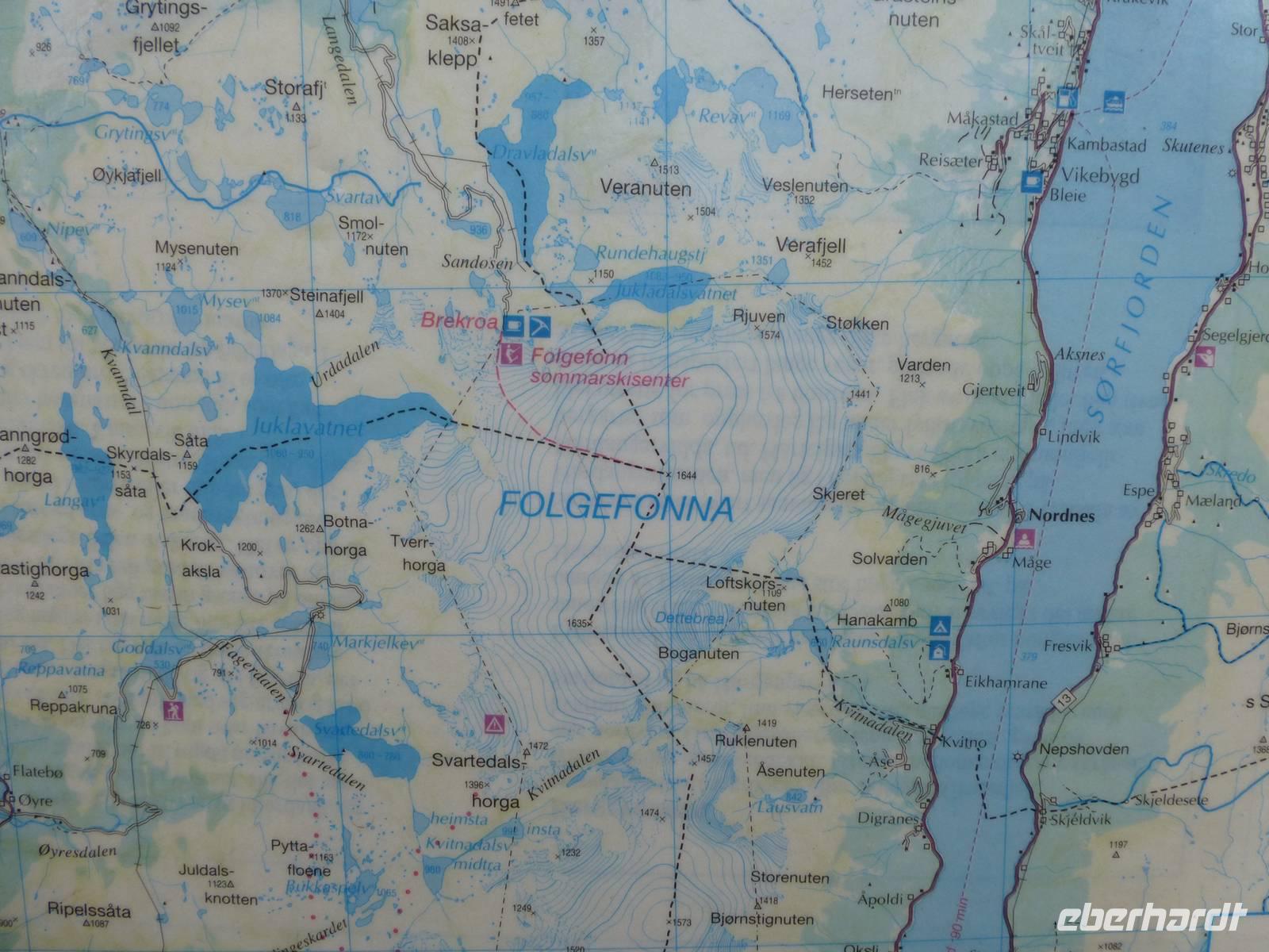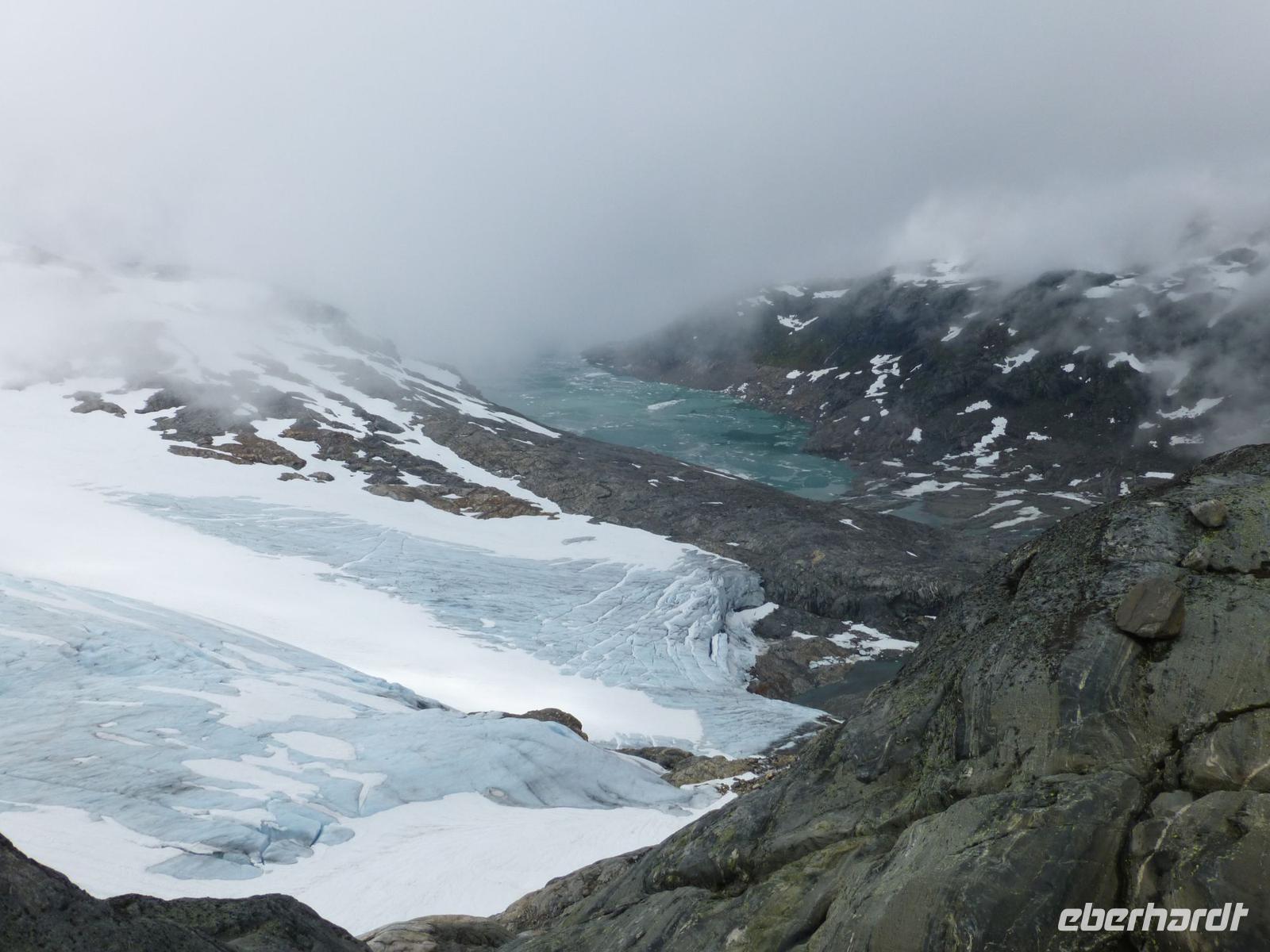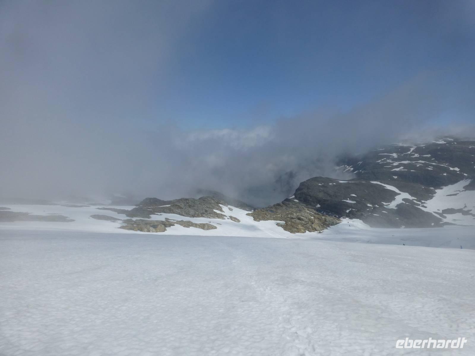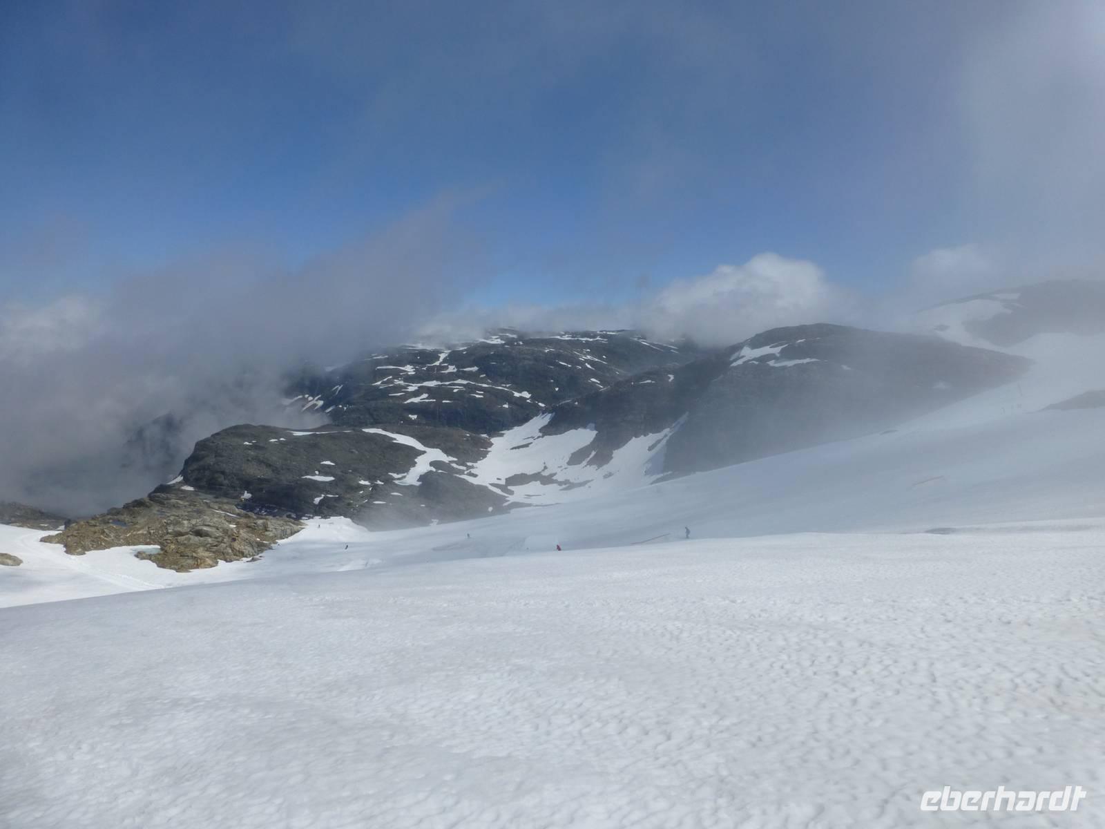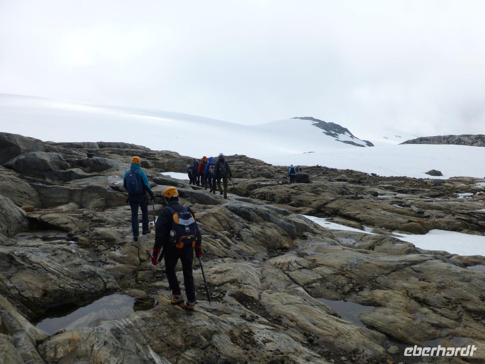 Am Morgen zeigt sich das Wetter noch nicht von seiner besten Seite. Heute gibt es die fakultative Möglichkeit zu einer Gletscherwanderung auf Norwegens drittgrößtem Gletscher, dem Folgefonna. Und so macht sich ein Teil der Gruppe am Morgen auf nach Jondal. Die im Hotel bleibenden Gäste haben einen Tag zur freien Verfügung, welcher sich in Ulvik ohne Probleme verbringen lässt. Von Jondal sind es noch 20 km bis zum Folgefonna Sommerskicenter. Allein die Fahrt da hinauf ist ein Erlebnis. Nach Ankunft werden wir von unserem Gletscherführer Cleng empfangen. Wir werden eingekleidet und natürlich in die Tour eingewiesen. Zuerst haben wir 200 Höhenmeter zu überwinden. Wir starten in dichten Nebel und dann kommt die erste Belohnung, die Wolken reißen auf und wir können erstmals sehen in was für einem Winterwunderland wir angekommen sind. Nachdem wir eine Höhe von 1400 m erreicht haben steigen wir zum eigentlichen Gletscher ab. Zuerst aber müssen die Steigeisen angelegt und eine Seilschaft gebildet werden. Dann laufen wir tatsächlich über den Gletscher, vorbei an großen Gletscherspalten, Direkt am Eis machen wir eine Mittagspause und drehen dann noch mehrere Runden über das Eis, das an machen Stellen eine blaue Farbe hat. Cleng erklärt uns, das dies mit dem Lichteinfall der Sonne zu tun hat und der gleiche Effekt auch beim Meerwasser auftritt. Später verlassen wir den Gletscher wieder und steigen wieder ab zum Sommerskicenter. Inzwischen ist hier kein Betrieb mehr. Wir sind geschafft und froh, es war ein Erlebnis. Über den gleichen Weg fahren wir zurück nach Ulvik.