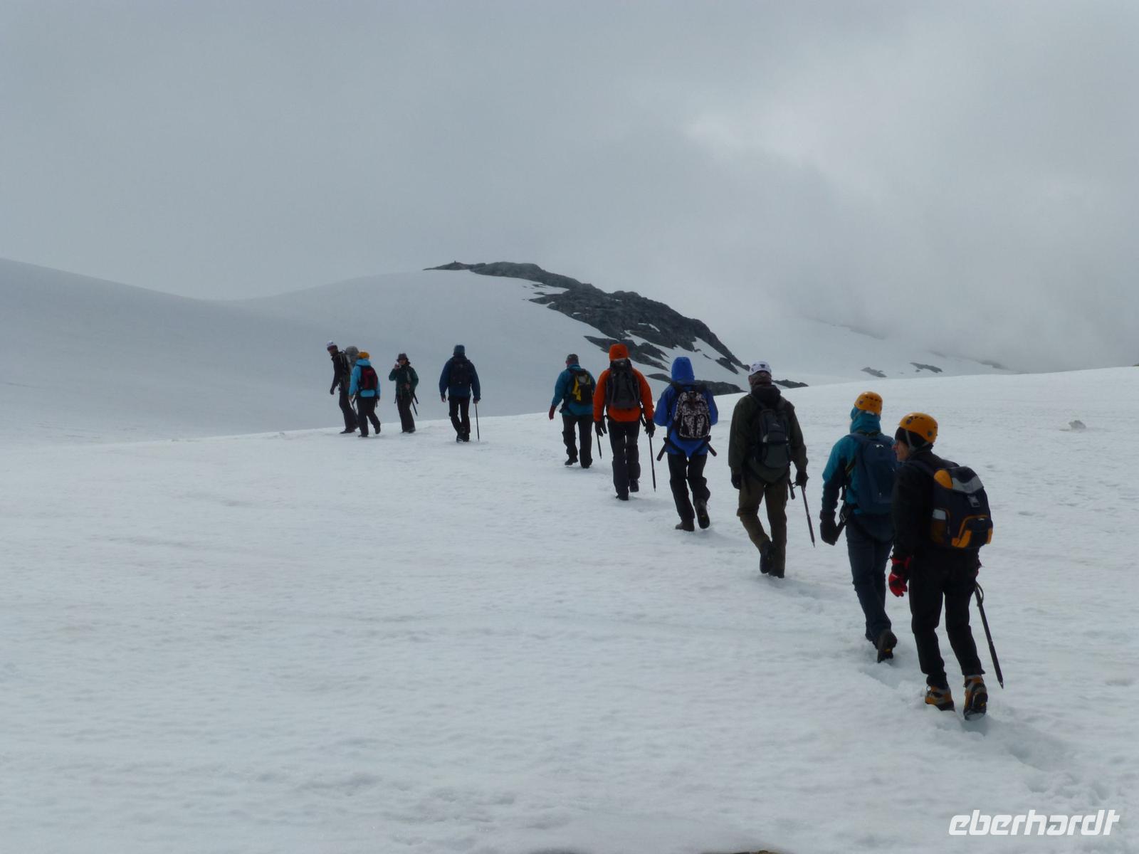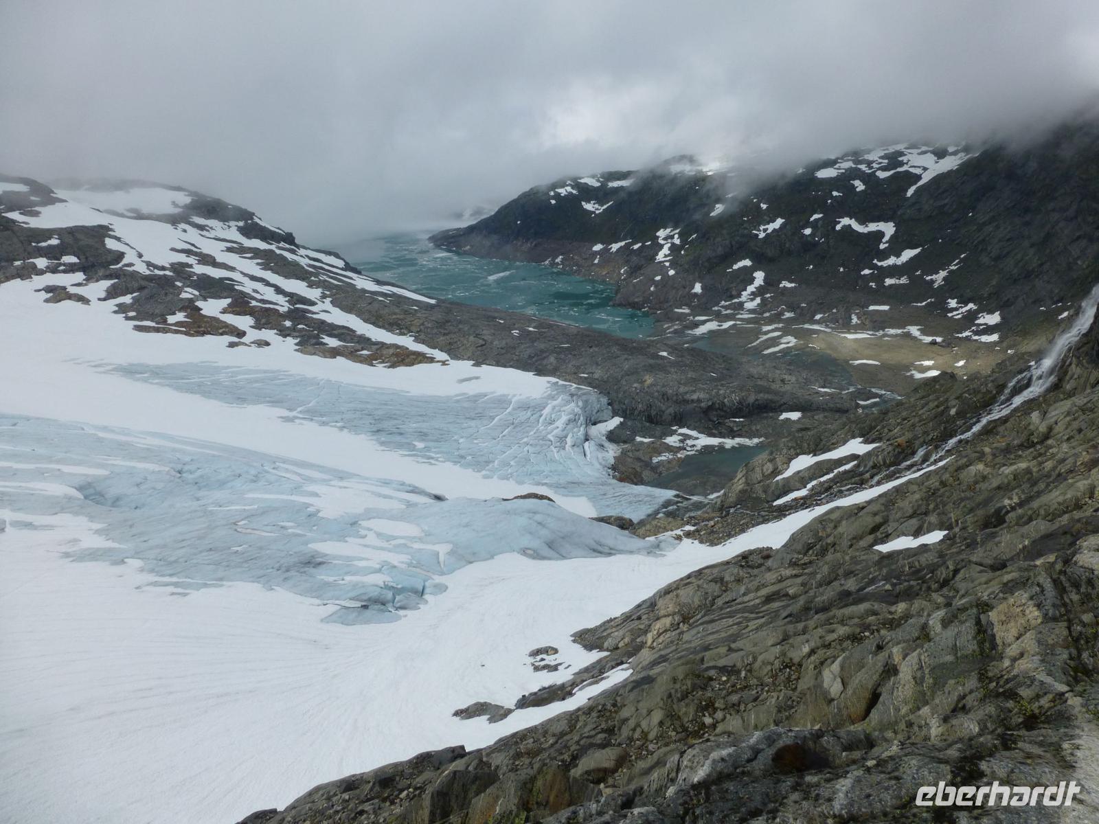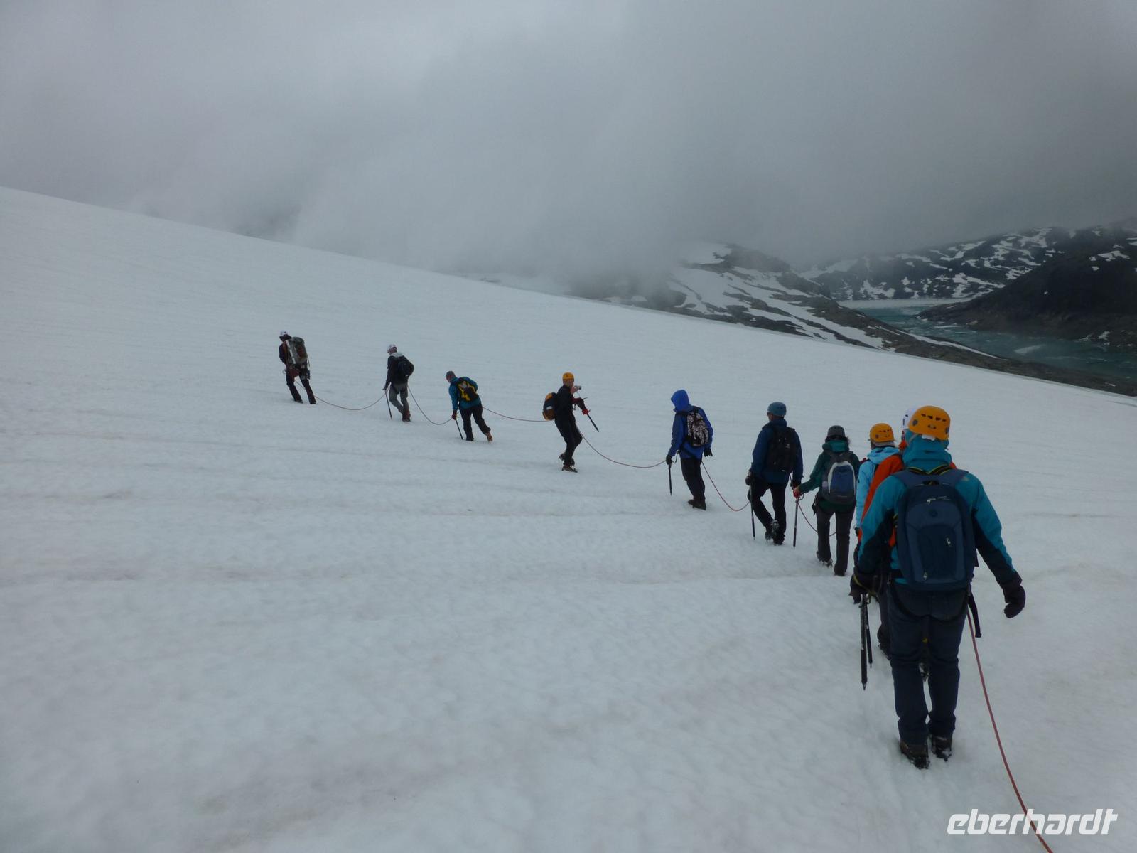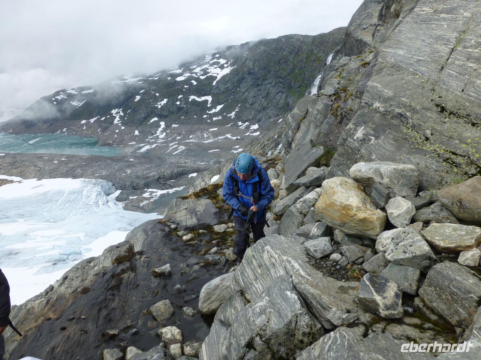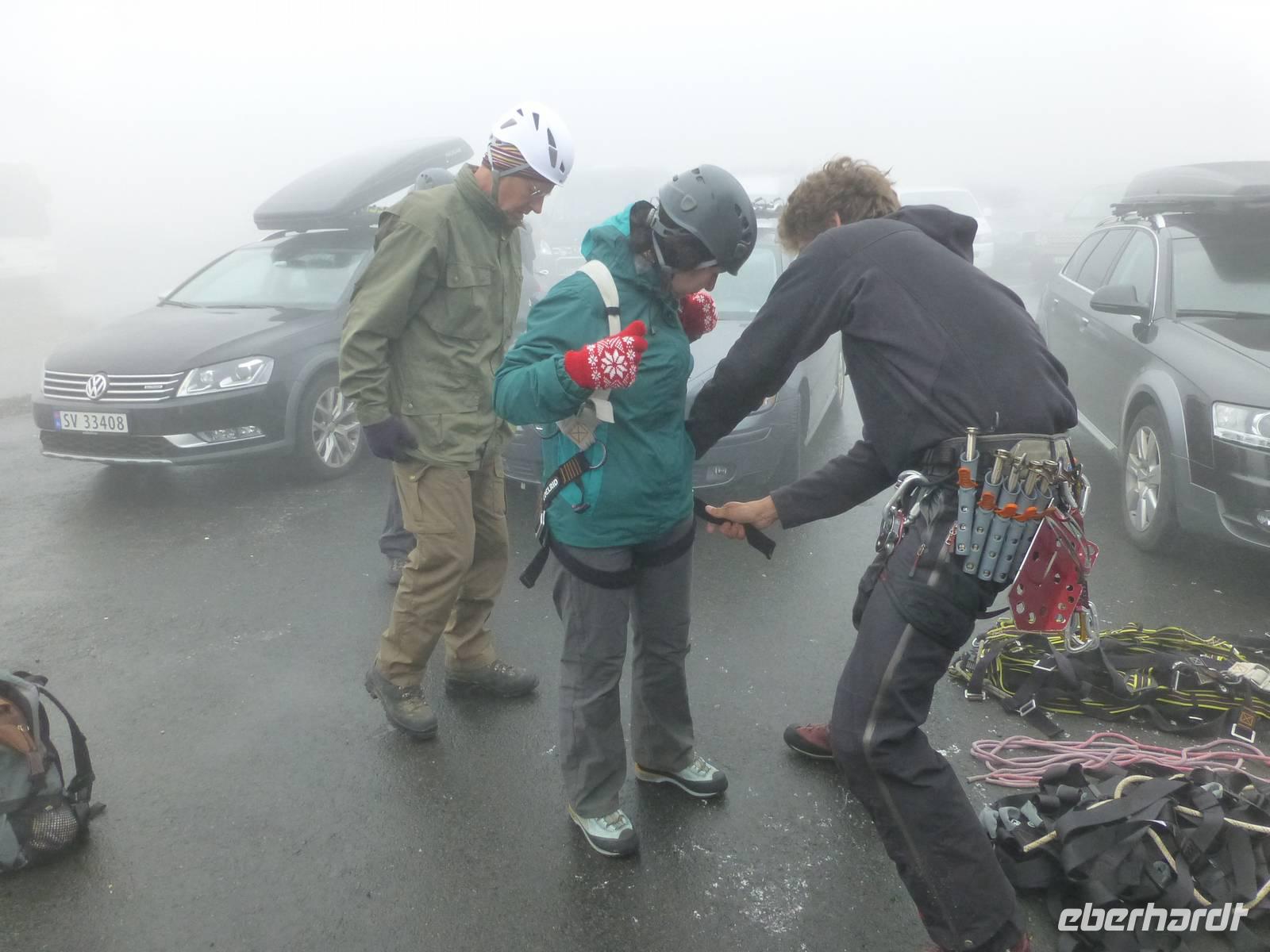 Am Morgen zeigt sich das Wetter noch nicht von seiner besten Seite. Heute gibt es die fakultative Möglichkeit zu einer Gletscherwanderung auf Norwegens drittgrößtem Gletscher, dem Folgefonna. Und so macht sich ein Teil der Gruppe am Morgen auf nach Jondal. Die im Hotel bleibenden Gäste haben einen Tag zur freien Verfügung, welcher sich in Ulvik ohne Probleme verbringen lässt. Von Jondal sind es noch 20 km bis zum Folgefonna Sommerskicenter. Allein die Fahrt da hinauf ist ein Erlebnis. Nach Ankunft werden wir von unserem Gletscherführer Cleng empfangen. Wir werden eingekleidet und natürlich in die Tour eingewiesen. Zuerst haben wir 200 Höhenmeter zu überwinden. Wir starten in dichten Nebel und dann kommt die erste Belohnung, die Wolken reißen auf und wir können erstmals sehen in was für einem Winterwunderland wir angekommen sind. Nachdem wir eine Höhe von 1400 m erreicht haben steigen wir zum eigentlichen Gletscher ab. Zuerst aber müssen die Steigeisen angelegt und eine Seilschaft gebildet werden. Dann laufen wir tatsächlich über den Gletscher, vorbei an großen Gletscherspalten, Direkt am Eis machen wir eine Mittagspause und drehen dann noch mehrere Runden über das Eis, das an machen Stellen eine blaue Farbe hat. Cleng erklärt uns, das dies mit dem Lichteinfall der Sonne zu tun hat und der gleiche Effekt auch beim Meerwasser auftritt. Später verlassen wir den Gletscher wieder und steigen wieder ab zum Sommerskicenter. Inzwischen ist hier kein Betrieb mehr. Wir sind geschafft und froh, es war ein Erlebnis. Über den gleichen Weg fahren wir zurück nach Ulvik.
