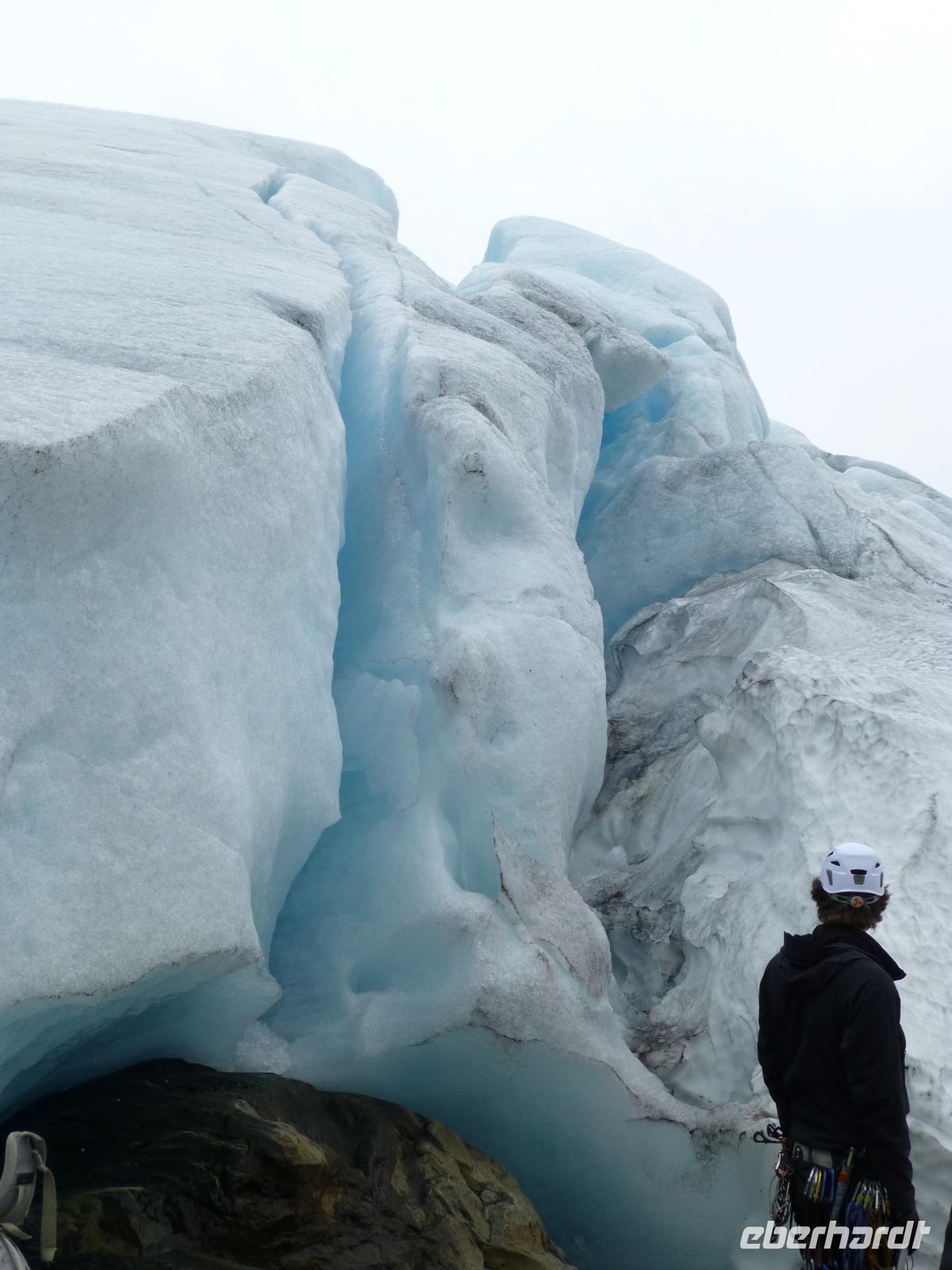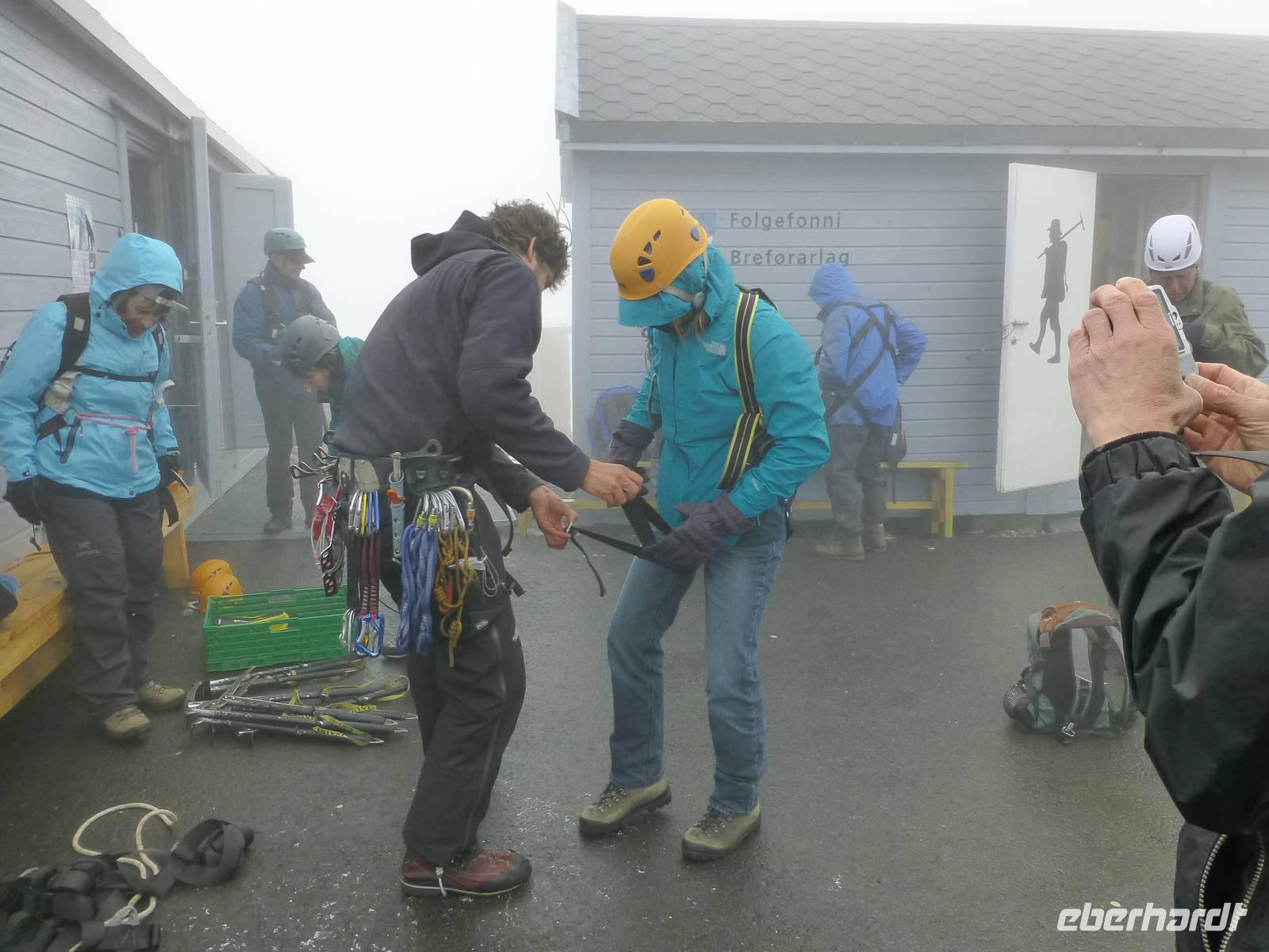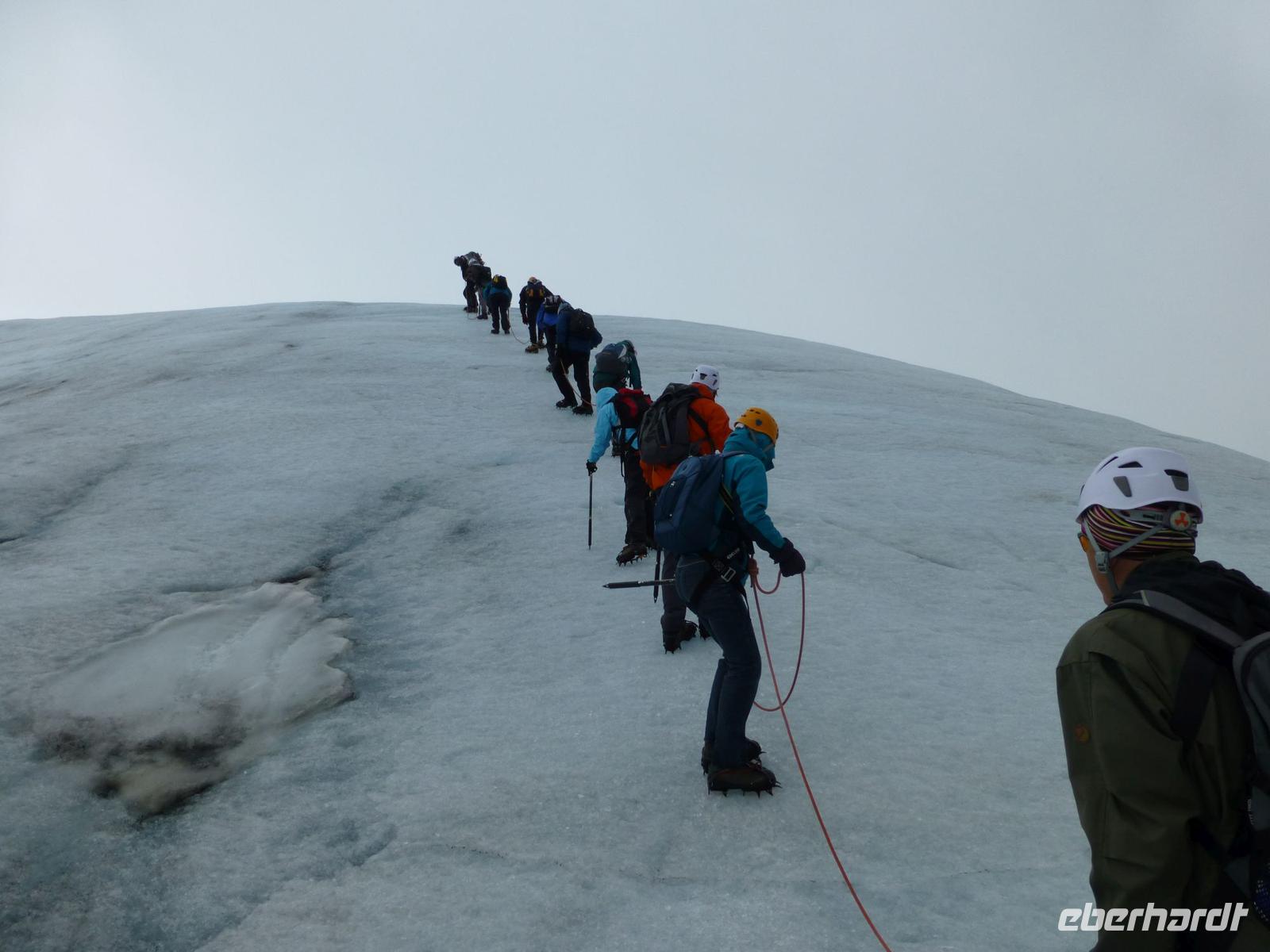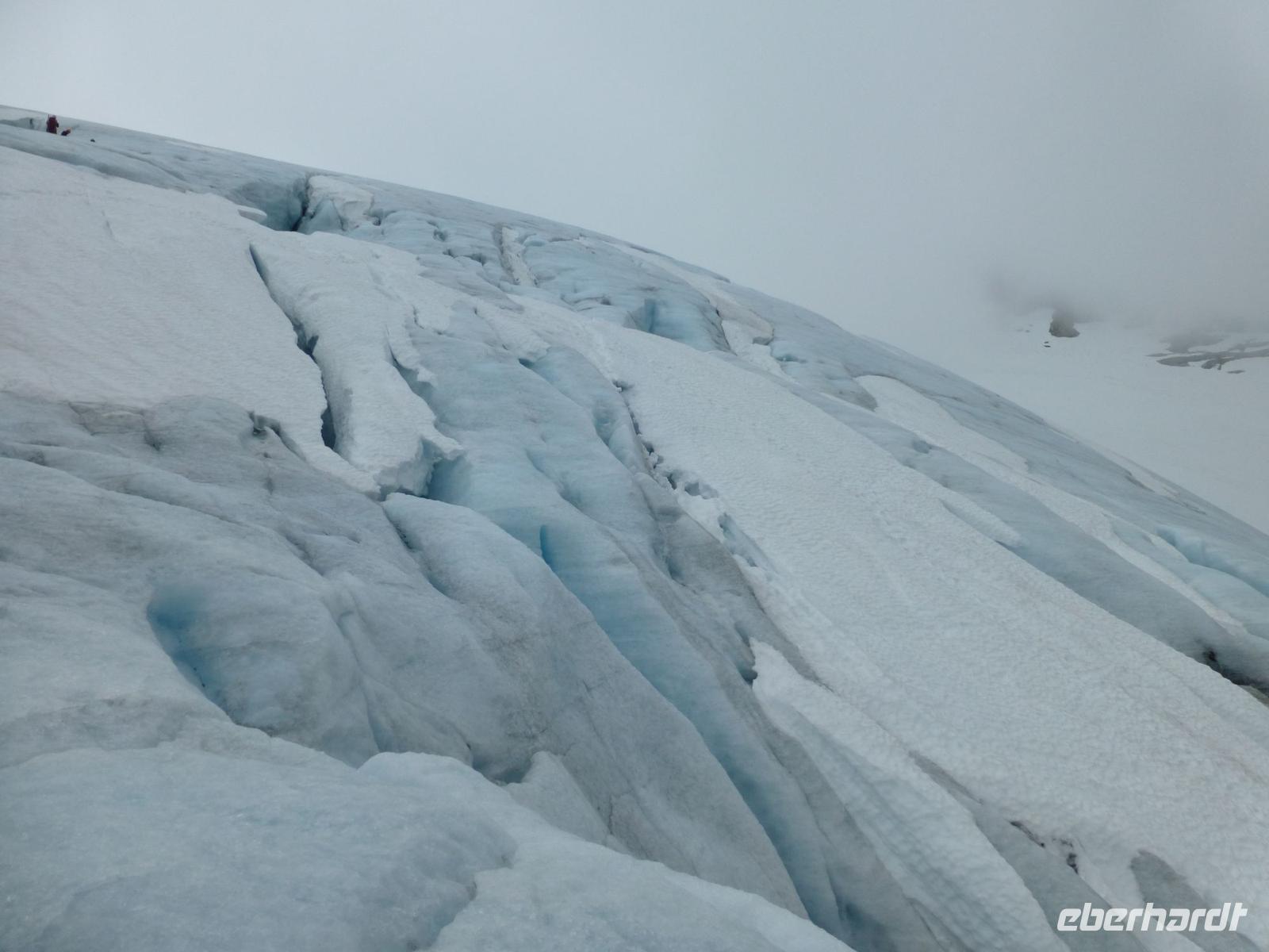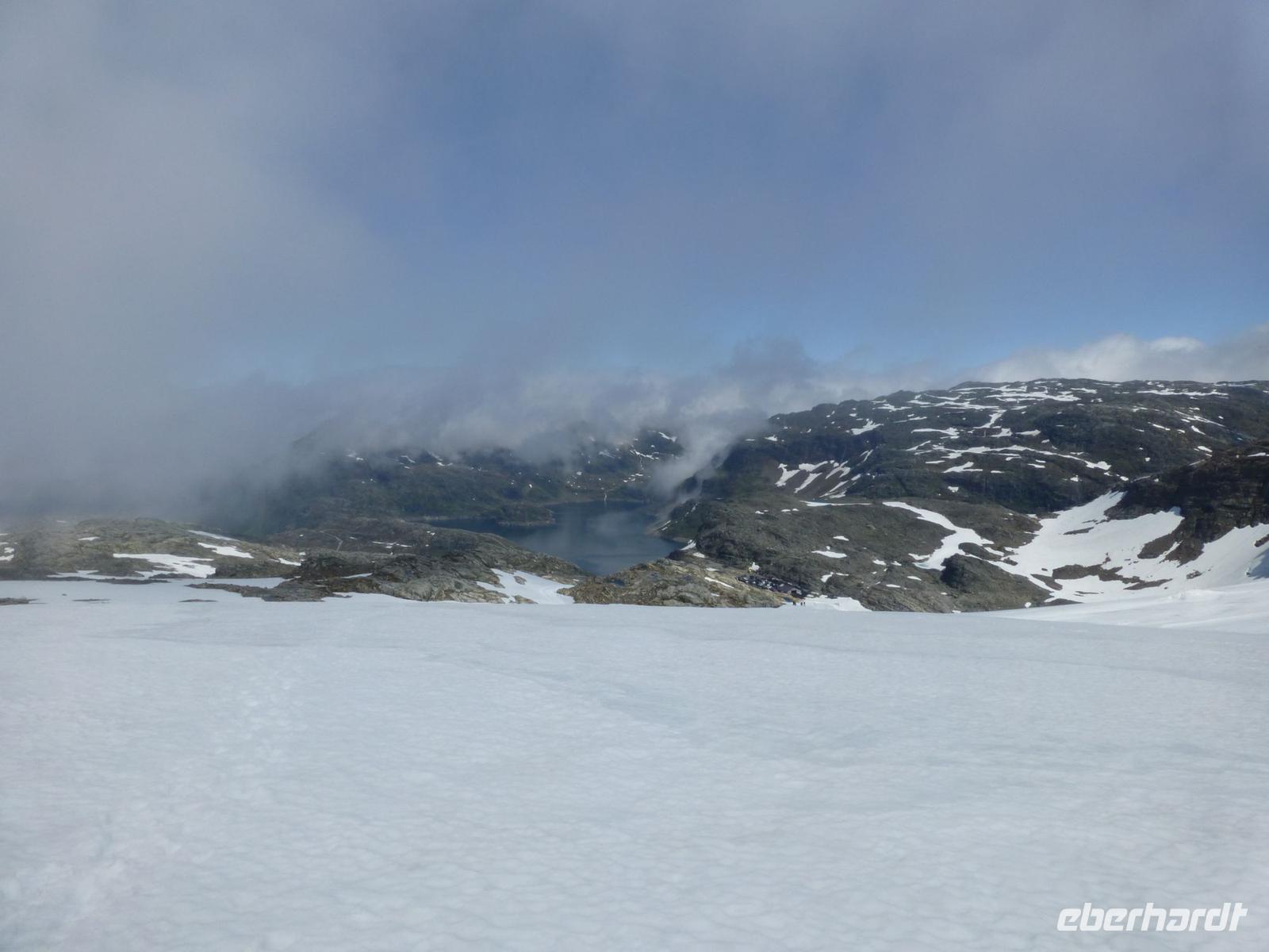 Am Morgen zeigt sich das Wetter noch nicht von seiner besten Seite. Heute gibt es die fakultative Möglichkeit zu einer Gletscherwanderung auf Norwegens drittgrößtem Gletscher, dem Folgefonna. Und so macht sich ein Teil der Gruppe am Morgen auf nach Jondal. Die im Hotel bleibenden Gäste haben einen Tag zur freien Verfügung, welcher sich in Ulvik ohne Probleme verbringen lässt. Von Jondal sind es noch 20 km bis zum Folgefonna Sommerskicenter. Allein die Fahrt da hinauf ist ein Erlebnis. Nach Ankunft werden wir von unserem Gletscherführer Cleng empfangen. Wir werden eingekleidet und natürlich in die Tour eingewiesen. Zuerst haben wir 200 Höhenmeter zu überwinden. Wir starten in dichten Nebel und dann kommt die erste Belohnung, die Wolken reißen auf und wir können erstmals sehen in was für einem Winterwunderland wir angekommen sind. Nachdem wir eine Höhe von 1400 m erreicht haben steigen wir zum eigentlichen Gletscher ab. Zuerst aber müssen die Steigeisen angelegt und eine Seilschaft gebildet werden. Dann laufen wir tatsächlich über den Gletscher, vorbei an großen Gletscherspalten, Direkt am Eis machen wir eine Mittagspause und drehen dann noch mehrere Runden über das Eis, das an machen Stellen eine blaue Farbe hat. Cleng erklärt uns, das dies mit dem Lichteinfall der Sonne zu tun hat und der gleiche Effekt auch beim Meerwasser auftritt. Später verlassen wir den Gletscher wieder und steigen wieder ab zum Sommerskicenter. Inzwischen ist hier kein Betrieb mehr. Wir sind geschafft und froh, es war ein Erlebnis. Über den gleichen Weg fahren wir zurück nach Ulvik.