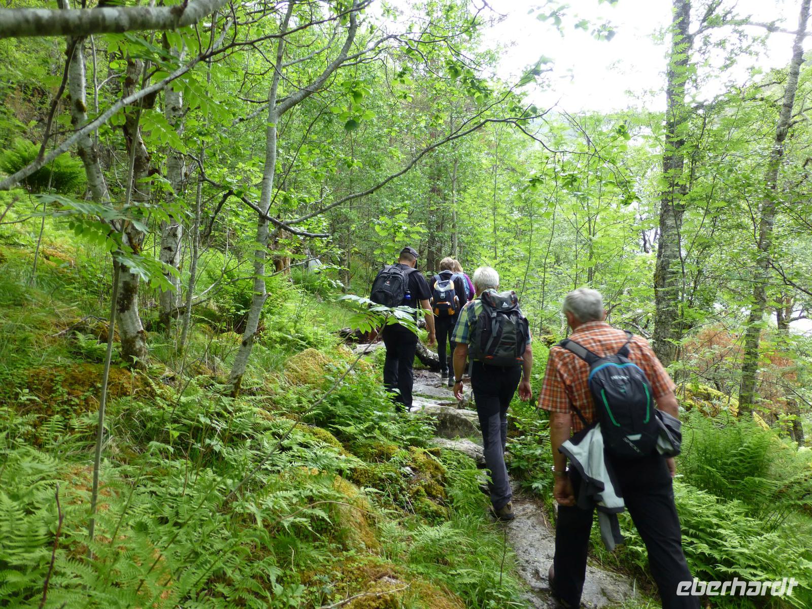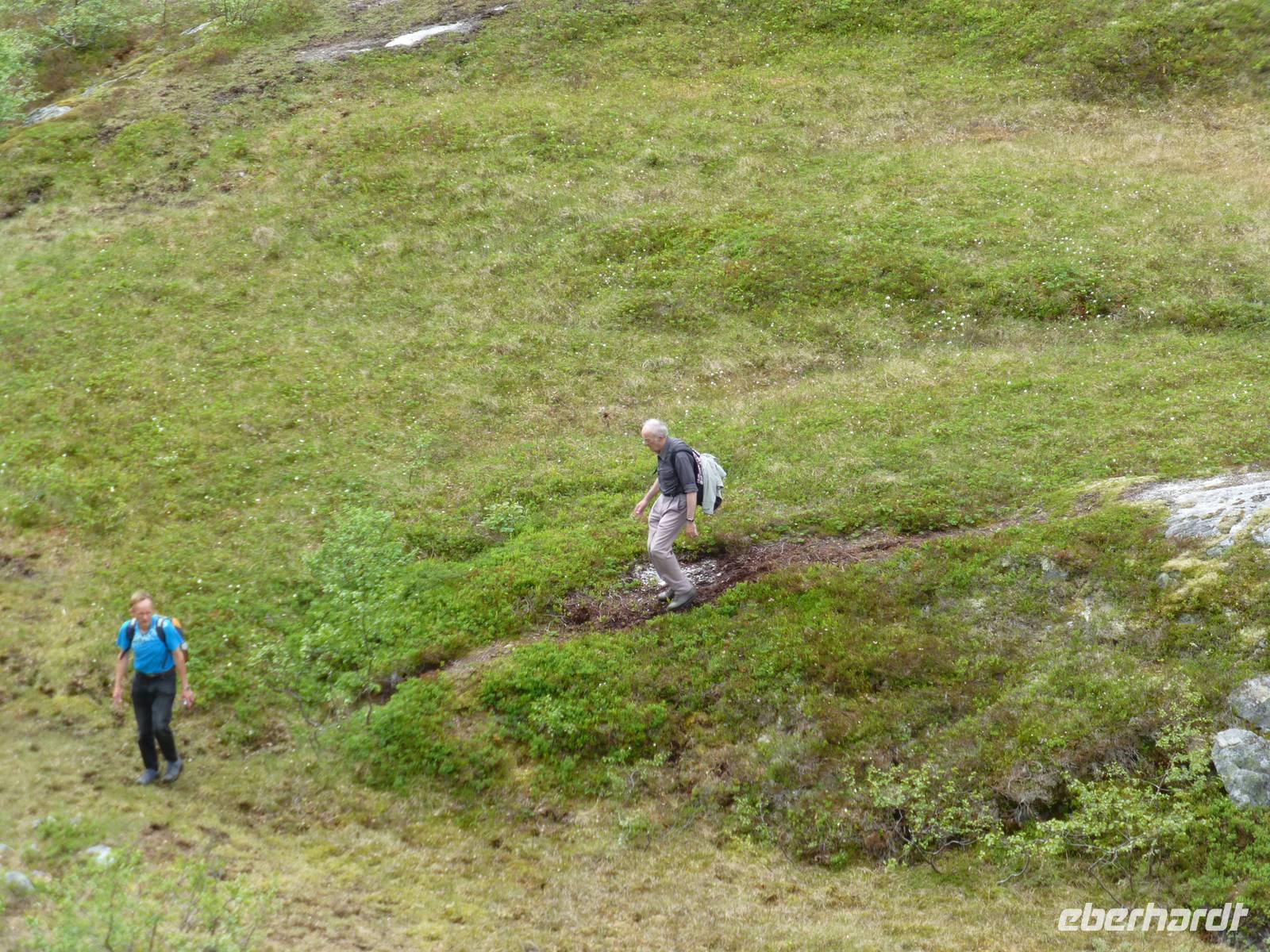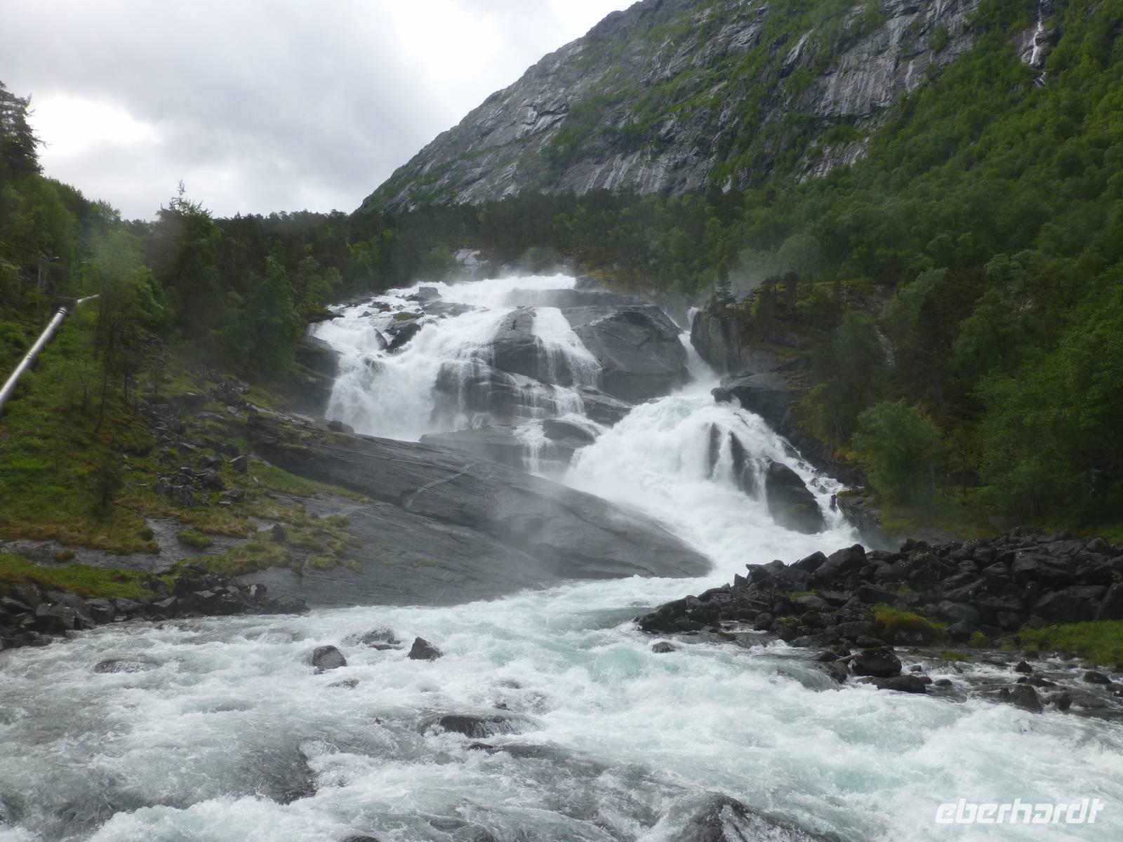 Über einen Fahrweg steigen wir hinauf zu einem kleinen Staubecken, welches für das Wasserkraftwerk benötigt wird. Der Weg führt weiter durch reichlich Vegetation und schon von weiten hört man den zweiten Wasserfall, den ca. 180 m hohen Nyastølfoss, rauschen, auf welchen wir bald einen ungehinderten Blick haben. Über teilweise blanken Fels erreichen wir die nächste Stufe und haben einen tollen Blick zum Wasserfall Nummer drei, dem ca. 80 m hohen Nykjesøyfoss. Die dazugehörige Alm lädt zu einer Rast ein, voller Bewunderung genießen wir die Natur. Noch einmal steigt der Weg steil an und wir kommen schon über die Baumgrenze. Im nächsten gewaltigen Tal sehen wir wie sich der ca. 240 m hohe Søtefoss sich in zwei Stufen von der Hardangervidda herabstürzt. Noch einmal ein Platz zum verweilen um staunend die Naturgewalten zu bewundern. Auch die Flora hat wieder einiges zu bieten, so finden wir ganze Teppiche von Multebeeren. Bis zum zweiten Wasserfall gehen wir auf gleichem Weg zurück um dann den Fahrweg hinab ins Tal zu nutzen. Glücklich und froh erreichen wir wieder unseren Bus und fahren nach Brimnes um von dort nach Bruravik überzusetzen. Welch ein Schreck, an der Fähre ist eine lange Schlange und so müssen wir eine Stunde warten bis wir mit der Fähre fahren können. Zum Abschluß drehen wir noch eine Runde im Granvintunnel. Ja Richtig eine Runde, denn im Tunnel befindet sich ein blau beleuchteter Kreisverkehr, welcher den Zugang zur Hardangerbrücke ermöglicht, welche im August eröffnet wird. Zum Abschluss des Tages treffen wir uns alle noch auf ein Gläschen Sekt um auf die schönen Tage anzustoßen.