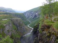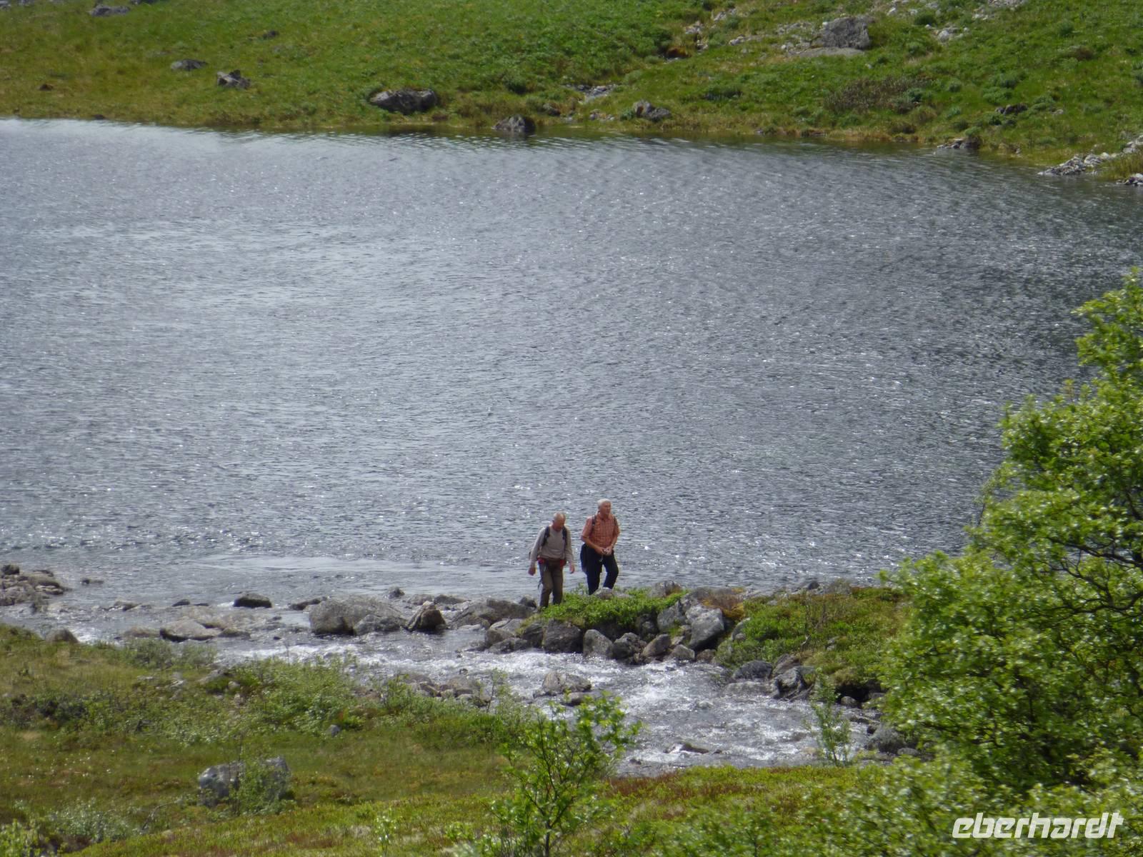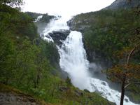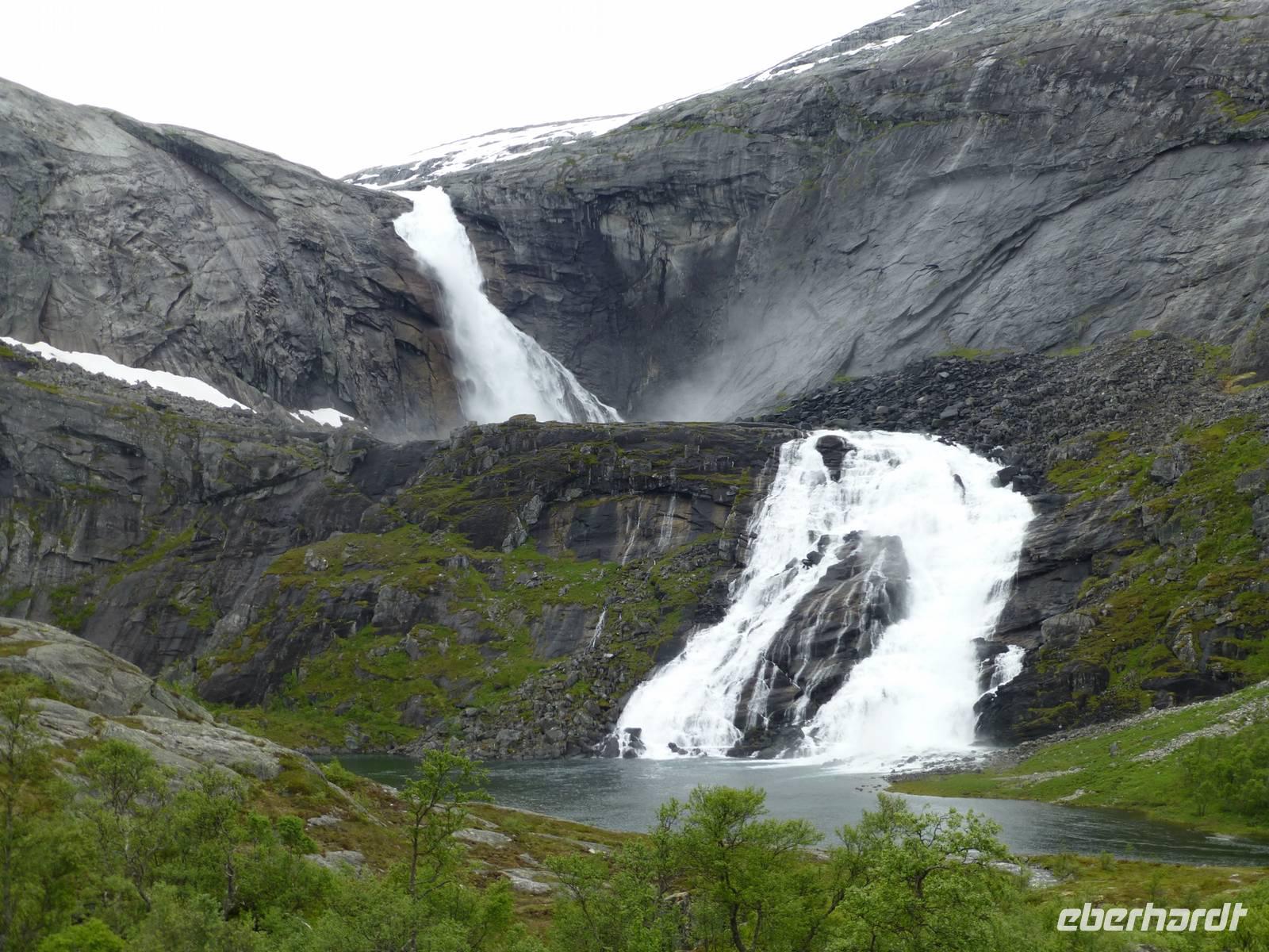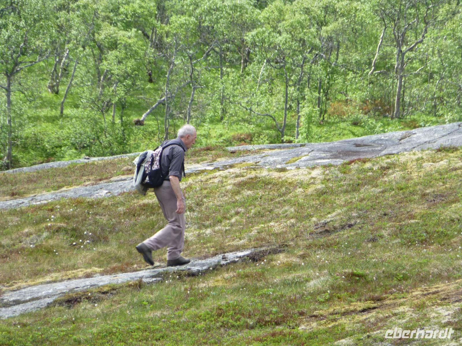 Über einen Fahrweg steigen wir hinauf zu einem kleinen Staubecken, welches für das Wasserkraftwerk benötigt wird. Der Weg führt weiter durch reichlich Vegetation und schon von weiten hört man den zweiten Wasserfall, den ca. 180 m hohen Nyastølfoss, rauschen, auf welchen wir bald einen ungehinderten Blick haben. Über teilweise blanken Fels erreichen wir die nächste Stufe und haben einen tollen Blick zum Wasserfall Nummer drei, dem ca. 80 m hohen Nykjesøyfoss. Die dazugehörige Alm lädt zu einer Rast ein, voller Bewunderung genießen wir die Natur. Noch einmal steigt der Weg steil an und wir kommen schon über die Baumgrenze. Im nächsten gewaltigen Tal sehen wir wie sich der ca. 240 m hohe Søtefoss sich in zwei Stufen von der Hardangervidda herabstürzt. Noch einmal ein Platz zum verweilen um staunend die Naturgewalten zu bewundern. Auch die Flora hat wieder einiges zu bieten, so finden wir ganze Teppiche von Multebeeren. Bis zum zweiten Wasserfall gehen wir auf gleichem Weg zurück um dann den Fahrweg hinab ins Tal zu nutzen. Glücklich und froh erreichen wir wieder unseren Bus und fahren nach Brimnes um von dort nach Bruravik überzusetzen. Welch ein Schreck, an der Fähre ist eine lange Schlange und so müssen wir eine Stunde warten bis wir mit der Fähre fahren können. Zum Abschluß drehen wir noch eine Runde im Granvintunnel. Ja Richtig eine Runde, denn im Tunnel befindet sich ein blau beleuchteter Kreisverkehr, welcher den Zugang zur Hardangerbrücke ermöglicht, welche im August eröffnet wird. Zum Abschluss des Tages treffen wir uns alle noch auf ein Gläschen Sekt um auf die schönen Tage anzustoßen.