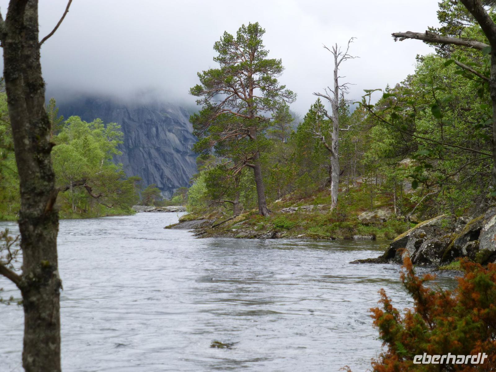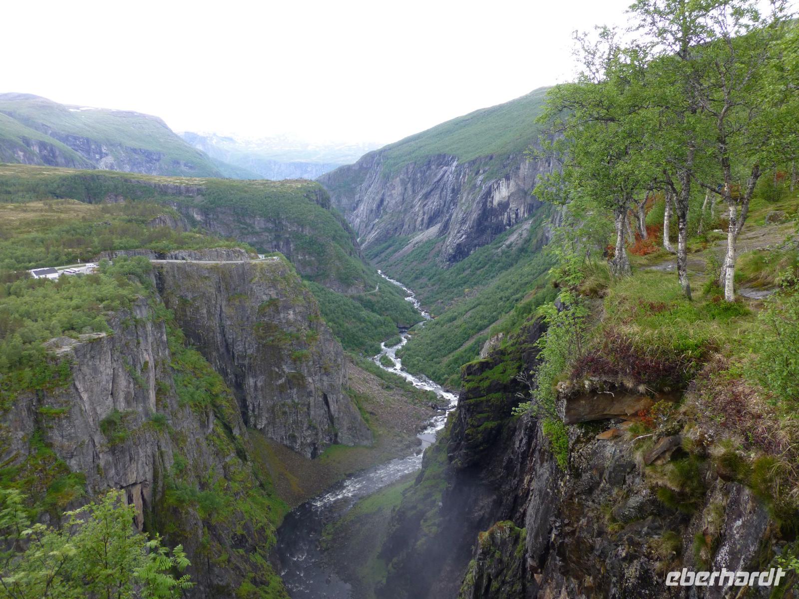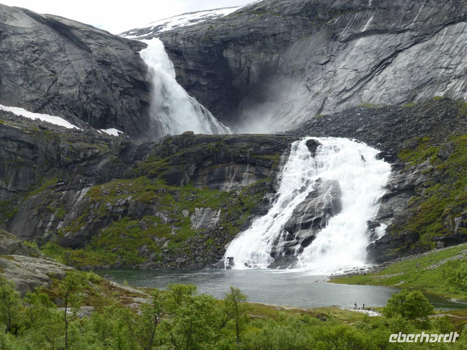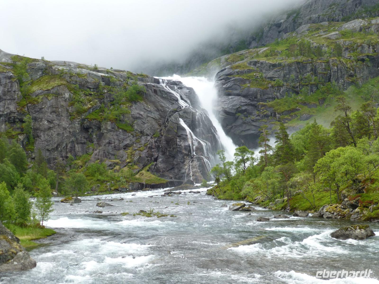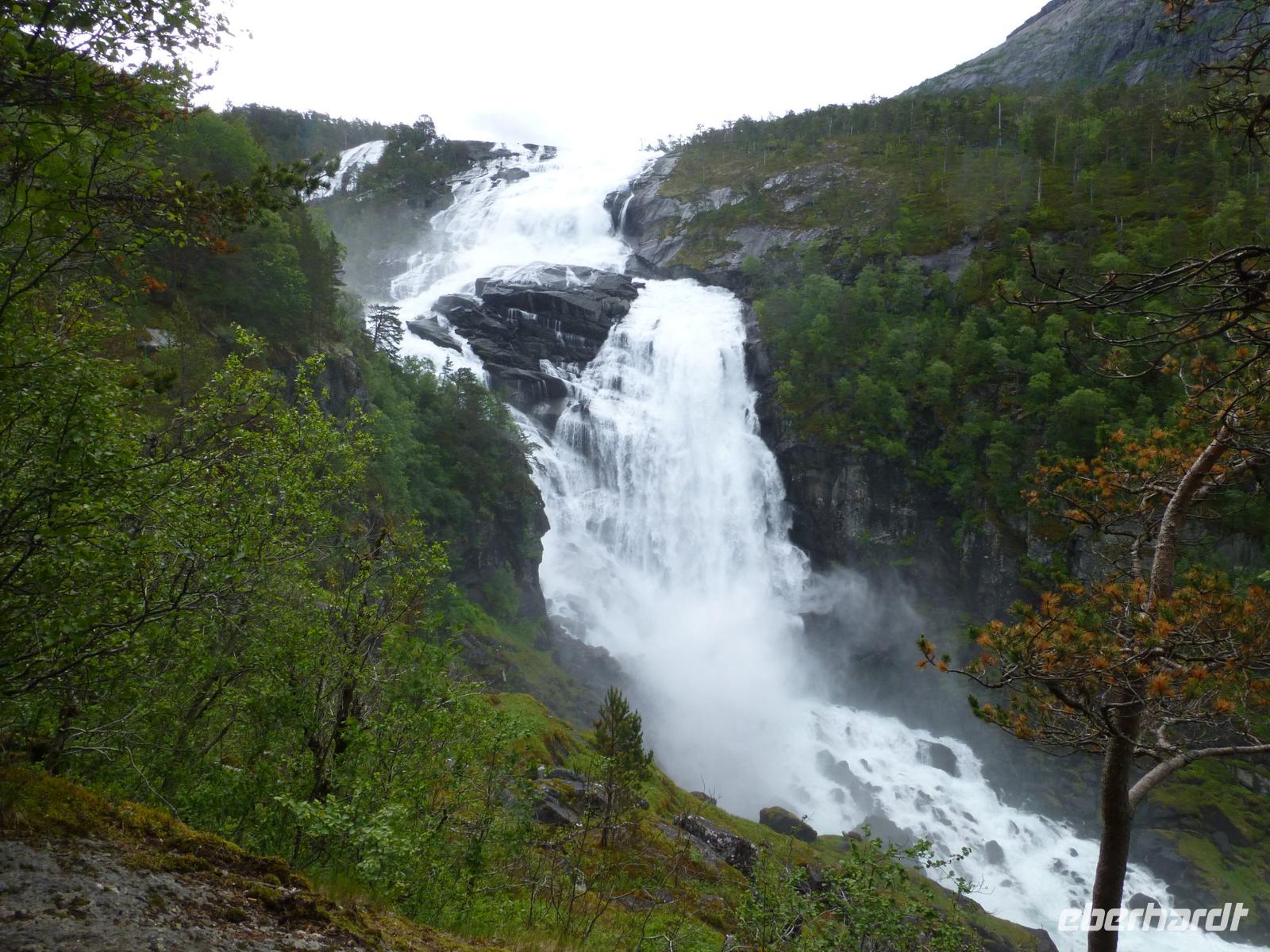 Das Wetter am Morgen zeigt sich bereits von seiner besten Seite und das wird sich auch an diesem Tag nicht ändern. Mit der Fähre setzen wir über nach Brimnes und fahren dann die wenigen Kilometer nach Kinsarvik und von dort hinein ins Husedal. Am Parkplatz beginnen wir unsere Wanderung die zuerst entlang des Kinso - Flusses bis zum Wasserkraftwerk führt. Hier erleben wir den ersten tosenden Wasserfall, den ca. 100 m hohen Tveitafoss.