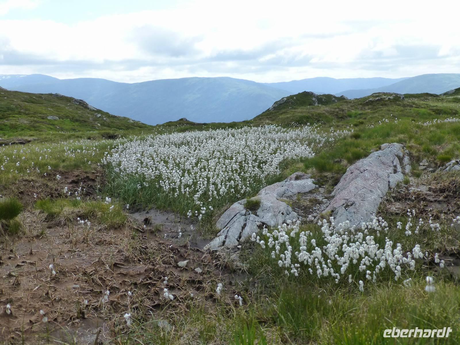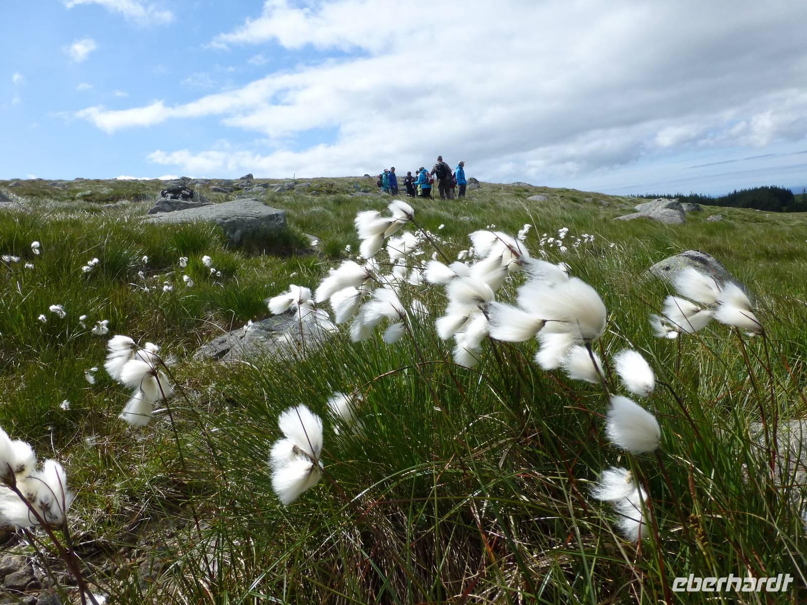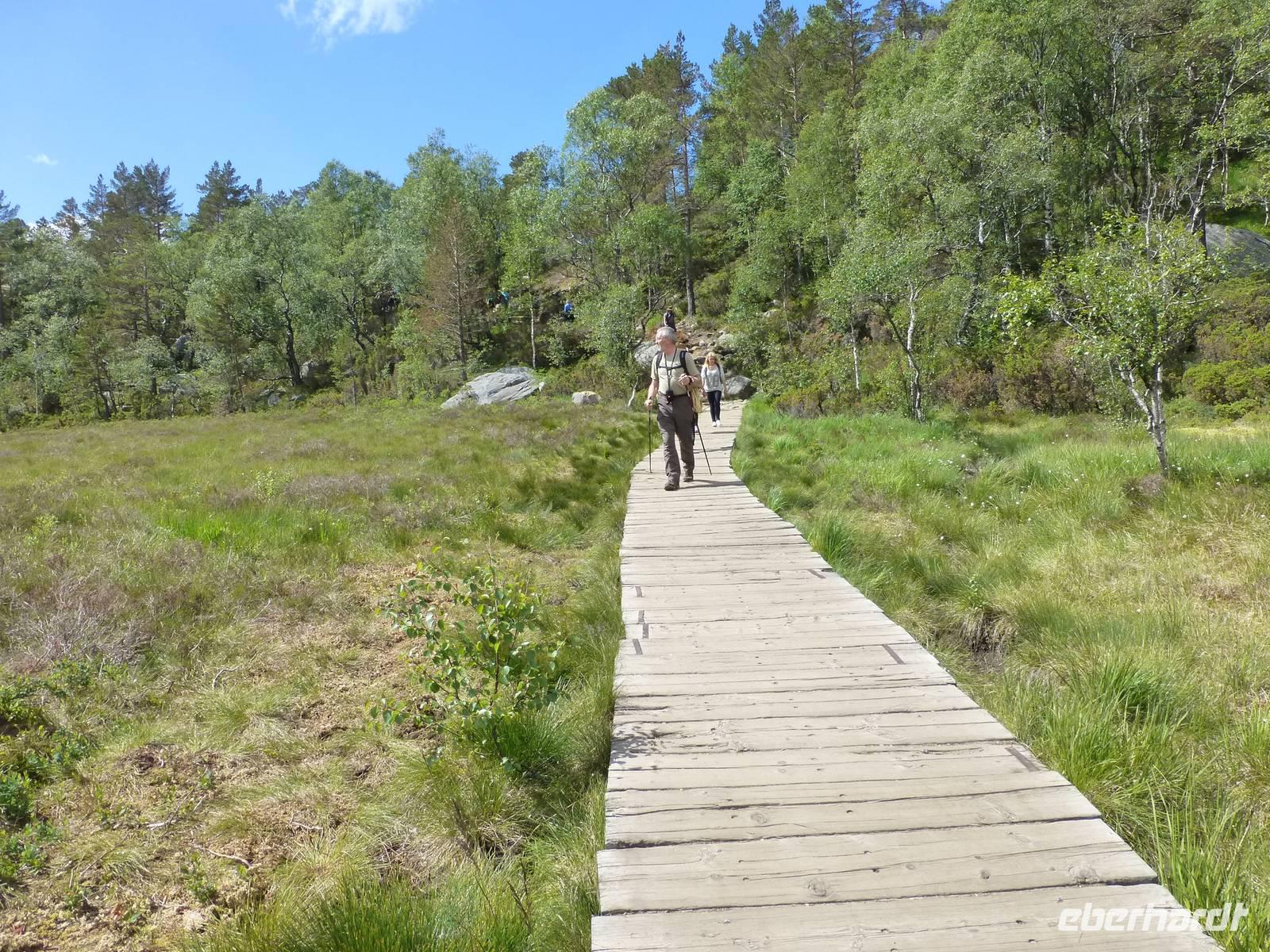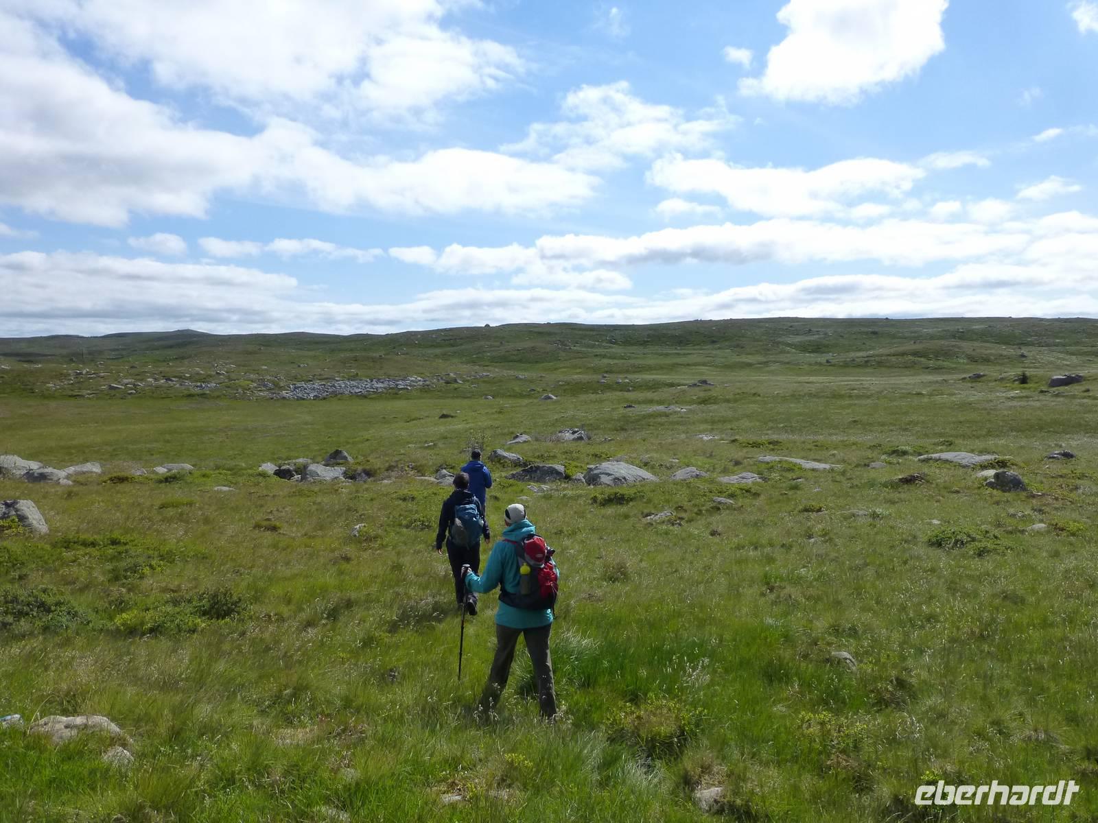 Zum Frühstück genießen wir das Skandinavische Frühstücksbüffet im Hotel. Hier kann sich auch jeder nach Belieben ein Lunchpaket zusammenstellen. Danach geht es auf zu unserer ersten Wanderung. Nach gut einer Stunde Fahrt beginnen wir unsere Wanderung am kleinen Stausee Vandavatnet. Durch Weideland für Kühe und Schafe, später durch offene Moorlandschaft erreichen wir schließlich den 306 m hohen Gauleksvarden. einiges an interessanten Pflanzen zu entdecken. So u.a. Echtes Fettkraut, Beinbrech oder Gelbe Moorlilie, geflecktes Knabenkraut und Wollgras. Dann steigen wir wieder leicht ab um die "Steinkjerinnga" zu erreichen. Die Steinfrau, ein Skulptur von Sigur Sørendsen aus dem Jahre 1898-99, auch Mutter Norwegens genannt, wacht über das weite Land. Sie wurde 1925 an diesem Platz aufgestellt. Jetzt wandern wir hinüber zum 359 m hohen Synesvarden. Bei wunderschönem Wetter und starkem Wind genießen wir die Aussicht auf die Umgebung und unser mitgebrachtes Mittagsbrot. Danach erfolgt der Abstieg zum See "Holmavatnet", wo Kersten mit dem Bus wartet. Auf dem Weg zurück nach Stavanger machen wir noch einen Halt am Sandstrand bei Orre. Nach dem Abkühlen der Füße in der Nordsee ist ein Spaziergang durch den warmen Sand richtig toll.