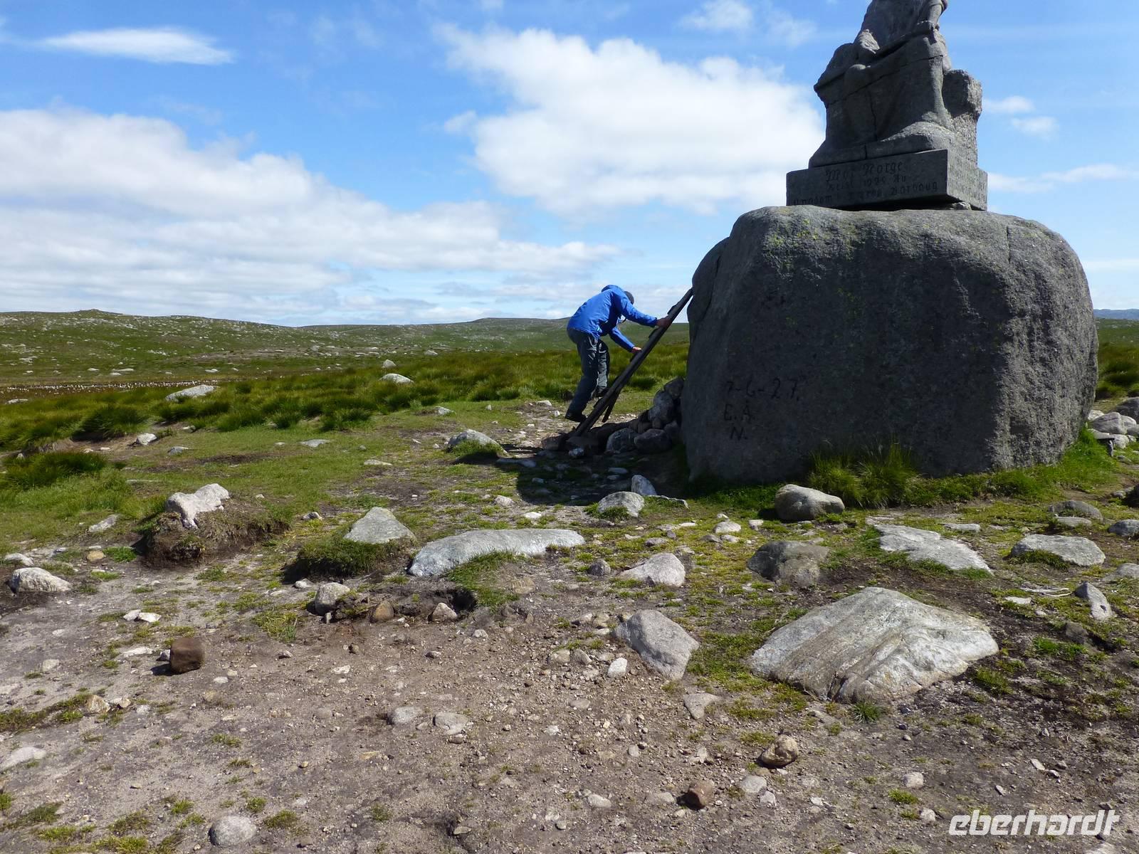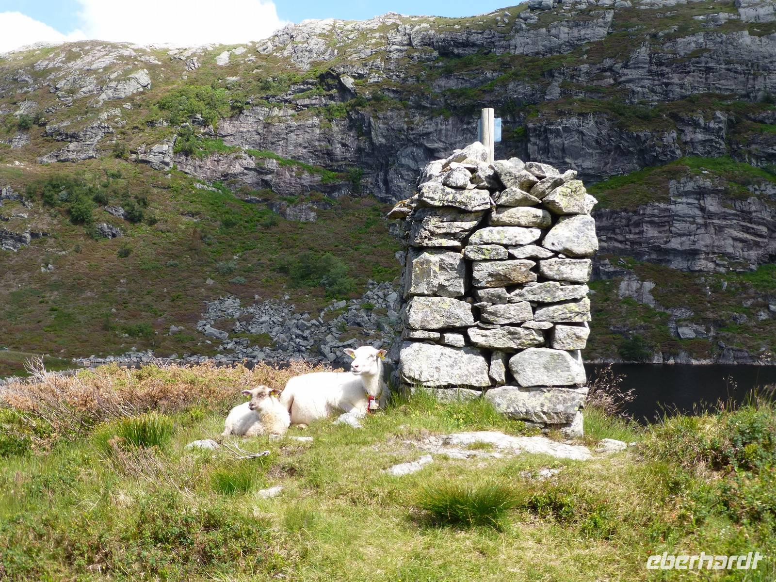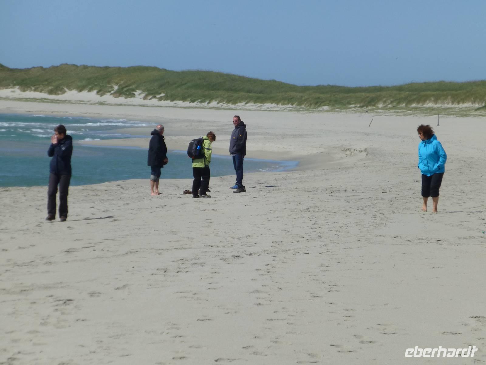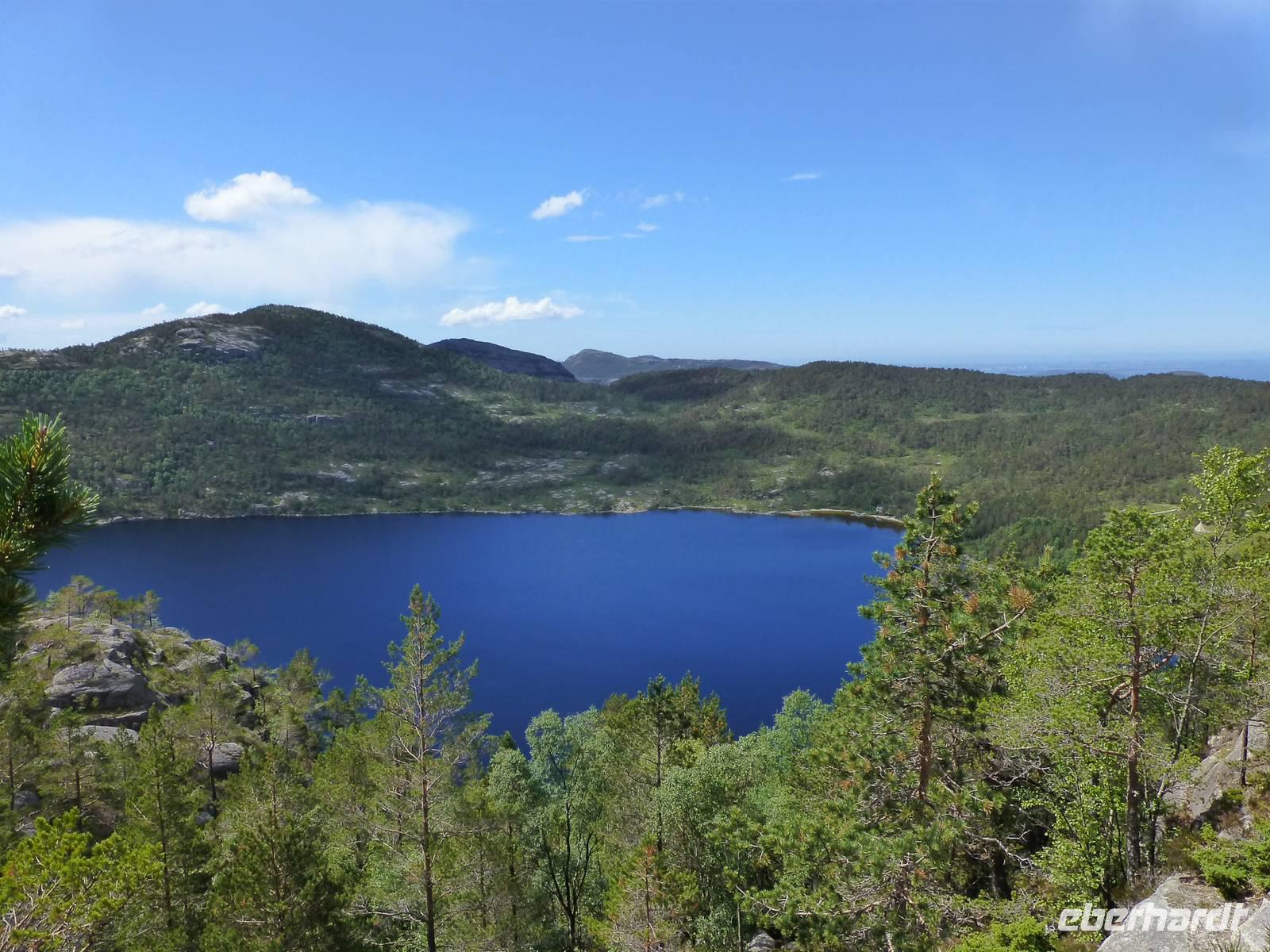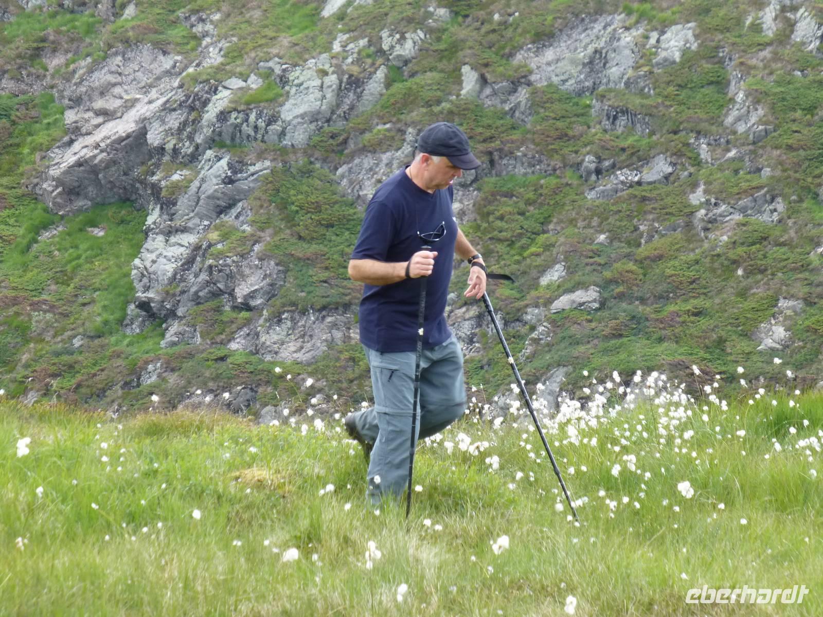 Zum Frühstück genießen wir das Skandinavische Frühstücksbüffet im Hotel. Hier kann sich auch jeder nach Belieben ein Lunchpaket zusammenstellen. Danach geht es auf zu unserer ersten Wanderung. Nach gut einer Stunde Fahrt beginnen wir unsere Wanderung am kleinen Stausee Vandavatnet. Durch Weideland für Kühe und Schafe, später durch offene Moorlandschaft erreichen wir schließlich den 306 m hohen Gauleksvarden. einiges an interessanten Pflanzen zu entdecken. So u.a. Echtes Fettkraut, Beinbrech oder Gelbe Moorlilie, geflecktes Knabenkraut und Wollgras. Dann steigen wir wieder leicht ab um die "Steinkjerinnga" zu erreichen. Die Steinfrau, ein Skulptur von Sigur Sørendsen aus dem Jahre 1898-99, auch Mutter Norwegens genannt, wacht über das weite Land. Sie wurde 1925 an diesem Platz aufgestellt. Jetzt wandern wir hinüber zum 359 m hohen Synesvarden. Bei wunderschönem Wetter und starkem Wind genießen wir die Aussicht auf die Umgebung und unser mitgebrachtes Mittagsbrot. Danach erfolgt der Abstieg zum See "Holmavatnet", wo Kersten mit dem Bus wartet. Auf dem Weg zurück nach Stavanger machen wir noch einen Halt am Sandstrand bei Orre. Nach dem Abkühlen der Füße in der Nordsee ist ein Spaziergang durch den warmen Sand richtig toll.