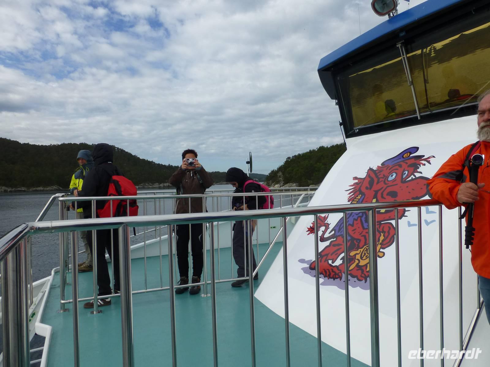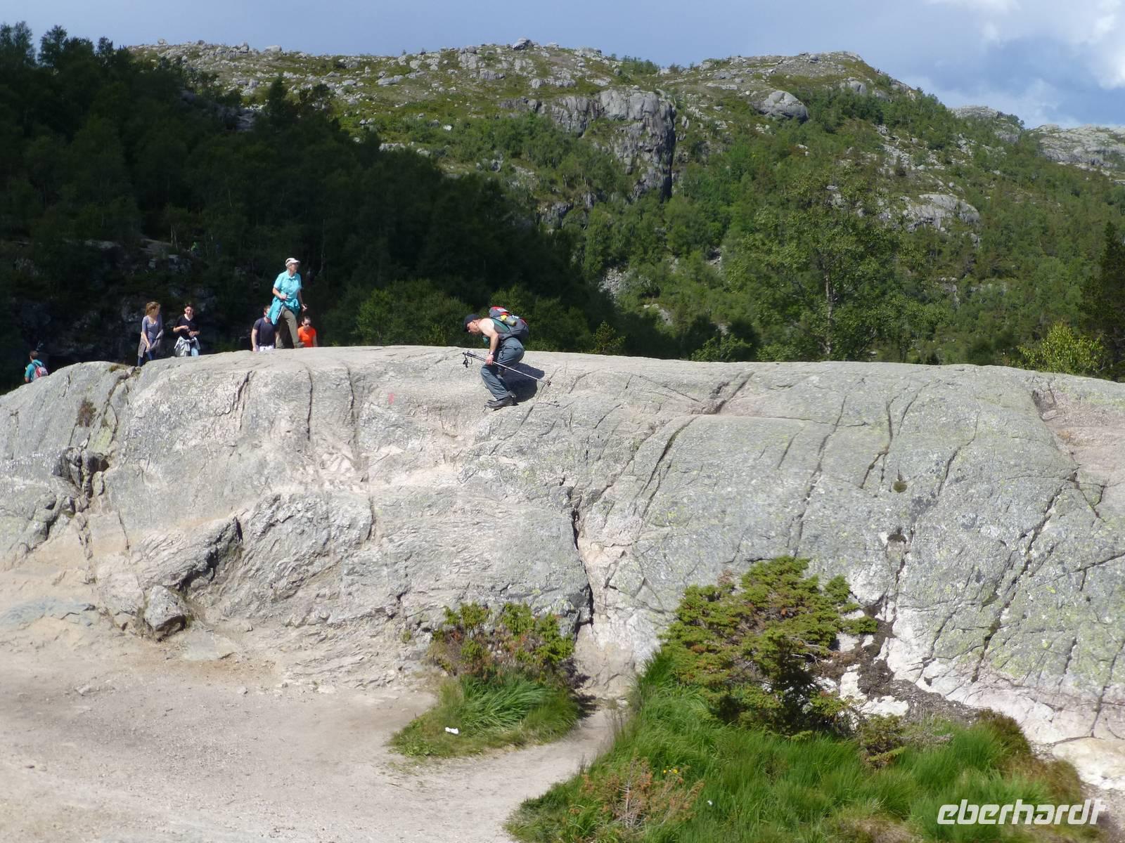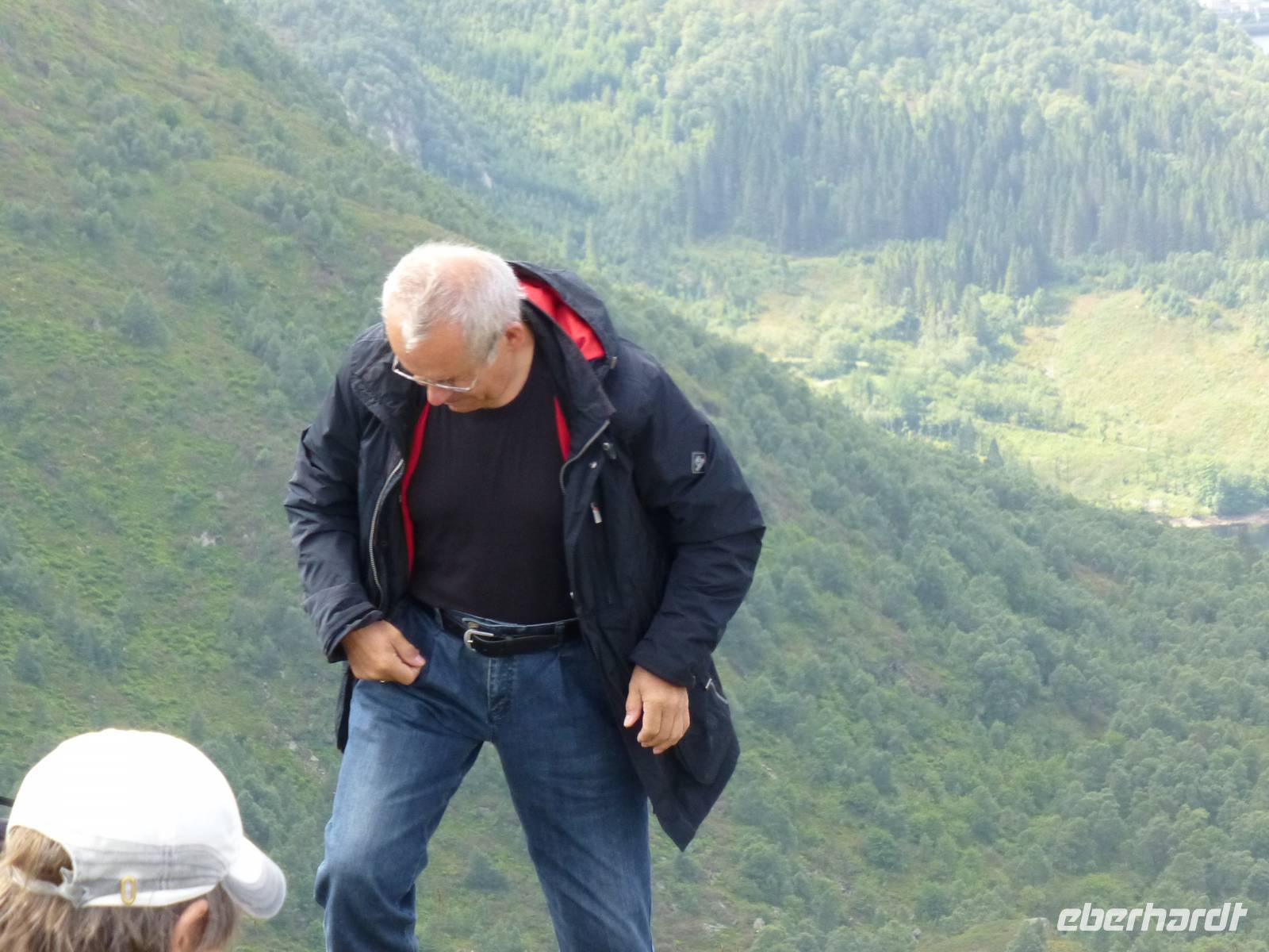 Bereits zum Frühstück lacht wieder die Sonne und so verspricht nicht nur der Wetterbericht einen schönen Tag. Vom Altstadthafen fahren wir mit dem Schiff in den Lysefjord. Allein schon die Fahrt dahin ist ein Erlebnis, eine Bilderbuchlandschaft zieht an uns vorbei. An verschiedenen Punkten wird während der Tour erklärt, wir bekommen ein Faltblatt mit den entsprechenden Erklärungen. Bei Oanes biegen wir dann in den Lysefjord ein, der über 40 km lang ist. Und dann können wir schon mal unser Wanderziel von unten bestaunen, die mächtige Felskanzel des Preikestolen. Nach dem Wasserfall, dessen Wasser wir auch auf dem Schiff verkosten können, legt das Schiff am Lysefjordcenter an, wo wir es verlassen. Mit einem Transferbus fahren wir jetzt zur Preikestolenhytta, wo der Aufstieg zum Preikestolen beginnt. Gleich zu Beginn steigt der Weg kräftig an, wird dann wieder etwas flacher bevor wir zwei weitere Höhenstufen zu überwinden haben. Der Weg erfordert dabei unsere ganze Aufmerksamkeit, verläuft er doch zum großen Teil über Bruchsteine, kann aber als gut ausgebaut bezeichnet werden. Das letzte Stück ist dann nicht mehr ganz so schwer und der Weg am Felsrand entlang ist auch gut gesichert. Und dann ist „Sie" da, die Plattform der Predigtkanzel, wie der Gipfel auf Deutsch heißt. Wir blicken von 604 m hinab auf den Lysefjord und das umliegende Land. Ein mächtiger Anblick. Einige Mutige legen sich auf den Bauch und wagen einen Blick über den Rand nach unten. Ein Erlebnis und alle sind froh diesen Weg geschafft zu haben. Nach einer Pause beginnt der Abstieg über den gleichen Weg. Von der Prekestolenhytta fahren wir dann zu Fähre nach Tau um von dort nach Stavanger über zu setzen. Die letzten Meter zum Hotel legen wir dann nochmal zu Fuß zurück. Wir sind geschafft aber froh.