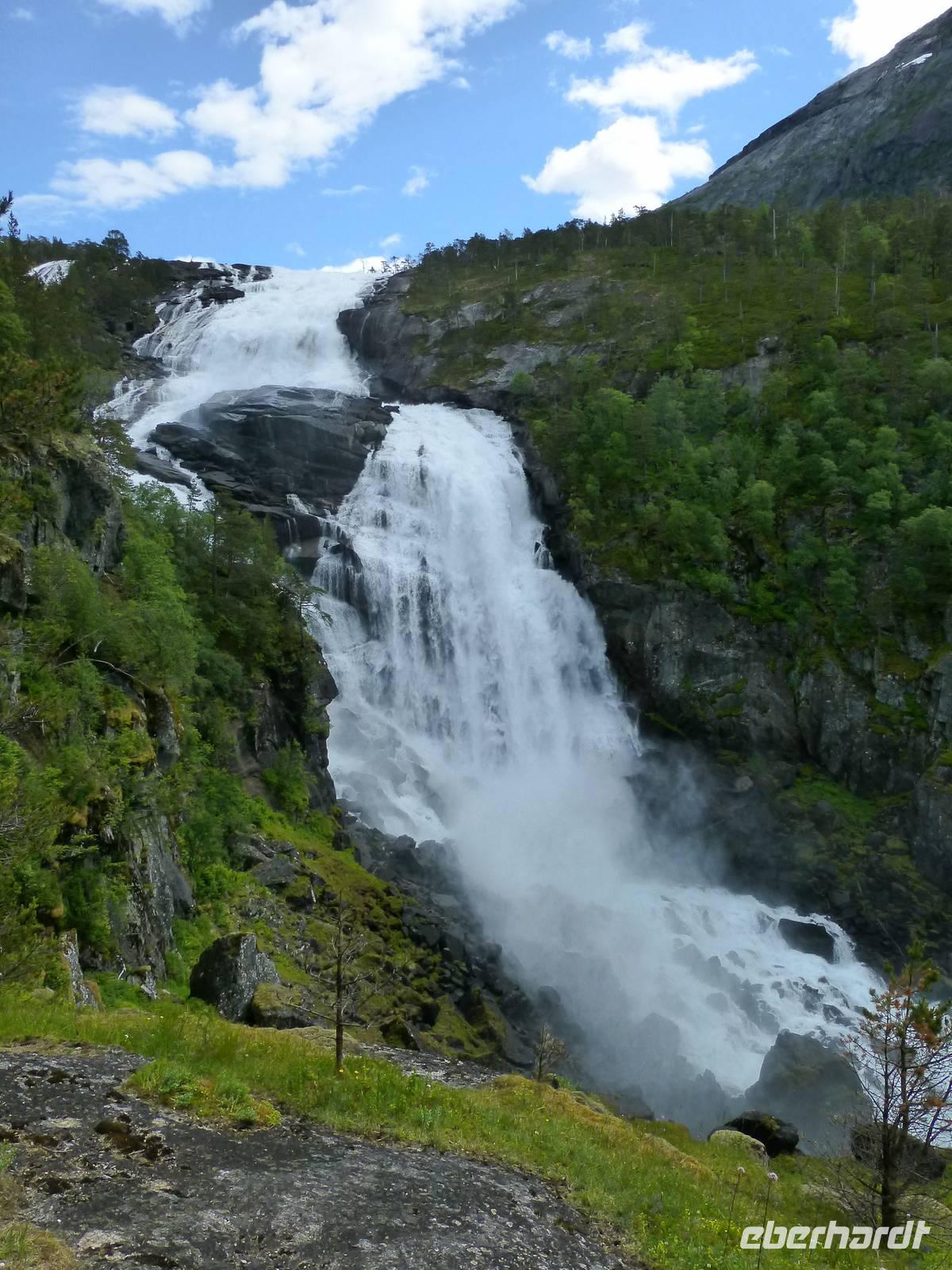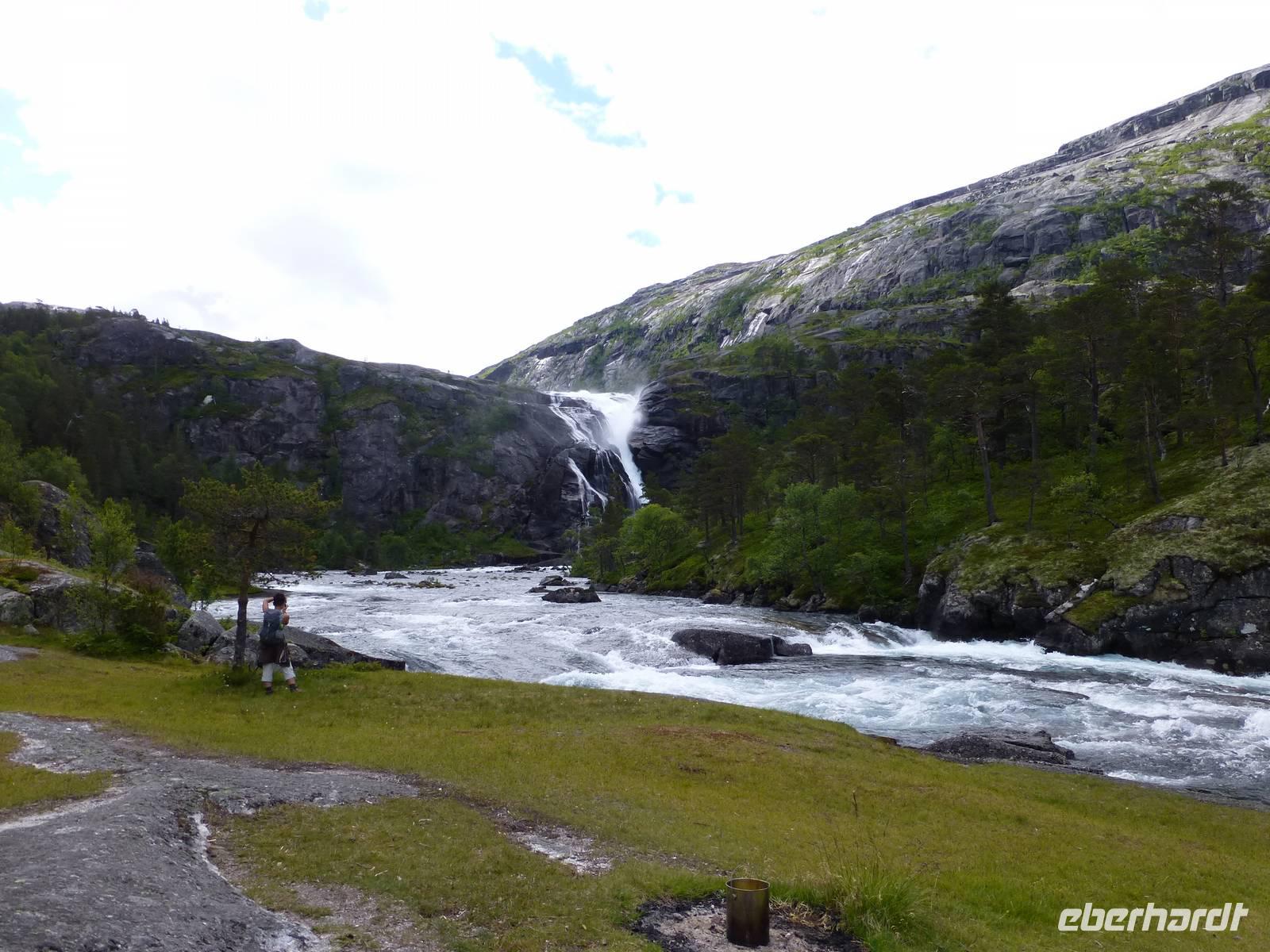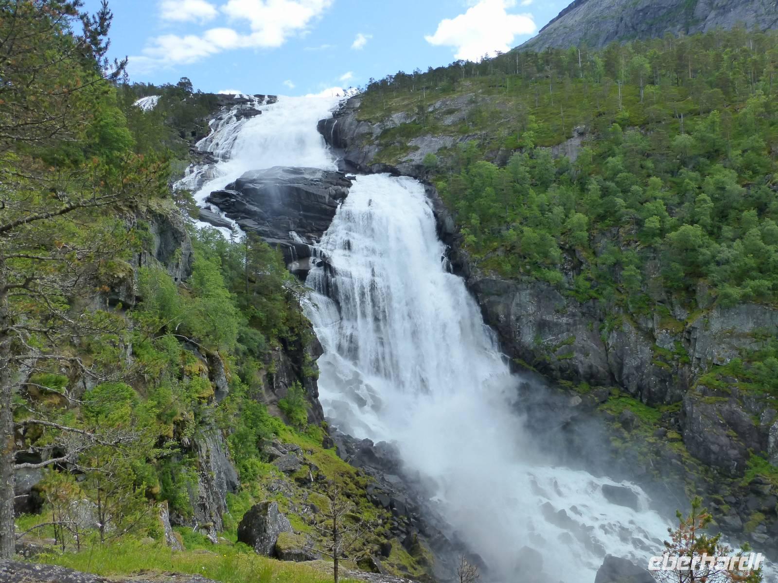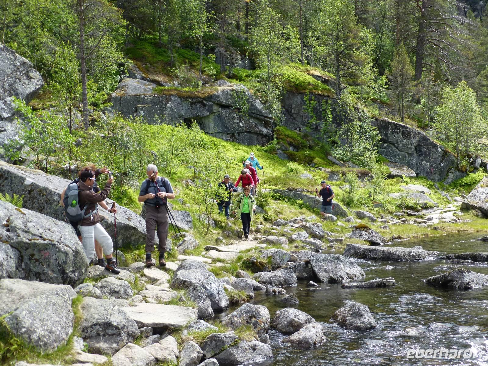 Das Wetter am Morgen zeigt sich bereits von seiner besten Seite und das wird sich auch an diesem Tag nicht ändern. Mit dem Bus fahren wir bis zum Wanderparkplatz im Husedalen. Am Parkplatz beginnen wir unsere Wanderung die zuerst entlang des Kinso - Flusses bis zum Wasserkraftwerk führt. Hier erleben wir den ersten tosenden Wasserfall, den ca. 100 m hohen Tveitafoss.
