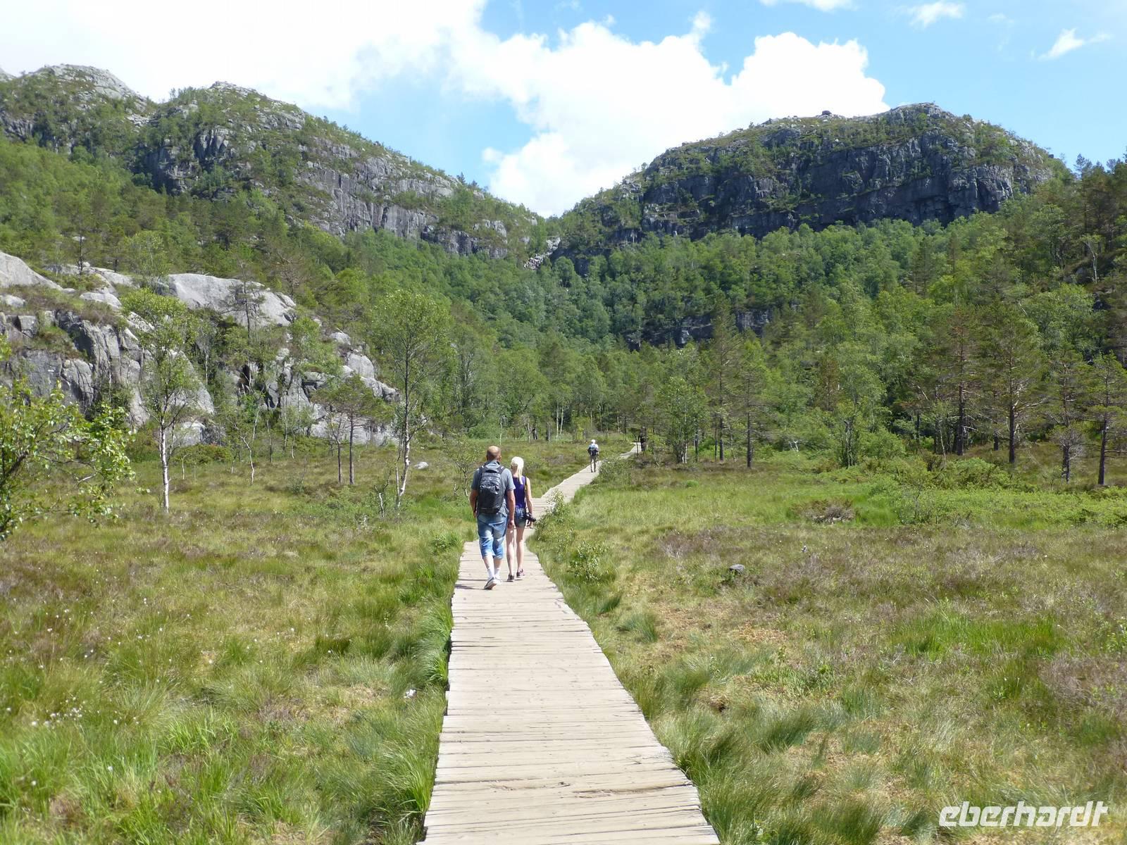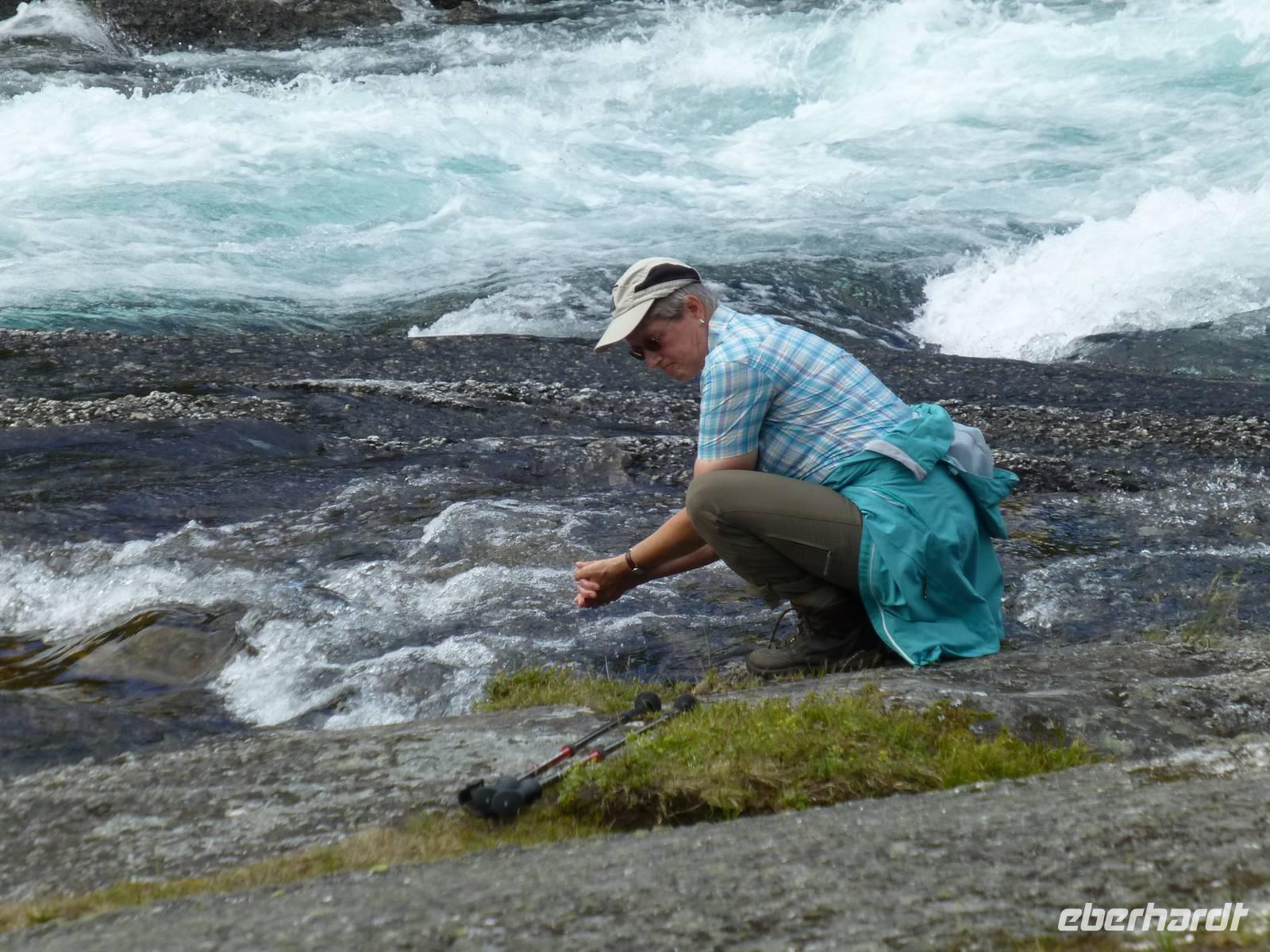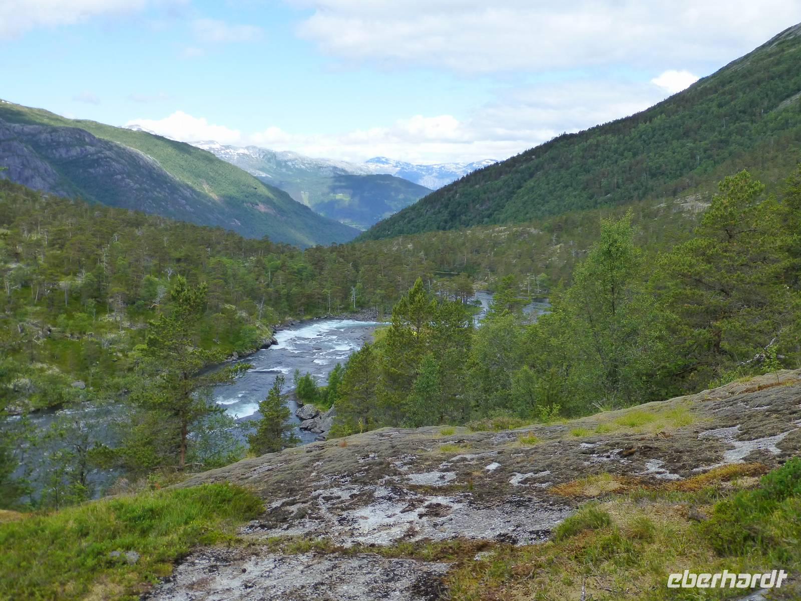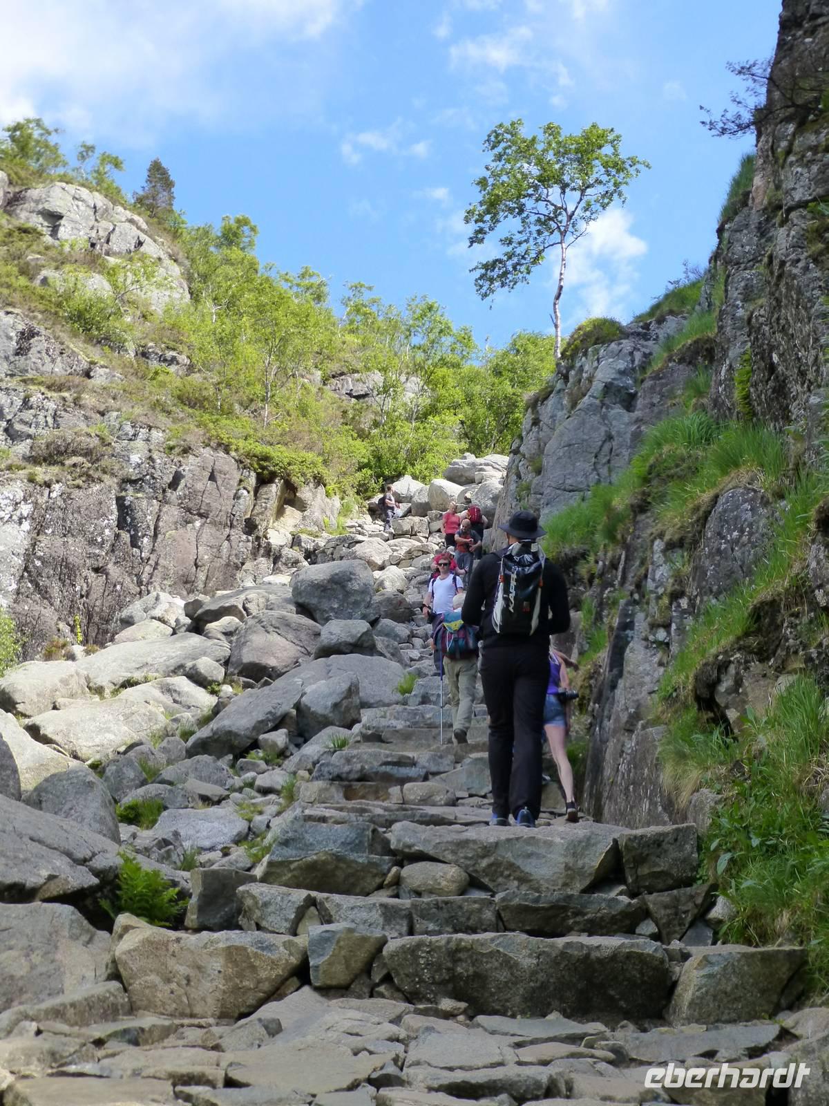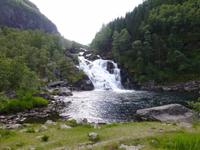 Das Wetter am Morgen zeigt sich bereits von seiner besten Seite und das wird sich auch an diesem Tag nicht ändern. Mit dem Bus fahren wir bis zum Wanderparkplatz im Husedalen. Am Parkplatz beginnen wir unsere Wanderung die zuerst entlang des Kinso - Flusses bis zum Wasserkraftwerk führt. Hier erleben wir den ersten tosenden Wasserfall, den ca. 100 m hohen Tveitafoss.