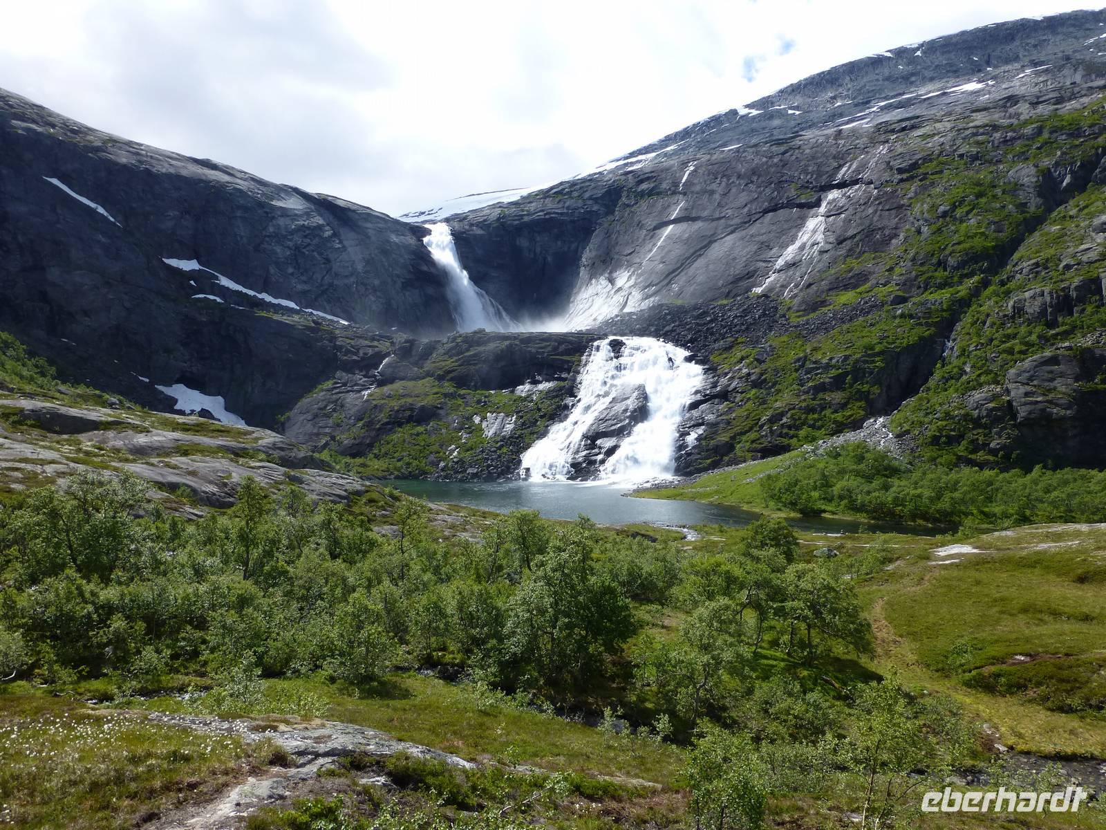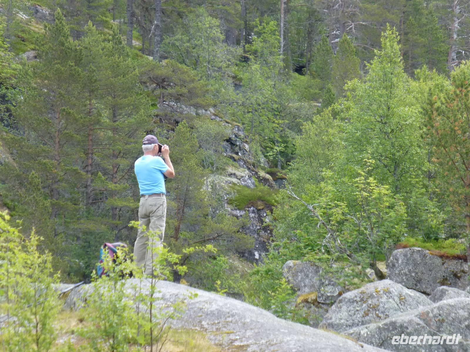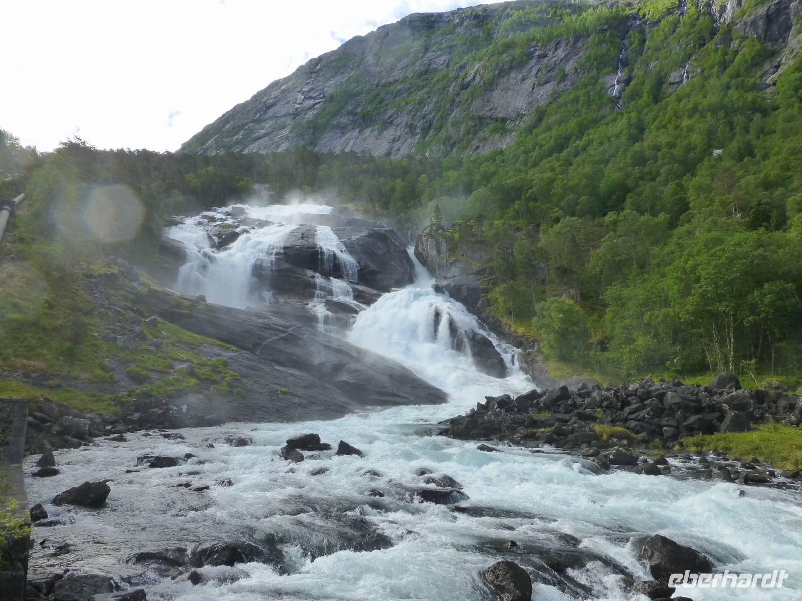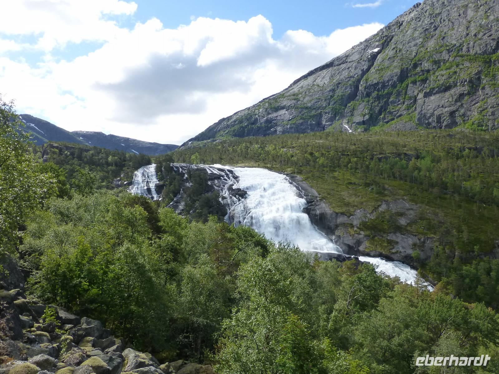 Über einen Fahrweg steigen wir hinauf zum zweiten Wasserfall, dem ca. 180 m hohen Nyastølfoss, den wir aber erstmal nur von weitem sehen können. Bald schon erreichen wir die nächste Stufe und haben einen tollen Blick zum Wasserfall Nummer drei, dem ca. 80 m hohen Nykjesøyfoss. Die dazugehörige Alm lädt zu einer Rast ein, voller Bewunderung genießen wir die Natur. Noch einmal steigt der Weg steil an und wir kommen schon über die Baumgrenze. Im nächsten gewaltigen Tal sehen wir wie sich der ca. 240 m hohe Søtefoss in zwei Stufen von der Hardangervidda herabstürzt. Noch einmal ein Platz zum Verweilen um staunend die Naturgewalten zu bewundern. Auch die Flora hat wieder einiges zu bieten, so finden wir Multebeeren, jede Menge Sonnentau und Krähenbeeren. Bis zum zweiten Wasserfall gehen wir auf gleichem Weg zurück um dann den Weg durch den Wald hinab ins Tal zu nutzen. So haben wir auch noch einmal einen ungehinderten Blick auf den zweiten Wasserfall, den Nyastølfoss, der mit seiner ganzen Schönheit und Urgewalt in das Tal hinabstürzt. Glücklich und froh erreichen wir wieder unseren Bus und ein gut gekühltes Bier aus unserer Bordküche erfrischt.