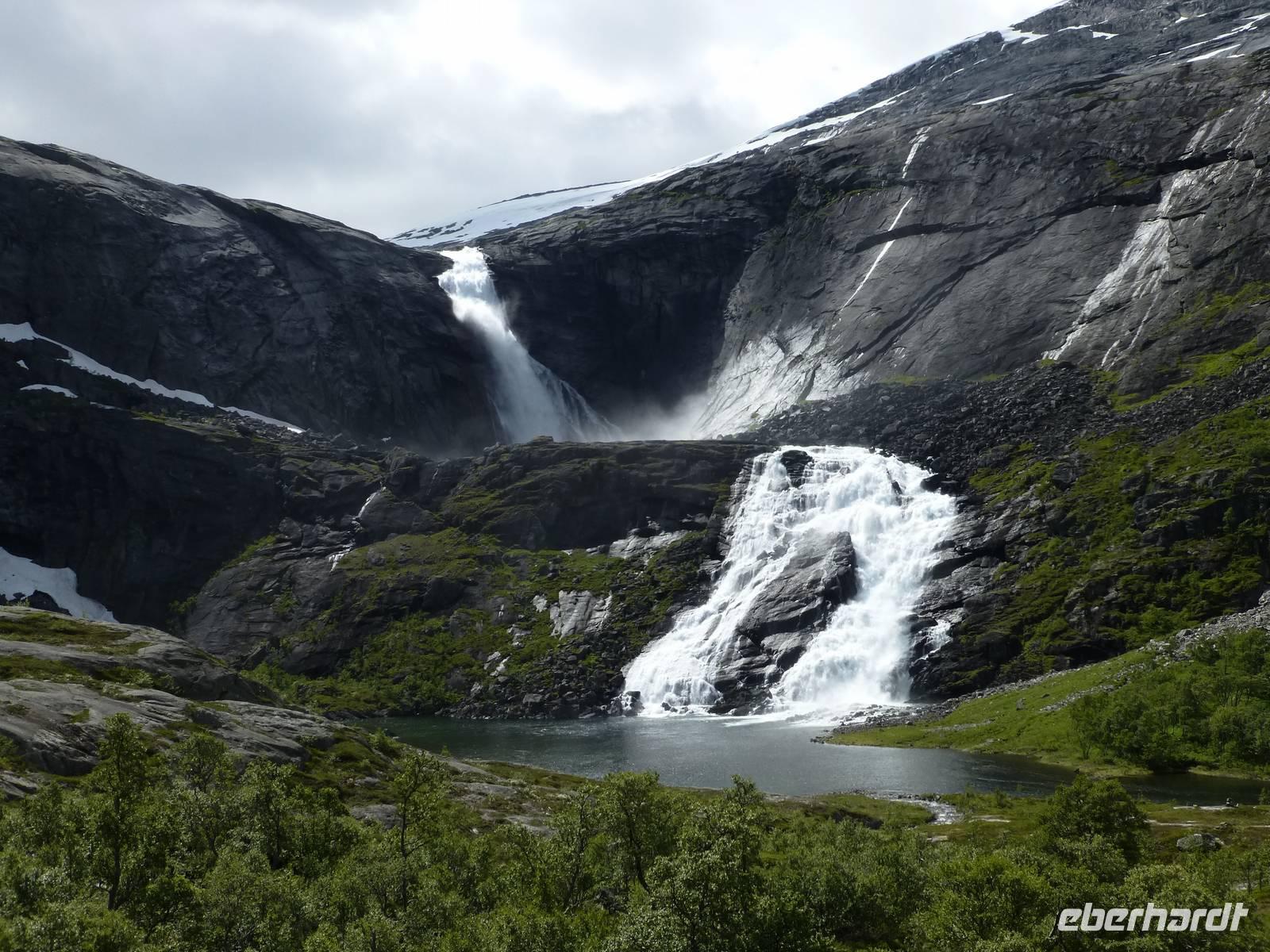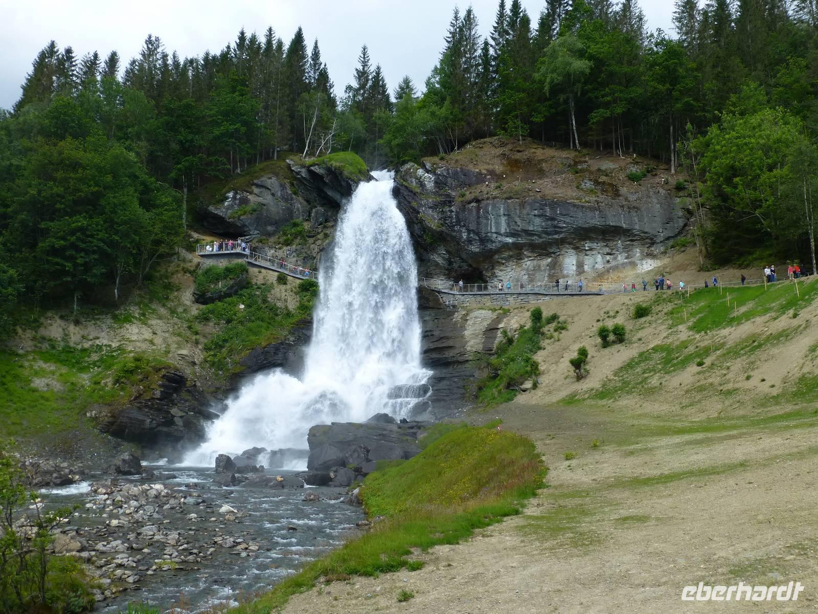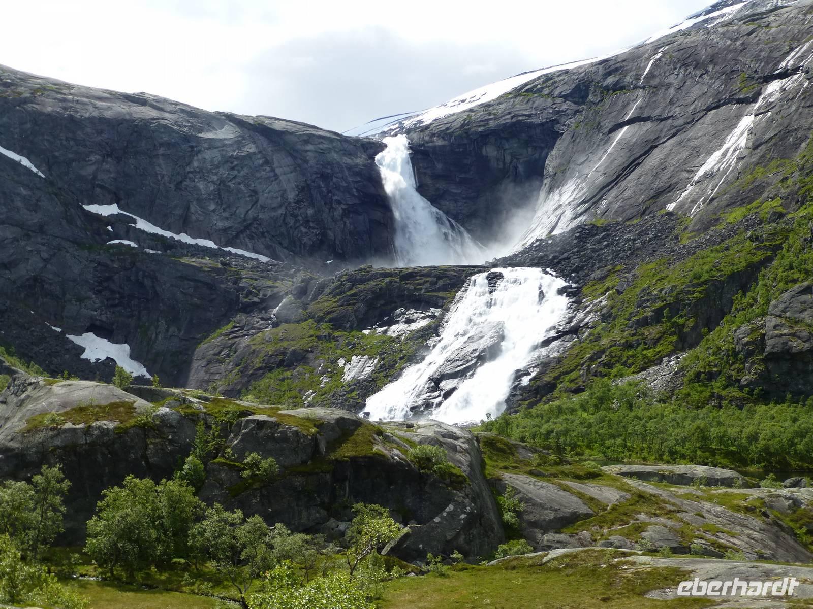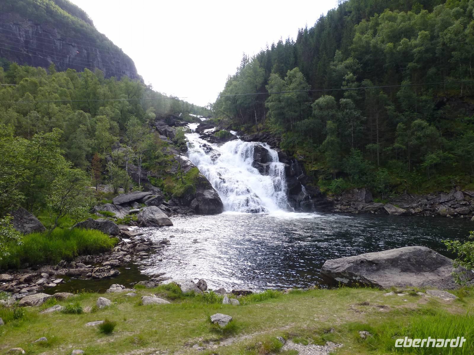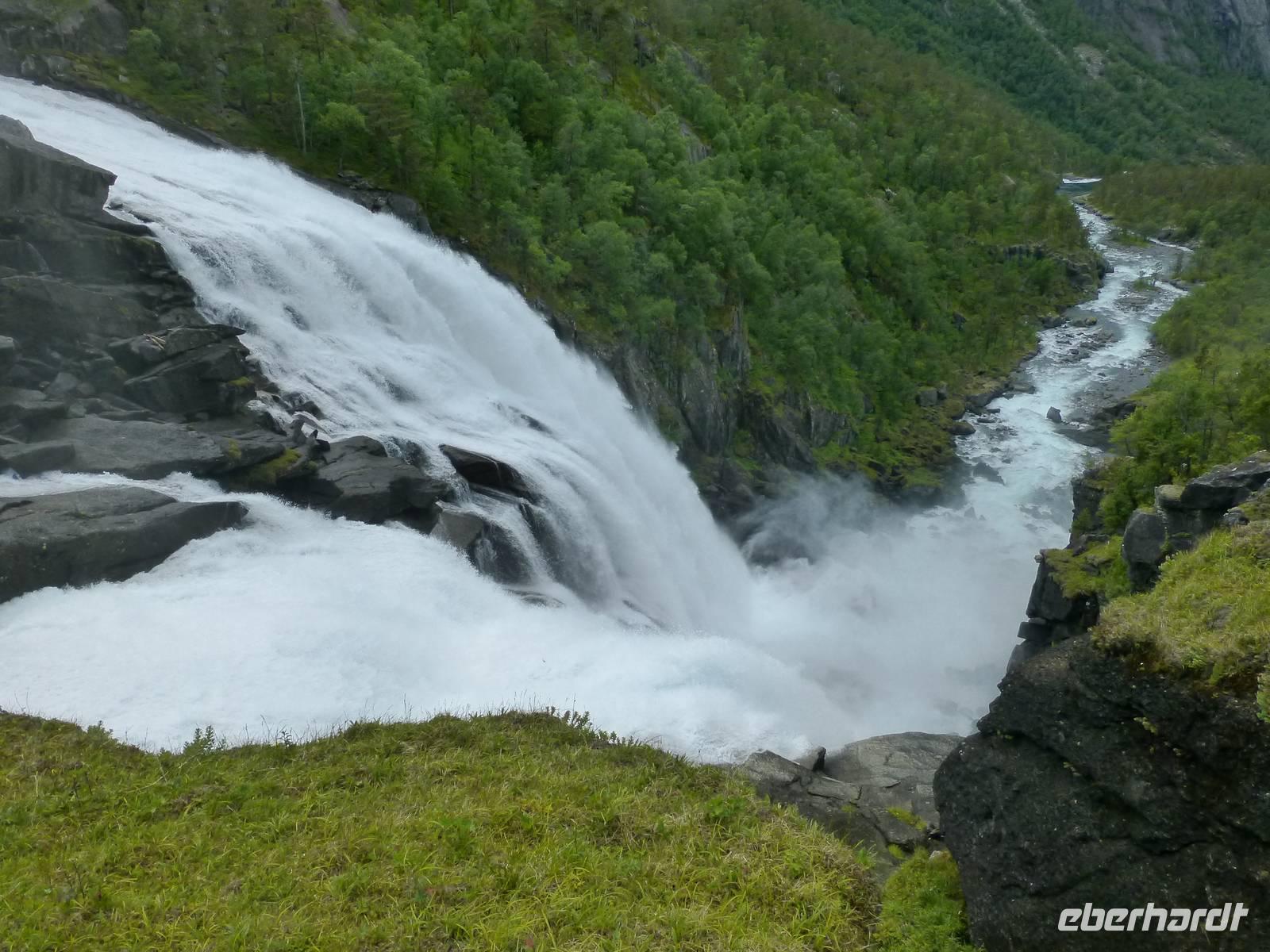 Über einen Fahrweg steigen wir hinauf zum zweiten Wasserfall, dem ca. 180 m hohen Nyastølfoss, den wir aber erstmal nur von weitem sehen können. Bald schon erreichen wir die nächste Stufe und haben einen tollen Blick zum Wasserfall Nummer drei, dem ca. 80 m hohen Nykjesøyfoss. Die dazugehörige Alm lädt zu einer Rast ein, voller Bewunderung genießen wir die Natur. Noch einmal steigt der Weg steil an und wir kommen schon über die Baumgrenze. Im nächsten gewaltigen Tal sehen wir wie sich der ca. 240 m hohe Søtefoss in zwei Stufen von der Hardangervidda herabstürzt. Noch einmal ein Platz zum Verweilen um staunend die Naturgewalten zu bewundern. Auch die Flora hat wieder einiges zu bieten, so finden wir Multebeeren, jede Menge Sonnentau und Krähenbeeren. Bis zum zweiten Wasserfall gehen wir auf gleichem Weg zurück um dann den Weg durch den Wald hinab ins Tal zu nutzen. So haben wir auch noch einmal einen ungehinderten Blick auf den zweiten Wasserfall, den Nyastølfoss, der mit seiner ganzen Schönheit und Urgewalt in das Tal hinabstürzt. Glücklich und froh erreichen wir wieder unseren Bus und ein gut gekühltes Bier aus unserer Bordküche erfrischt.