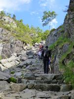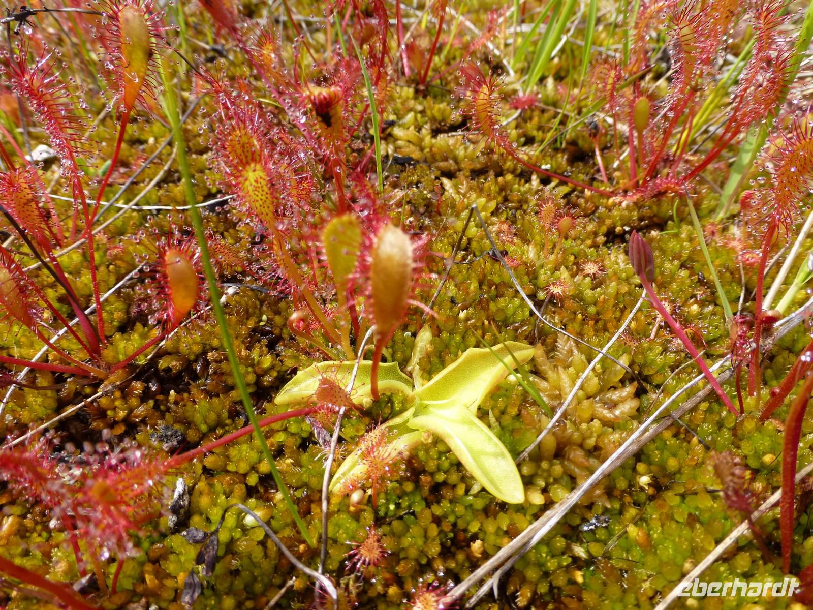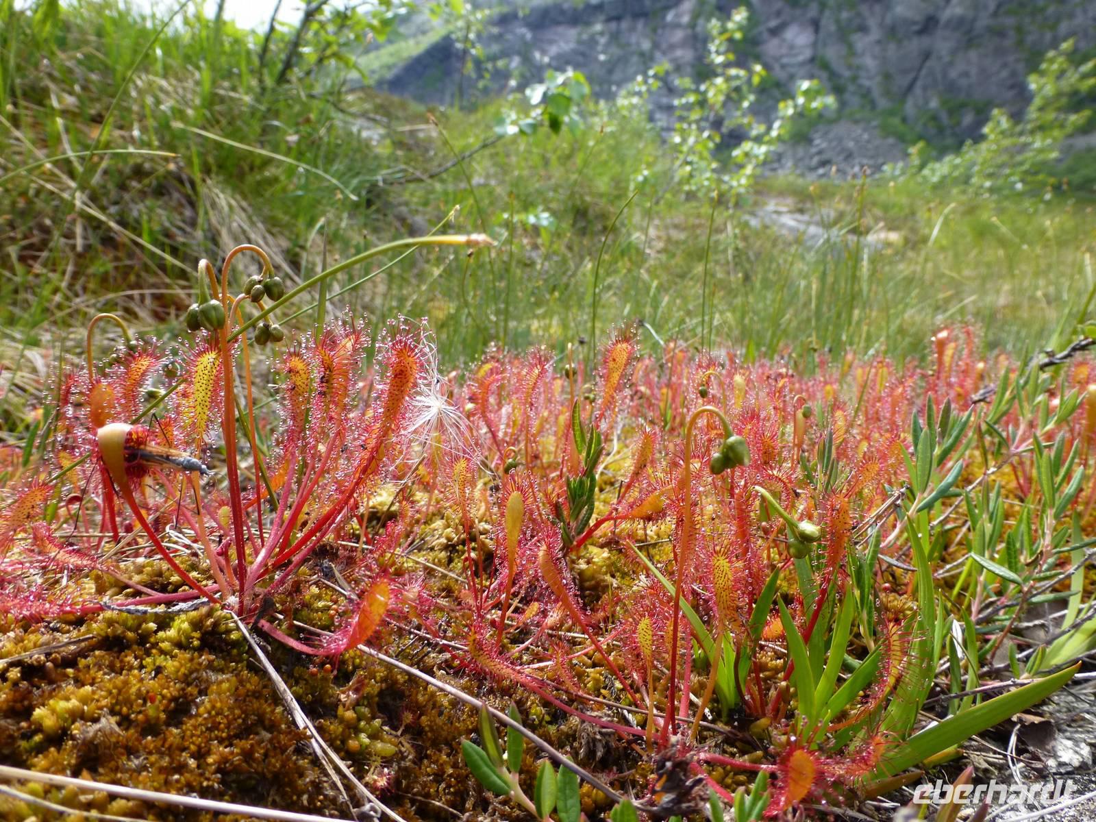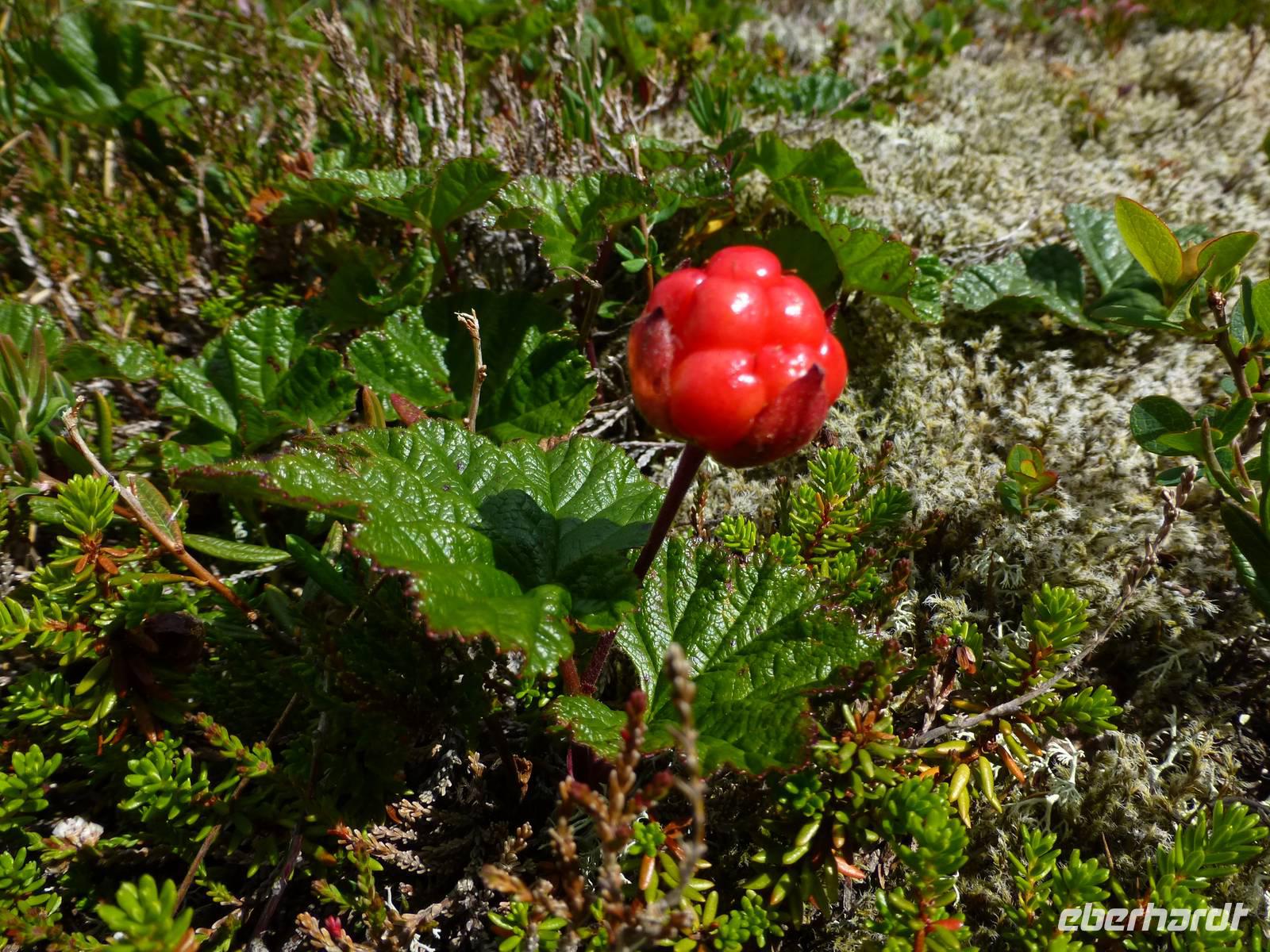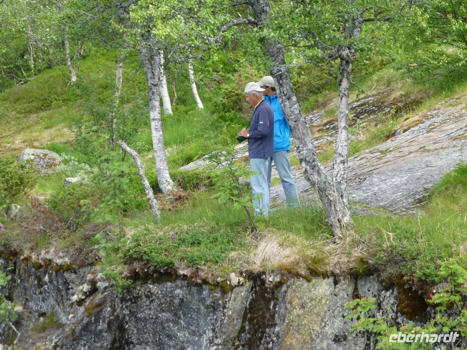 Über einen Fahrweg steigen wir hinauf zum zweiten Wasserfall, dem ca. 180 m hohen Nyastølfoss, den wir aber erstmal nur von weitem sehen können. Bald schon erreichen wir die nächste Stufe und haben einen tollen Blick zum Wasserfall Nummer drei, dem ca. 80 m hohen Nykjesøyfoss. Die dazugehörige Alm lädt zu einer Rast ein, voller Bewunderung genießen wir die Natur. Noch einmal steigt der Weg steil an und wir kommen schon über die Baumgrenze. Im nächsten gewaltigen Tal sehen wir wie sich der ca. 240 m hohe Søtefoss in zwei Stufen von der Hardangervidda herabstürzt. Noch einmal ein Platz zum Verweilen um staunend die Naturgewalten zu bewundern. Auch die Flora hat wieder einiges zu bieten, so finden wir Multebeeren, jede Menge Sonnentau und Krähenbeeren. Bis zum zweiten Wasserfall gehen wir auf gleichem Weg zurück um dann den Weg durch den Wald hinab ins Tal zu nutzen. So haben wir auch noch einmal einen ungehinderten Blick auf den zweiten Wasserfall, den Nyastølfoss, der mit seiner ganzen Schönheit und Urgewalt in das Tal hinabstürzt. Glücklich und froh erreichen wir wieder unseren Bus und ein gut gekühltes Bier aus unserer Bordküche erfrischt.