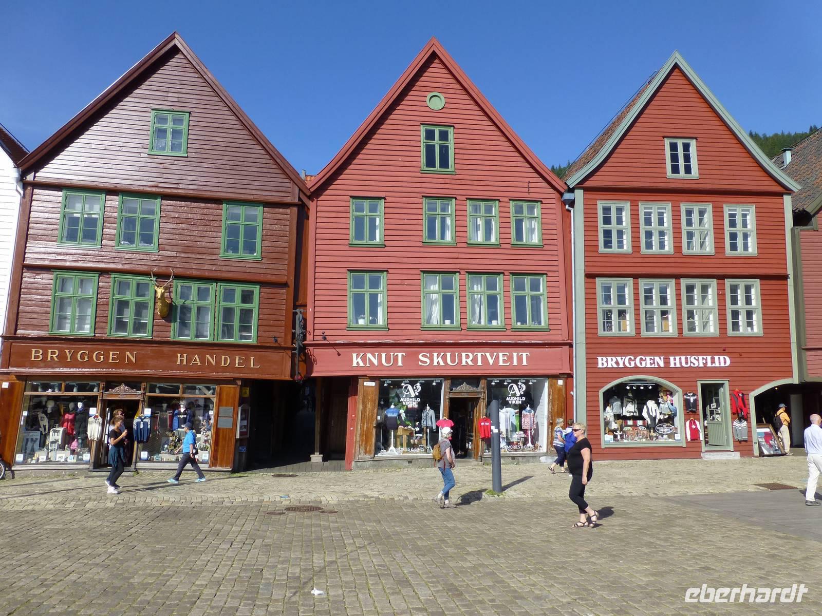 Heute verlassen wir Stavanger, unser Ziel ist die Stadt Bergen. Auf den knapp 200 Kilometern bis dahin durchfahren wir mehrere Tunnel, welche bis zu 8 Kilometer lang sind und immer unter dem Meer hindurchführen. Die tiefste Stelle die wir durchfahren liegt bei 260 m unter dem Meeresspiegel. Zweimal nutzen wir auch mit der Fähre, eine Abwechslung auf der auch landschaftlich schönen Strecke. Da wir gut in der Zeit liegen nehmen wir ab Lervik eine Nebenstraße, machen in Fitjar eine Mittagspause und erreichen dann am Nachmittag Bergen. Die Zeit reicht um zuerst im Hotel, dem Rica Hotel Bergen, unsere Zimmer zu beziehen und danach die Stadtrundfahrt zu beginnen. Gudrun ist unsere Stadtführerin. Sie bringt uns Bergen näher und zum Ende der Rundfahrt, welche uns in zahlreiche Stadtteile führte machen wir noch einen Spaziergang durch die Brygge. Dabei handelt es sich um die ehemaligen Handels- und Wohnhäuser der Hansekaufleute. In Bergen befand sich zur Hochzeit der Lübecker Hanse ein Kontor derselben. Haupthandelsware war Stockfisch, eingeführt wurde häufig Wein und Bier, aber auch Tuche aus England. Am Abend lassen wir uns das Essen in unserem Hotel schmecken.