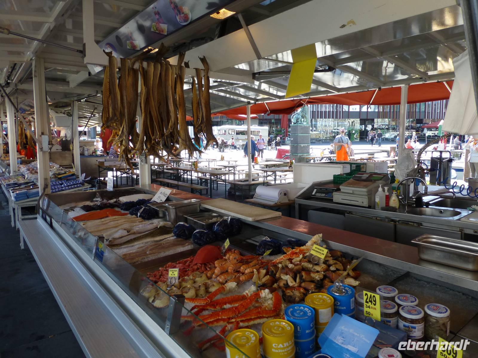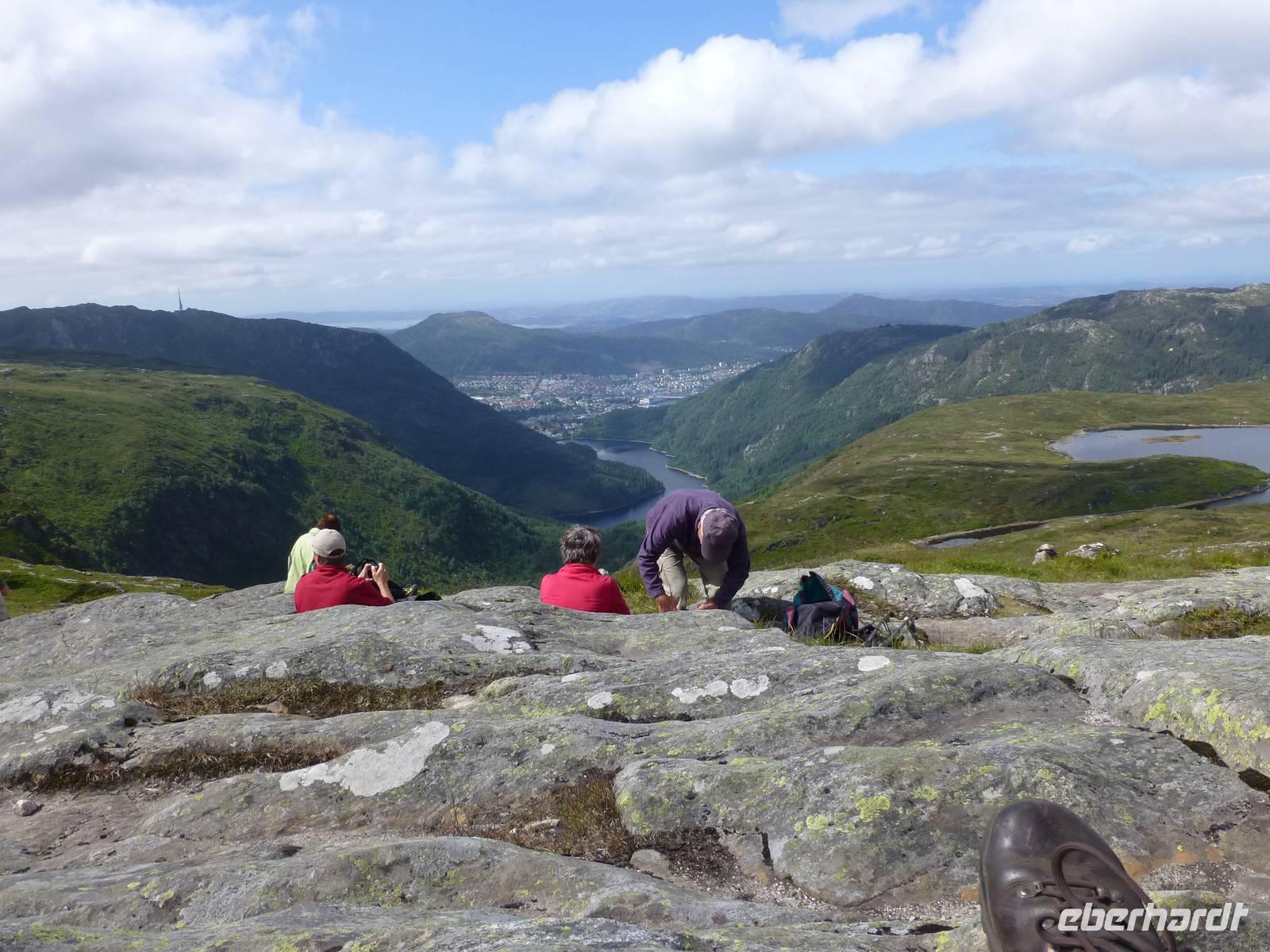 Der Tag zeigt sich schon am Morgen von seiner besten Seite. Mit unserem Bus fahren wir zur Talstation der Ulrikenbahn. Nach dem Ticketkauf geht es auch sofort hinauf auf den Ulriken. Hier haben wir, von über 600 m Höhe, einen tollen Blick auf Bergen und seine Umgebung. Wir wandern zuerst Richtung Turnerhytte, ab da kann man den Weg eigentlich zum größten Teil überblicken. Es geht leicht bergan und bergab, mal müssen wir über gröbere Steine laufen, mal durch mooriges Gelände und dann geht es wieder ganz normal dahin. Unterwegs können wir einen Halo - Lichteffekt sehen, etwas was den meisten von uns bis jetzt unbekannt war. Dabei handelt es sich um Lichteffekte der atmosphärischen Optik die durch Reflexion und Brechung von Licht an Eiskristallen entstehen. Das was wir sahen wird als 22°-Ring bezeichnet und ist die häufigste Erscheinung. Unsere Mittagspause im Sonnenschein ermöglicht uns einen weiten Blick über den See Langelivantnet und den Stausee Svartediket. Dann steigen wir etwas ab um danach wieder zum Rundemanen aufzusteigen. Nach einer Verschnaufpause geht es über die Brushytten zur Bergstation der Fløybahn hinab. Hier haben wir einen weiteren umwerfenden Blick über Bergen. Einige Gäste nutzen die Fløybahn um in die Stadt hinab zu fahren, einige andere laufen hinab und erreichen in der Nähe des Torget die Stadt. Jetzt bleibt noch Zeit die Stadt etwas auf eigene Faust zu erkunden.